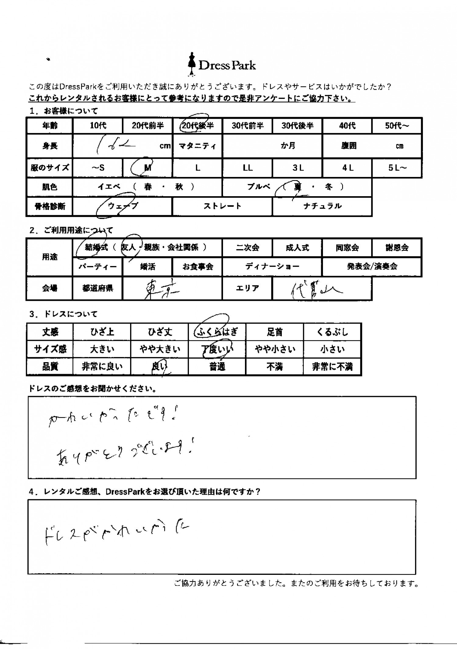 東京都 K.Y様162㎝ Mサイズ渋谷・恵比寿 #20代#M/L#160~164㎝#結婚式(友人)#東京都#渋谷・恵比寿 ◆レンタルしたドレスはこちら ◆レンタルしたサイズは:M ◆レンタルした日付:2025/12/28 ドレスの着用感 ◆点数: (4点) ◆丈感:ふくらはぎ ◆サイズ感:丁度いい ◆品質:良い ◆肌色:ブルべ ◆骨格診断:ウェーブ ドレスの感想 可愛かったです!ありがとうございます! レンタルのご感想、DressParkをお選び頂いた理由 ドレスが可愛かった CUSTOMER REVIEWS お客様の声 気になるカテゴリー別にご利用の感想をチェック! ◆AGE 年代で見る 10代 20代 30代 40代 50代~ ◆SIZE サイズで見る SS/S M/L 大きいサイズLL~ ◆HIGHT 身長で見る 140~149㎝ 150~154㎝ 155~159㎝ 160~164㎝ 165~169㎝ 170㎝以上 ◆マタニティ ~3か月 4~6か月 7~8か月 9~10か月 ◆肌色 イエベ ブルべ ◆骨格診断 ウェーブ ストレート ナチュラル ◆利用シーン 結婚式(友人) 結婚式(親族) 結婚式(会社関係) 二次会 成人式 謝恩会 パーティー その他 CUSTOMER REVIEWS都道府県別お客様の声 都道府県別にのお客様の声をチェック! 北海道 青森県 岩手県 宮城県 秋田県 山形県 福島県 茨城県 栃木県 群馬県 埼玉県 千葉県 東京都 神奈川県 新潟県 富山県 石川県 福井県 山梨県 長野県 岐阜県 静岡県 愛知県 三重県 滋賀県 京都府 大阪府 兵庫県 奈良県 和歌山県 鳥取県 島根県 岡山県 広島県 山口県 徳島県 香川県 愛媛県 高知県 福岡県 佐賀県 長崎県 熊本県 大分県 宮崎県 鹿児島県 沖縄県 CUSTOMER REVIEWSエリア別お客様の声 都道府県別にのお客様の声をチェック! 札幌 仙台 名古屋 軽井沢 金沢 神戸・芦屋 博多 那覇 梅田・新大阪 難波・心斎橋 鎌倉・湘南 横浜・みなとみらい 舞浜・浦安・幕張 大宮・浦和 青山・表参道 六本木・麻布 渋谷・恵比寿 新宿 池袋 銀座・丸の内 お台場・汐留 鹿児島市 郡山市 福島市 東予 甲府・石和 LINEでお問い合わせ このサイトではJavaScriptを使用しています