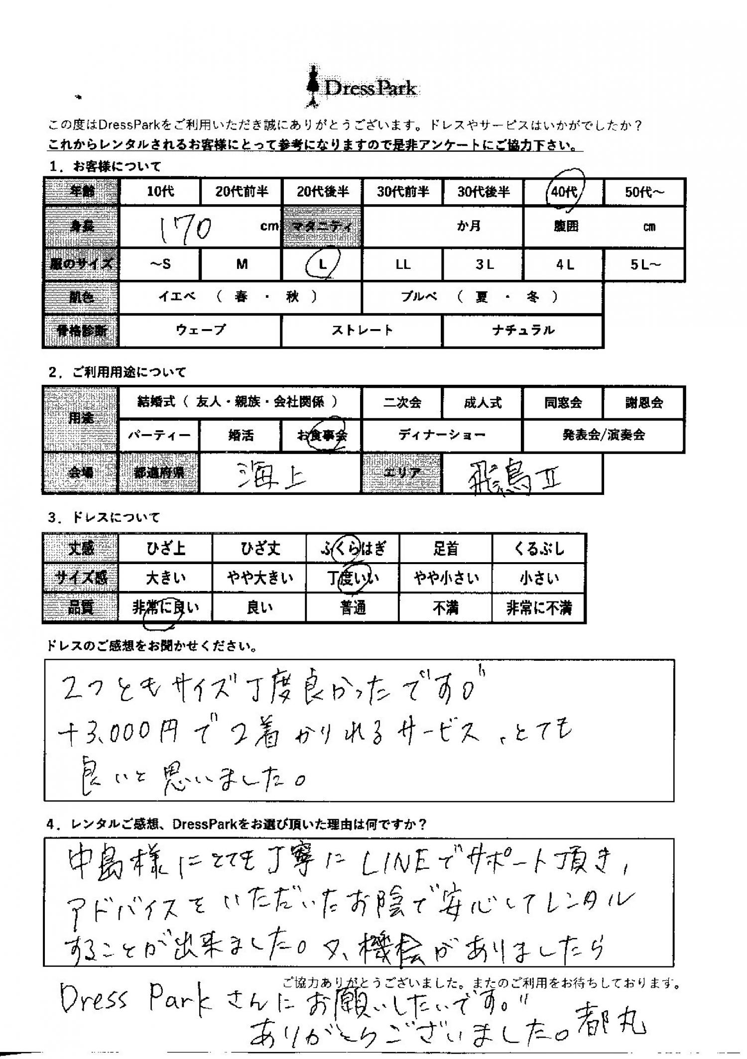 中島様にとても丁寧にLINEでサポートいただき、アドバイスをいただいたおかげで安心してレンタルすることができました。また、機会がありましたら、ドレスパークさんにお願いしたいです。ありがとうございました。