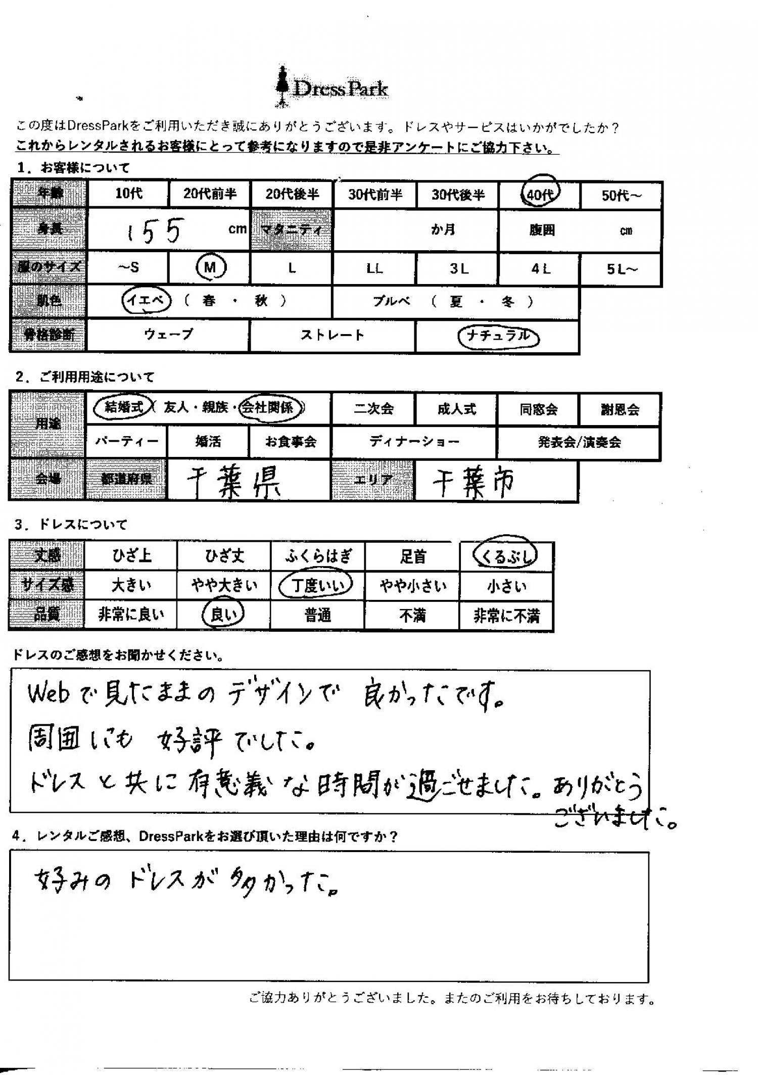 ウェブで見たままのデザインでよかったです。周囲にも好評でした。ドレスとともに有意義な時間が過ごせました。ありがとうございました。レンタルのご感想、