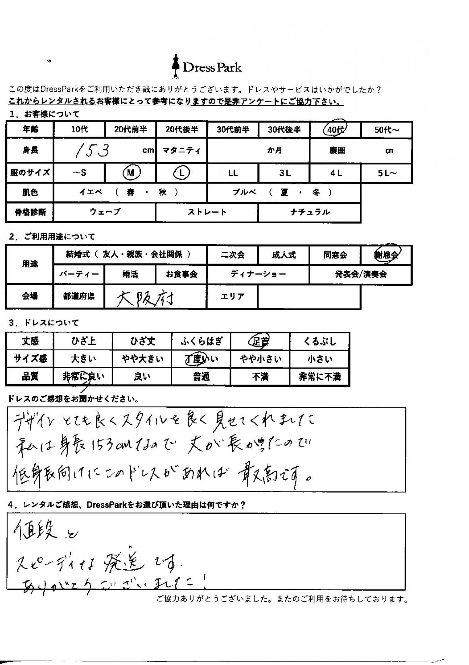 デザインとてもよくスタイルをよく見せてくれました。私は身長153cmなので、丈が長かったので、低身長向けにこのドレスがあれば最高です。レンタルのご感想、