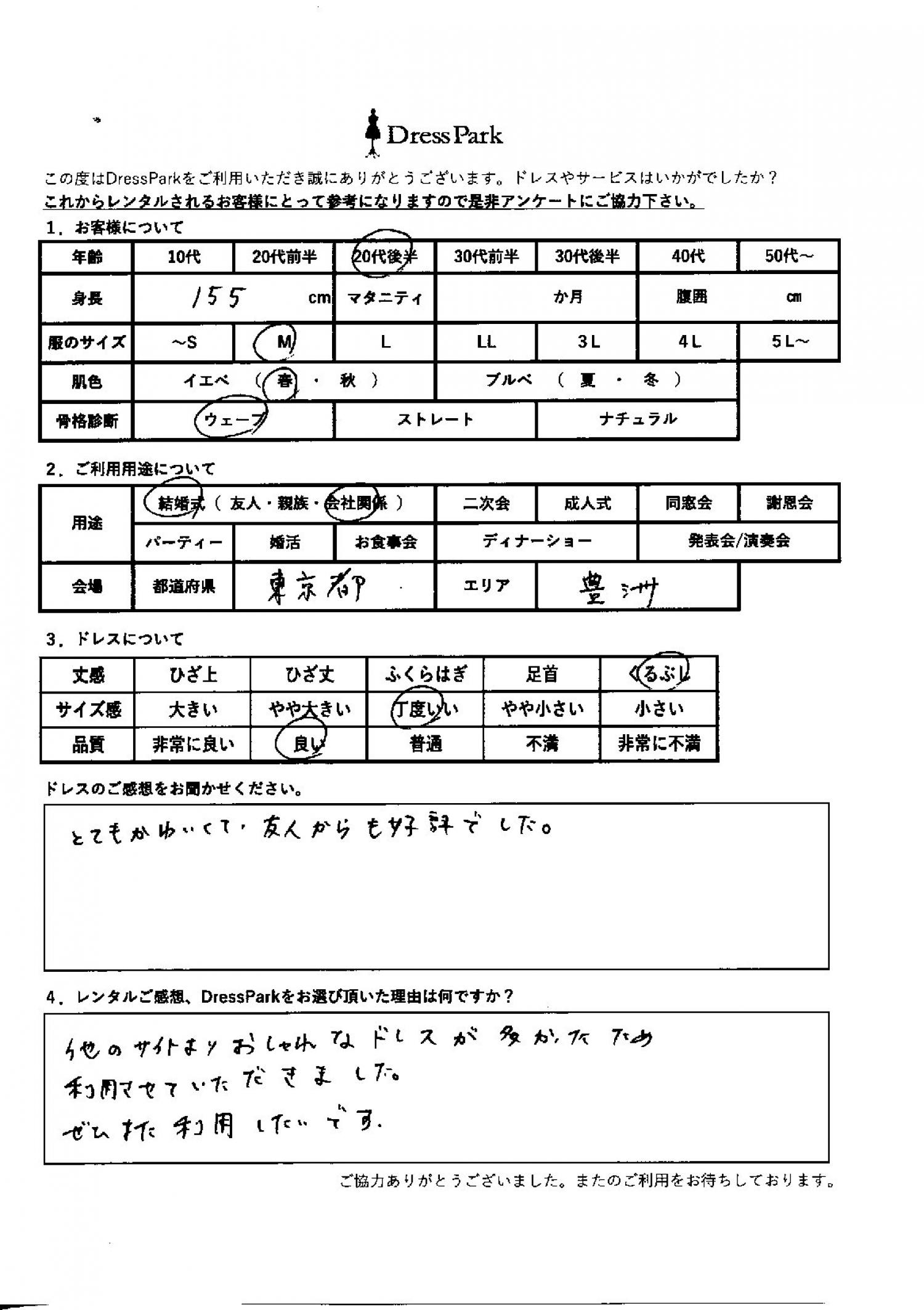 東京都 A.F様155㎝ Mサイズ #20代#M/L#155~159㎝#結婚式(会社関係)#東京都 ◆レンタルしたドレスはこちら ◆レンタルしたサイズは:M ◆レンタルした日付:2026/01/09 ドレスの着用感 ◆点数: (4点) ◆丈感:くるぶし ◆サイズ感:丁度いい ◆品質:良い ◆肌色:イエベ ◆骨格診断:ウェーブ ドレスの感想 とても可愛くて友人からも好評でした。 レンタルのご感想、DressParkをお選び頂いた理由 他のサイトよりおしゃれなドレスが多かったため、利用させていただきました。ぜひまた利用したいです。 CUSTOMER REVIEWS お客様の声 気になるカテゴリー別にご利用の感想をチェック! ◆AGE 年代で見る 10代 20代 30代 40代 50代~ ◆SIZE サイズで見る SS/S M/L 大きいサイズLL~ ◆HIGHT 身長で見る 140~149㎝ 150~154㎝ 155~159㎝ 160~164㎝ 165~169㎝ 170㎝以上 ◆マタニティ ~3か月 4~6か月 7~8か月 9~10か月 ◆肌色 イエベ ブルべ ◆骨格診断 ウェーブ ストレート ナチュラル ◆利用シーン 結婚式(友人) 結婚式(親族) 結婚式(会社関係) 二次会 成人式/同窓会 謝恩会 パーティー その他 CUSTOMER REVIEWS都道府県別お客様の声 都道府県別にのお客様の声をチェック! 北海道 青森県 岩手県 宮城県 秋田県 山形県 福島県 茨城県 栃木県 群馬県 埼玉県 千葉県 東京都 神奈川県 新潟県 富山県 石川県 福井県 山梨県 長野県 岐阜県 静岡県 愛知県 三重県 滋賀県 京都府 大阪府 兵庫県 奈良県 和歌山県 鳥取県 島根県 岡山県 広島県 山口県 徳島県 香川県 愛媛県 高知県 福岡県 佐賀県 長崎県 熊本県 大分県 宮崎県 鹿児島県 沖縄県 CUSTOMER REVIEWSエリア別お客様の声 都道府県別にのお客様の声をチェック! 札幌 仙台 名古屋 軽井沢 金沢 神戸・芦屋 博多 那覇 梅田・新大阪 難波・心斎橋 鎌倉・湘南 横浜・みなとみらい 舞浜・浦安・幕張 大宮・浦和 青山・表参道 六本木・麻布 渋谷・恵比寿 新宿 池袋 銀座・丸の内 お台場・汐留 鹿児島市 郡山市 福島市 東予 甲府・石和 LINEでお問い合わせ このサイトではJavaScriptを使用しています