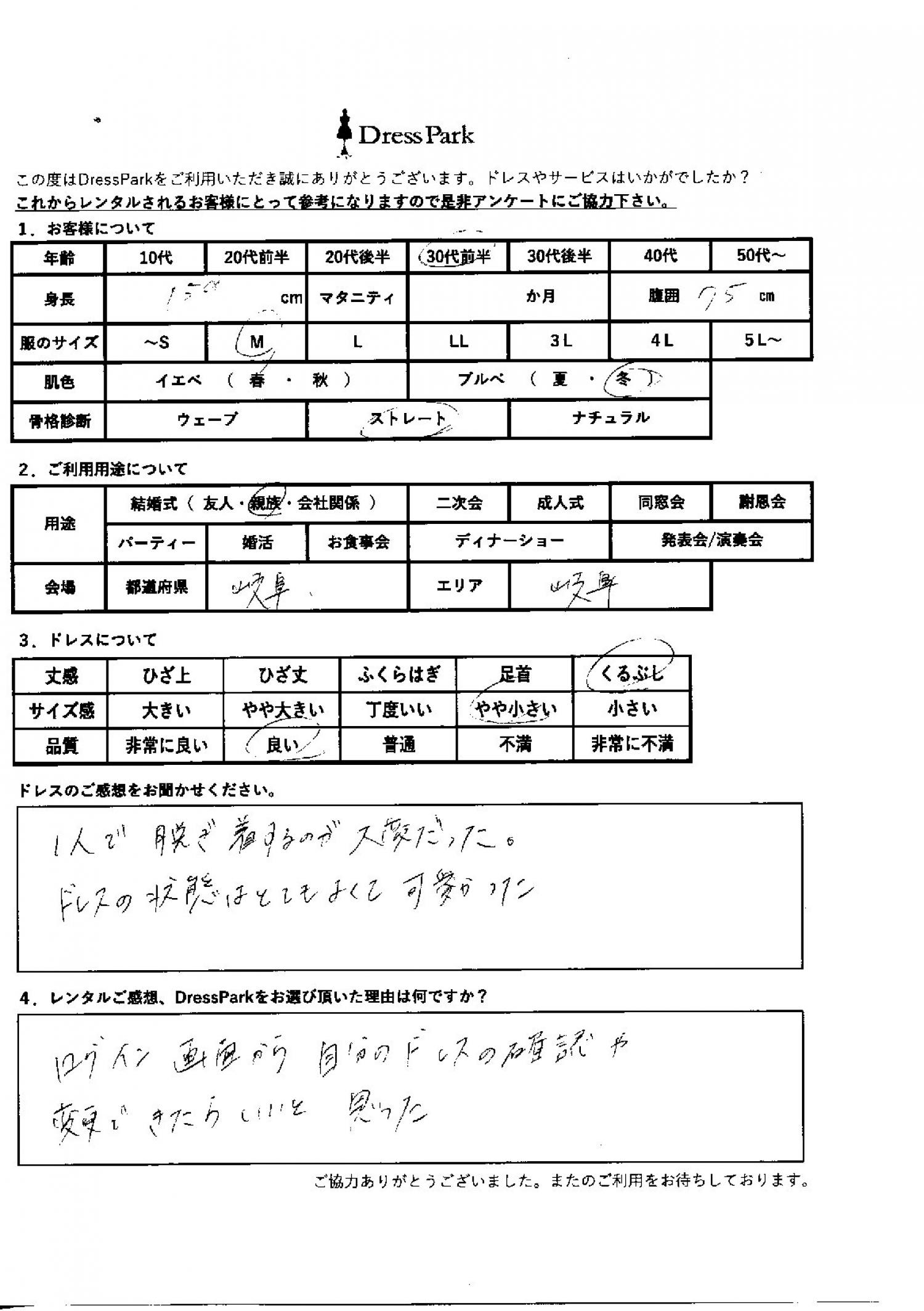 岐阜県 Y.Y様159㎝ Mサイズ #30代#M/L#155~159㎝#結婚式(親族)#岐阜県 ◆レンタルしたドレスはこちら ◆レンタルしたサイズは:M ◆レンタルした日付:2026/1/10 ドレスの着用感 ◆点数: (4点) ◆丈感:くるぶし ◆サイズ感:やや小さい ◆品質:良い ◆肌色:ブルべ ◆骨格診断:ストレート ドレスの感想 1人で脱ぎ着するのが大変だった。 ドレスの状態はとてもよくて可愛かった レンタルのご感想、DressParkをお選び頂いた理由 ログイン画面から自分のドレスの確認や変更ができたらいいと思った CUSTOMER REVIEWS お客様の声 気になるカテゴリー別にご利用の感想をチェック! ◆AGE 年代で見る 10代 20代 30代 40代 50代~ ◆SIZE サイズで見る SS/S M/L 大きいサイズLL~ ◆HIGHT 身長で見る 140~149㎝ 150~154㎝ 155~159㎝ 160~164㎝ 165~169㎝ 170㎝以上 ◆マタニティ ~3か月 4~6か月 7~8か月 9~10か月 ◆肌色 イエベ ブルべ ◆骨格診断 ウェーブ ストレート ナチュラル ◆利用シーン 結婚式(友人) 結婚式(親族) 結婚式(会社関係) 二次会 成人式/同窓会 謝恩会 パーティー その他 CUSTOMER REVIEWS都道府県別お客様の声 都道府県別にのお客様の声をチェック! 北海道 青森県 岩手県 宮城県 秋田県 山形県 福島県 茨城県 栃木県 群馬県 埼玉県 千葉県 東京都 神奈川県 新潟県 富山県 石川県 福井県 山梨県 長野県 岐阜県 静岡県 愛知県 三重県 滋賀県 京都府 大阪府 兵庫県 奈良県 和歌山県 鳥取県 島根県 岡山県 広島県 山口県 徳島県 香川県 愛媛県 高知県 福岡県 佐賀県 長崎県 熊本県 大分県 宮崎県 鹿児島県 沖縄県 CUSTOMER REVIEWSエリア別お客様の声 都道府県別にのお客様の声をチェック! 札幌 仙台 名古屋 軽井沢 金沢 神戸・芦屋 博多 那覇 梅田・新大阪 難波・心斎橋 鎌倉・湘南 横浜・みなとみらい 舞浜・浦安・幕張 大宮・浦和 青山・表参道 六本木・麻布 渋谷・恵比寿 新宿 池袋 銀座・丸の内 お台場・汐留 鹿児島市 郡山市 福島市 東予 甲府・石和 LINEでお問い合わせ このサイトではJavaScriptを使用しています