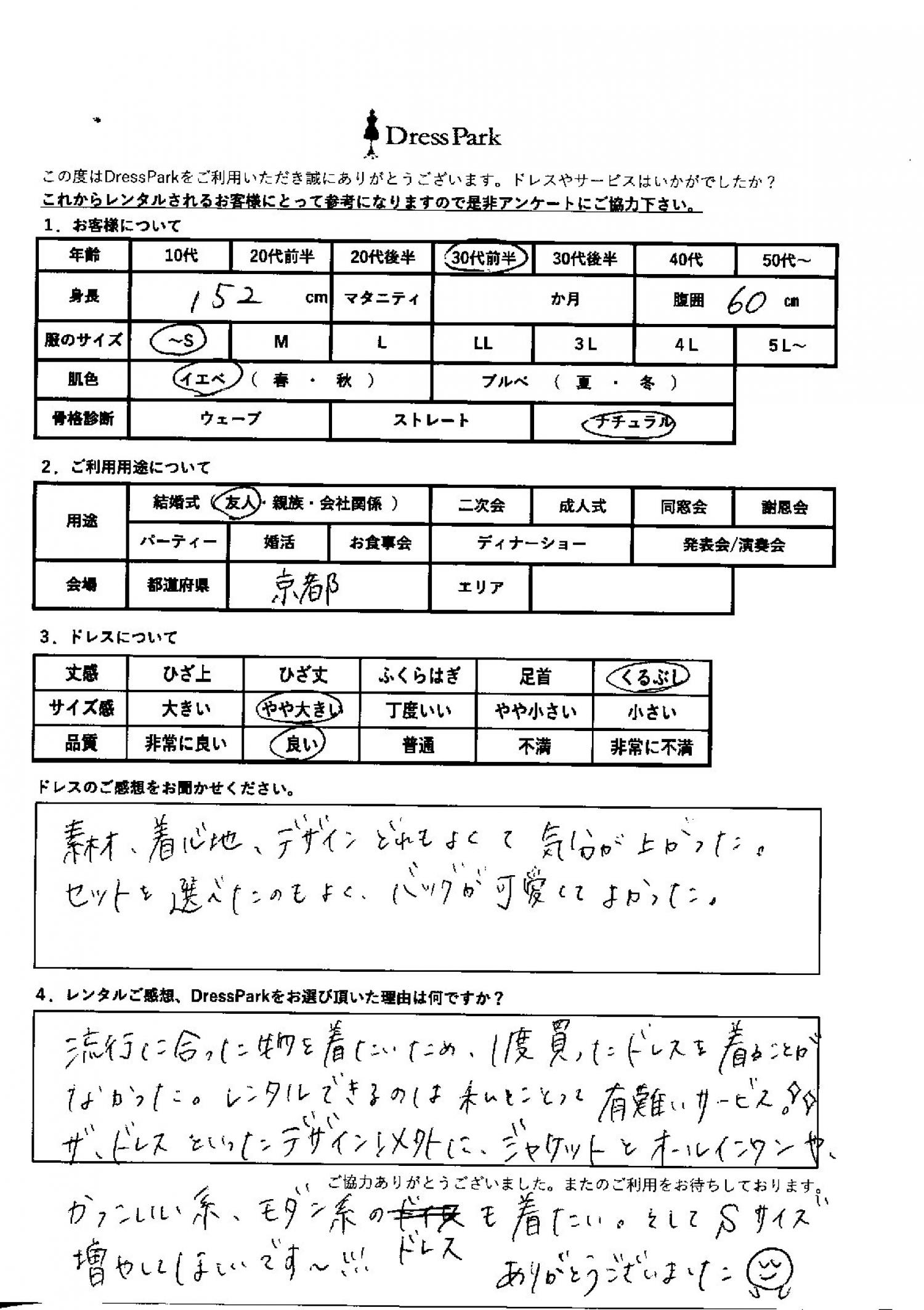 流行に合ったものを着たいため、1度買ったドレスを着ることがなかった。レンタルできるのは私にとってありがたいサービス。ザ・ドレスといったデザイン以外に、ジャケットとオールインワンやかっこいい系、モダン系のドレスも着たい。そしてSサイズ増やしてほしいです!ありがとうございました。