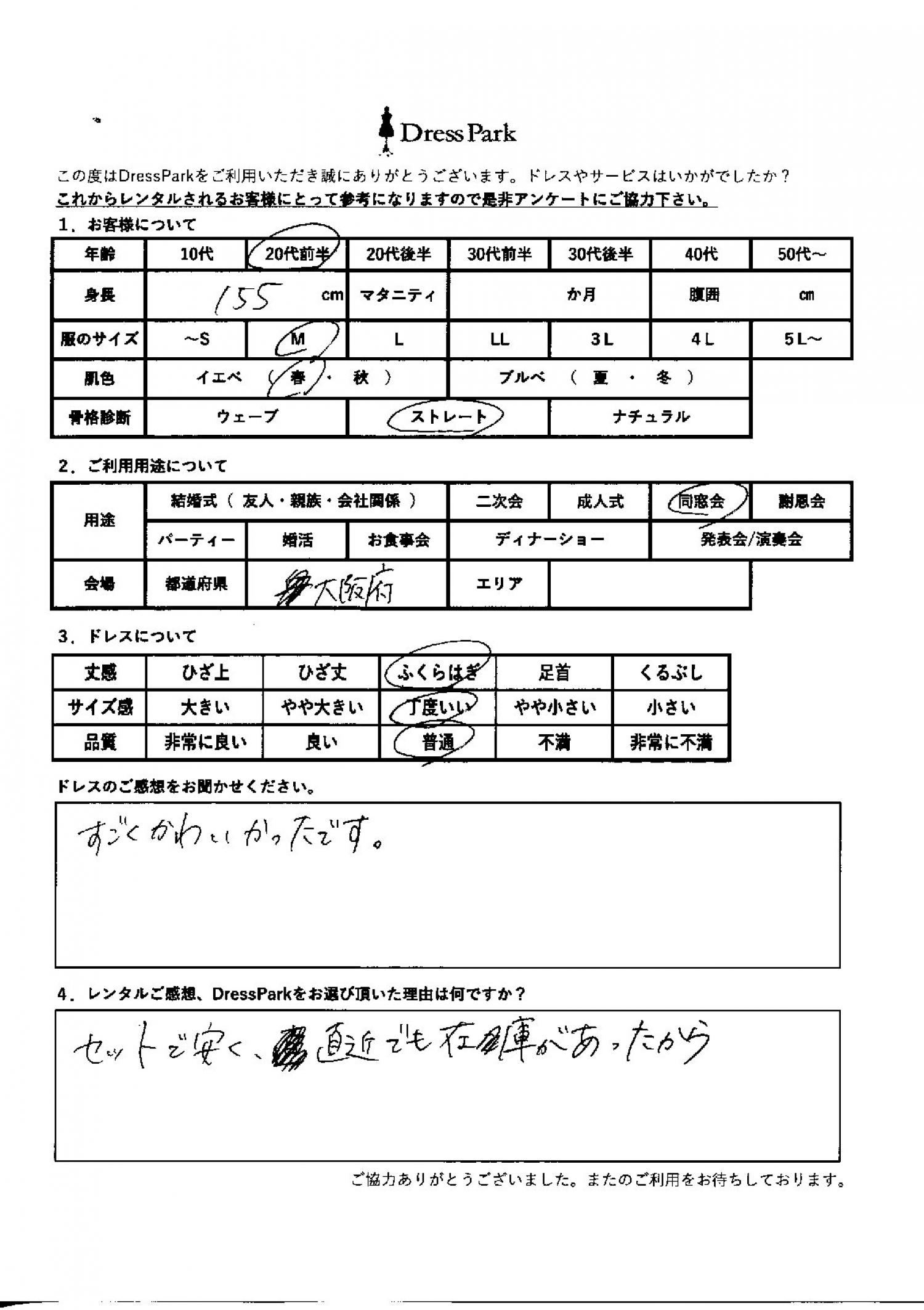 大阪府 K.S様155㎝ Mサイズ #20代#M/L#155~159㎝#成人式/同窓会#大阪府 ◆レンタルしたドレスはこちら ◆レンタルしたサイズは:M ◆レンタルした日付:2026/01/10 ドレスの着用感 ◆点数: (4点) ◆丈感:ふくらはぎ ◆サイズ感:丁度いい ◆品質:普通 ◆肌色:イエベ ◆骨格診断:ストレート ドレスの感想 すごく可愛かったです。 レンタルのご感想、DressParkをお選び頂いた理由 セットで安く直近でも在庫があったから。 CUSTOMER REVIEWS お客様の声 気になるカテゴリー別にご利用の感想をチェック! ◆AGE 年代で見る 10代 20代 30代 40代 50代~ ◆SIZE サイズで見る SS/S M/L 大きいサイズLL~ ◆HIGHT 身長で見る 140~149㎝ 150~154㎝ 155~159㎝ 160~164㎝ 165~169㎝ 170㎝以上 ◆マタニティ ~3か月 4~6か月 7~8か月 9~10か月 ◆肌色 イエベ ブルべ ◆骨格診断 ウェーブ ストレート ナチュラル ◆利用シーン 結婚式(友人) 結婚式(親族) 結婚式(会社関係) 二次会 成人式/同窓会 謝恩会 パーティー その他 CUSTOMER REVIEWS都道府県別お客様の声 都道府県別にのお客様の声をチェック! 北海道 青森県 岩手県 宮城県 秋田県 山形県 福島県 茨城県 栃木県 群馬県 埼玉県 千葉県 東京都 神奈川県 新潟県 富山県 石川県 福井県 山梨県 長野県 岐阜県 静岡県 愛知県 三重県 滋賀県 京都府 大阪府 兵庫県 奈良県 和歌山県 鳥取県 島根県 岡山県 広島県 山口県 徳島県 香川県 愛媛県 高知県 福岡県 佐賀県 長崎県 熊本県 大分県 宮崎県 鹿児島県 沖縄県 CUSTOMER REVIEWSエリア別お客様の声 都道府県別にのお客様の声をチェック! 札幌 仙台 名古屋 軽井沢 金沢 神戸・芦屋 博多 那覇 梅田・新大阪 難波・心斎橋 鎌倉・湘南 横浜・みなとみらい 舞浜・浦安・幕張 大宮・浦和 青山・表参道 六本木・麻布 渋谷・恵比寿 新宿 池袋 銀座・丸の内 お台場・汐留 鹿児島市 郡山市 福島市 東予 甲府・石和 LINEでお問い合わせ このサイトではJavaScriptを使用しています