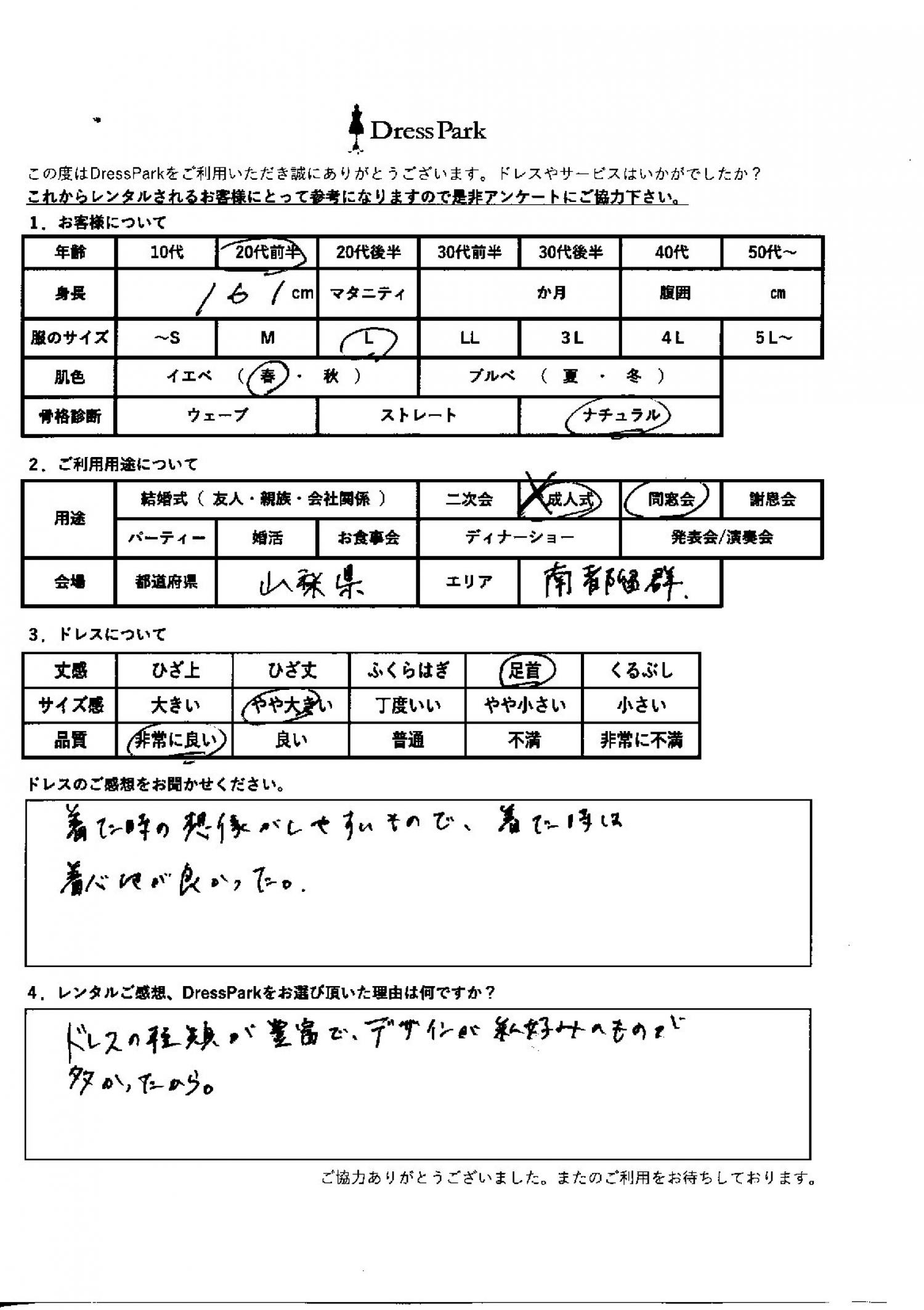 山梨県 S.T様161㎝ Lサイズ #20代#M/L#160~164㎝#成人式/同窓会#山梨県 ◆レンタルしたドレスはこちら ◆レンタルしたサイズは:L ◆レンタルした日付:2026/01/11 ドレスの着用感 ◆点数: (5点) ◆丈感:足首 ◆サイズ感:やや大きい ◆品質:非常に良い ◆肌色:イエベ ◆骨格診断:ナチュラル ドレスの感想 着たときの想像がしやすいもので、着た時は着心地が良かった。 レンタルのご感想、DressParkをお選び頂いた理由 ドレスの種類が豊富で、デザインが私好みのものが多かったから。 CUSTOMER REVIEWS お客様の声 気になるカテゴリー別にご利用の感想をチェック! ◆AGE 年代で見る 10代 20代 30代 40代 50代~ ◆SIZE サイズで見る SS/S M/L 大きいサイズLL~ ◆HIGHT 身長で見る 140~149㎝ 150~154㎝ 155~159㎝ 160~164㎝ 165~169㎝ 170㎝以上 ◆マタニティ ~3か月 4~6か月 7~8か月 9~10か月 ◆肌色 イエベ ブルべ ◆骨格診断 ウェーブ ストレート ナチュラル ◆利用シーン 結婚式(友人) 結婚式(親族) 結婚式(会社関係) 二次会 成人式/同窓会 謝恩会 パーティー その他 CUSTOMER REVIEWS都道府県別お客様の声 都道府県別にのお客様の声をチェック! 北海道 青森県 岩手県 宮城県 秋田県 山形県 福島県 茨城県 栃木県 群馬県 埼玉県 千葉県 東京都 神奈川県 新潟県 富山県 石川県 福井県 山梨県 長野県 岐阜県 静岡県 愛知県 三重県 滋賀県 京都府 大阪府 兵庫県 奈良県 和歌山県 鳥取県 島根県 岡山県 広島県 山口県 徳島県 香川県 愛媛県 高知県 福岡県 佐賀県 長崎県 熊本県 大分県 宮崎県 鹿児島県 沖縄県 CUSTOMER REVIEWSエリア別お客様の声 都道府県別にのお客様の声をチェック! 札幌 仙台 名古屋 軽井沢 金沢 神戸・芦屋 博多 那覇 梅田・新大阪 難波・心斎橋 鎌倉・湘南 横浜・みなとみらい 舞浜・浦安・幕張 大宮・浦和 青山・表参道 六本木・麻布 渋谷・恵比寿 新宿 池袋 銀座・丸の内 お台場・汐留 鹿児島市 郡山市 福島市 東予 甲府・石和 LINEでお問い合わせ このサイトではJavaScriptを使用しています