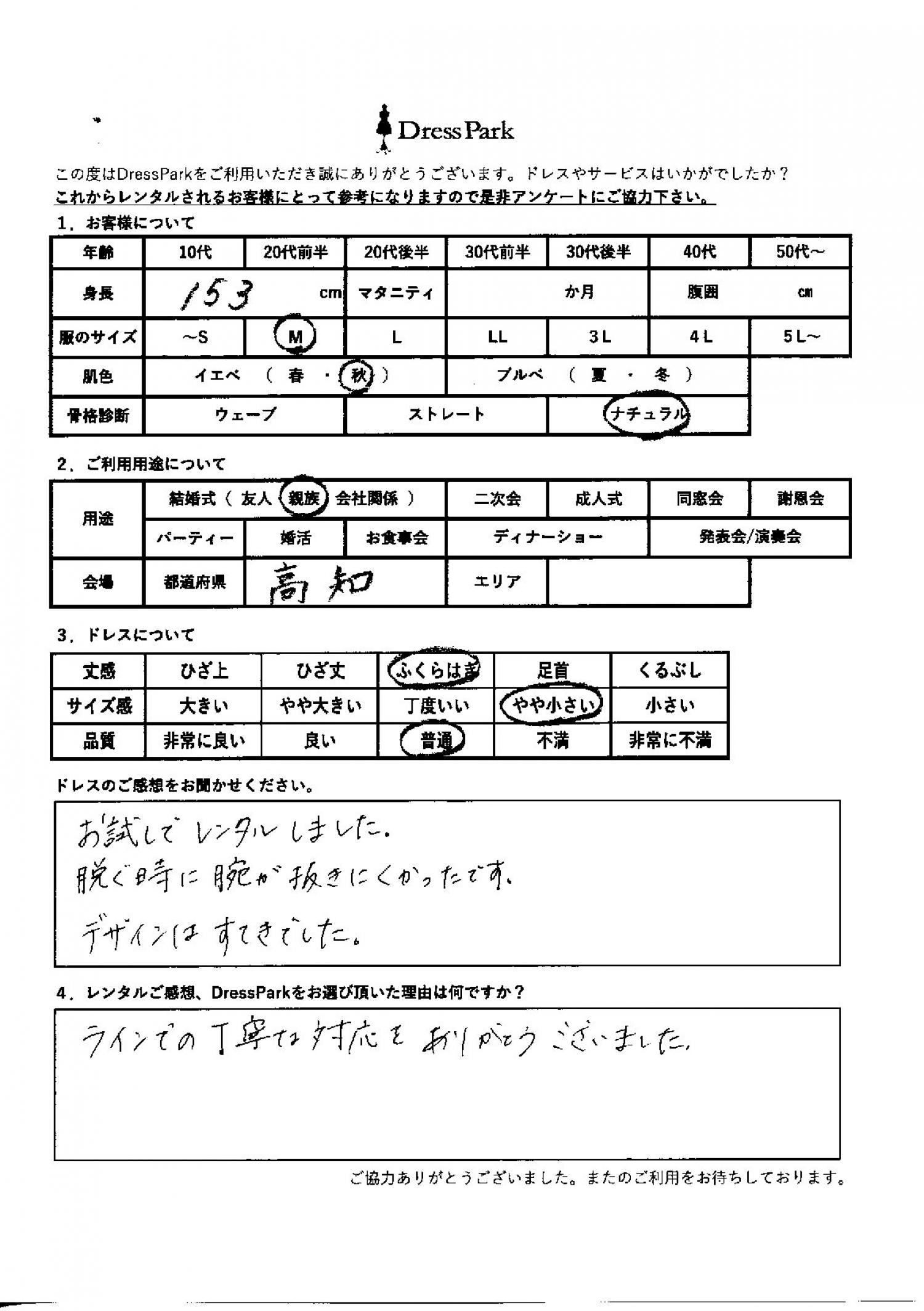 高知県 K.Y様153㎝ Mサイズ #50代~#M/L#150~154㎝#結婚式(親族)#高知県 ◆レンタルしたドレスはこちら ◆レンタルしたサイズは:M ◆レンタルした日付:2026/01/11 ドレスの着用感 ◆点数: (4点) ◆丈感:ふくらはぎ ◆サイズ感:やや小さい ◆品質:普通 ◆肌色:イエベ ◆骨格診断:ナチュラル ドレスの感想 お試しでレンタルしました。脱ぐときに腕が抜きにくかったです。デザインは素敵でした。 レンタルのご感想、DressParkをお選び頂いた理由 LINEでの丁寧な対応ありがとうございました。 CUSTOMER REVIEWS お客様の声 気になるカテゴリー別にご利用の感想をチェック! ◆AGE 年代で見る 10代 20代 30代 40代 50代~ ◆SIZE サイズで見る SS/S M/L 大きいサイズLL~ ◆HIGHT 身長で見る 140~149㎝ 150~154㎝ 155~159㎝ 160~164㎝ 165~169㎝ 170㎝以上 ◆マタニティ ~3か月 4~6か月 7~8か月 9~10か月 ◆肌色 イエベ ブルべ ◆骨格診断 ウェーブ ストレート ナチュラル ◆利用シーン 結婚式(友人) 結婚式(親族) 結婚式(会社関係) 二次会 成人式/同窓会 謝恩会 パーティー その他 CUSTOMER REVIEWS都道府県別お客様の声 都道府県別にのお客様の声をチェック! 北海道 青森県 岩手県 宮城県 秋田県 山形県 福島県 茨城県 栃木県 群馬県 埼玉県 千葉県 東京都 神奈川県 新潟県 富山県 石川県 福井県 山梨県 長野県 岐阜県 静岡県 愛知県 三重県 滋賀県 京都府 大阪府 兵庫県 奈良県 和歌山県 鳥取県 島根県 岡山県 広島県 山口県 徳島県 香川県 愛媛県 高知県 福岡県 佐賀県 長崎県 熊本県 大分県 宮崎県 鹿児島県 沖縄県 CUSTOMER REVIEWSエリア別お客様の声 都道府県別にのお客様の声をチェック! 札幌 仙台 名古屋 軽井沢 金沢 神戸・芦屋 博多 那覇 梅田・新大阪 難波・心斎橋 鎌倉・湘南 横浜・みなとみらい 舞浜・浦安・幕張 大宮・浦和 青山・表参道 六本木・麻布 渋谷・恵比寿 新宿 池袋 銀座・丸の内 お台場・汐留 鹿児島市 郡山市 福島市 東予 甲府・石和 LINEでお問い合わせ このサイトではJavaScriptを使用しています