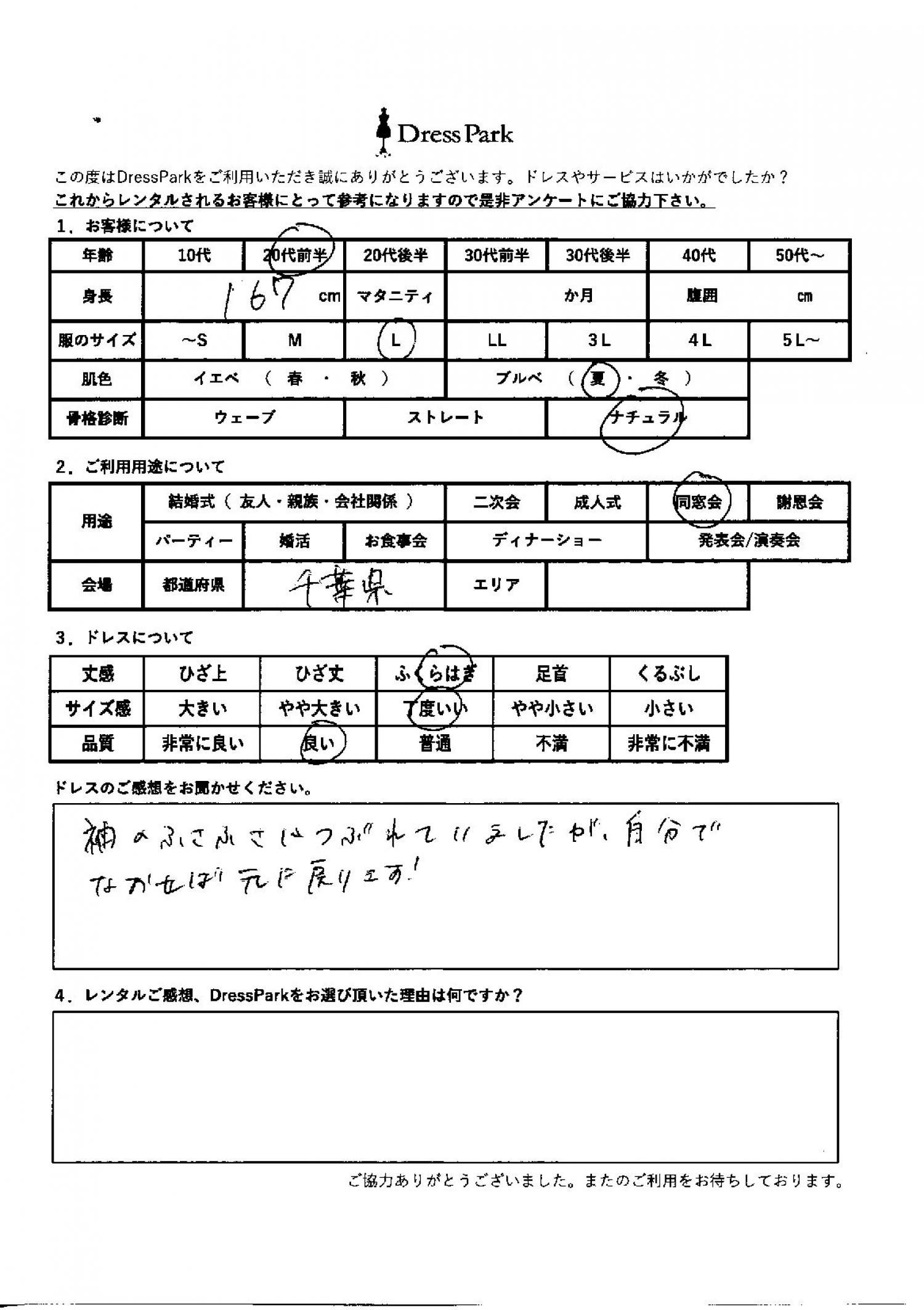 千葉県 N.T様167㎝ Lサイズ #20代#M/L#165~169㎝#成人式/同窓会#千葉県 ◆レンタルしたドレスはこちら ◆レンタルしたサイズは:L ◆レンタルした日付:2026/01/11 ドレスの着用感 ◆点数: (4点) ◆丈感:ふくらはぎ ◆サイズ感:丁度いい ◆品質:良い ◆肌色:ブルべ ◆骨格診断:ナチュラル ドレスの感想 袖のふさふさは潰れていましたが、自分で直せば元に戻ります! CUSTOMER REVIEWS お客様の声 気になるカテゴリー別にご利用の感想をチェック! ◆AGE 年代で見る 10代 20代 30代 40代 50代~ ◆SIZE サイズで見る SS/S M/L 大きいサイズLL~ ◆HIGHT 身長で見る 140~149㎝ 150~154㎝ 155~159㎝ 160~164㎝ 165~169㎝ 170㎝以上 ◆マタニティ ~3か月 4~6か月 7~8か月 9~10か月 ◆肌色 イエベ ブルべ ◆骨格診断 ウェーブ ストレート ナチュラル ◆利用シーン 結婚式(友人) 結婚式(親族) 結婚式(会社関係) 二次会 成人式/同窓会 謝恩会 パーティー その他 CUSTOMER REVIEWS都道府県別お客様の声 都道府県別にのお客様の声をチェック! 北海道 青森県 岩手県 宮城県 秋田県 山形県 福島県 茨城県 栃木県 群馬県 埼玉県 千葉県 東京都 神奈川県 新潟県 富山県 石川県 福井県 山梨県 長野県 岐阜県 静岡県 愛知県 三重県 滋賀県 京都府 大阪府 兵庫県 奈良県 和歌山県 鳥取県 島根県 岡山県 広島県 山口県 徳島県 香川県 愛媛県 高知県 福岡県 佐賀県 長崎県 熊本県 大分県 宮崎県 鹿児島県 沖縄県 CUSTOMER REVIEWSエリア別お客様の声 都道府県別にのお客様の声をチェック! 札幌 仙台 名古屋 軽井沢 金沢 神戸・芦屋 博多 那覇 梅田・新大阪 難波・心斎橋 鎌倉・湘南 横浜・みなとみらい 舞浜・浦安・幕張 大宮・浦和 青山・表参道 六本木・麻布 渋谷・恵比寿 新宿 池袋 銀座・丸の内 お台場・汐留 鹿児島市 郡山市 福島市 東予 甲府・石和 LINEでお問い合わせ このサイトではJavaScriptを使用しています