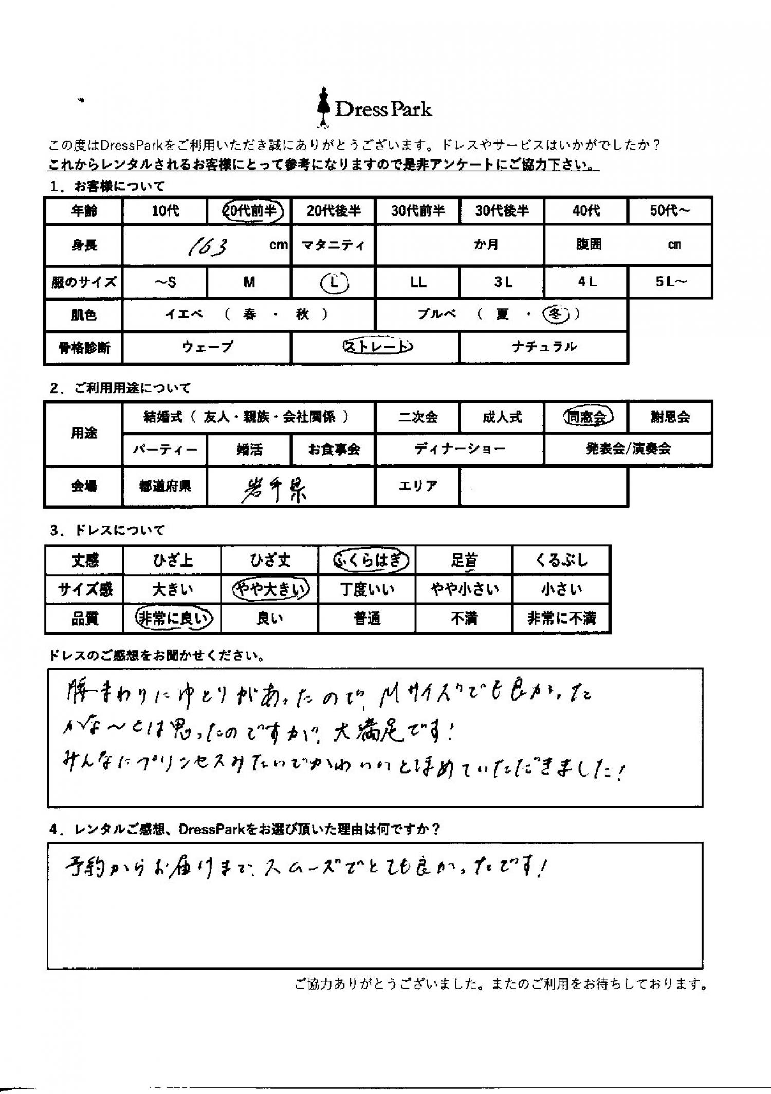 腰回りにゆとりがあったので、Mサイズでも良かったかなぁとは思ったのですが、大満足です!みんなにプリンセスみたいでかわいいと褒めていただきました!レンタルのご感想、