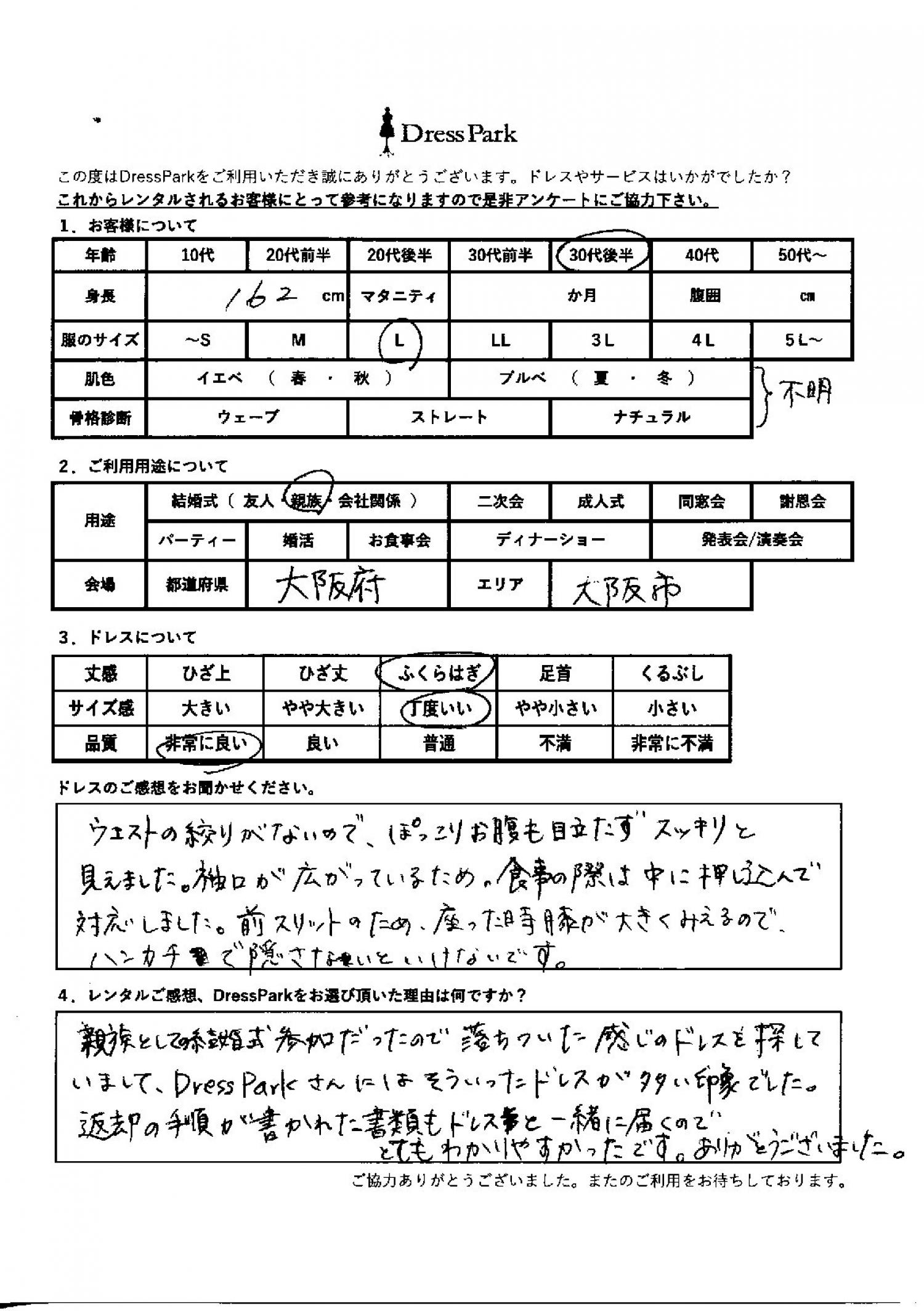 親族としての結婚式参加だったので、落ち着いた感じのドレスを探していまして、ドレスパークさんにはそういったドレスが多い印象でした。返却の手順が書かれた書類もドレスと一緒に届くので、とてもわかりやすかったです。ありがとうございました。