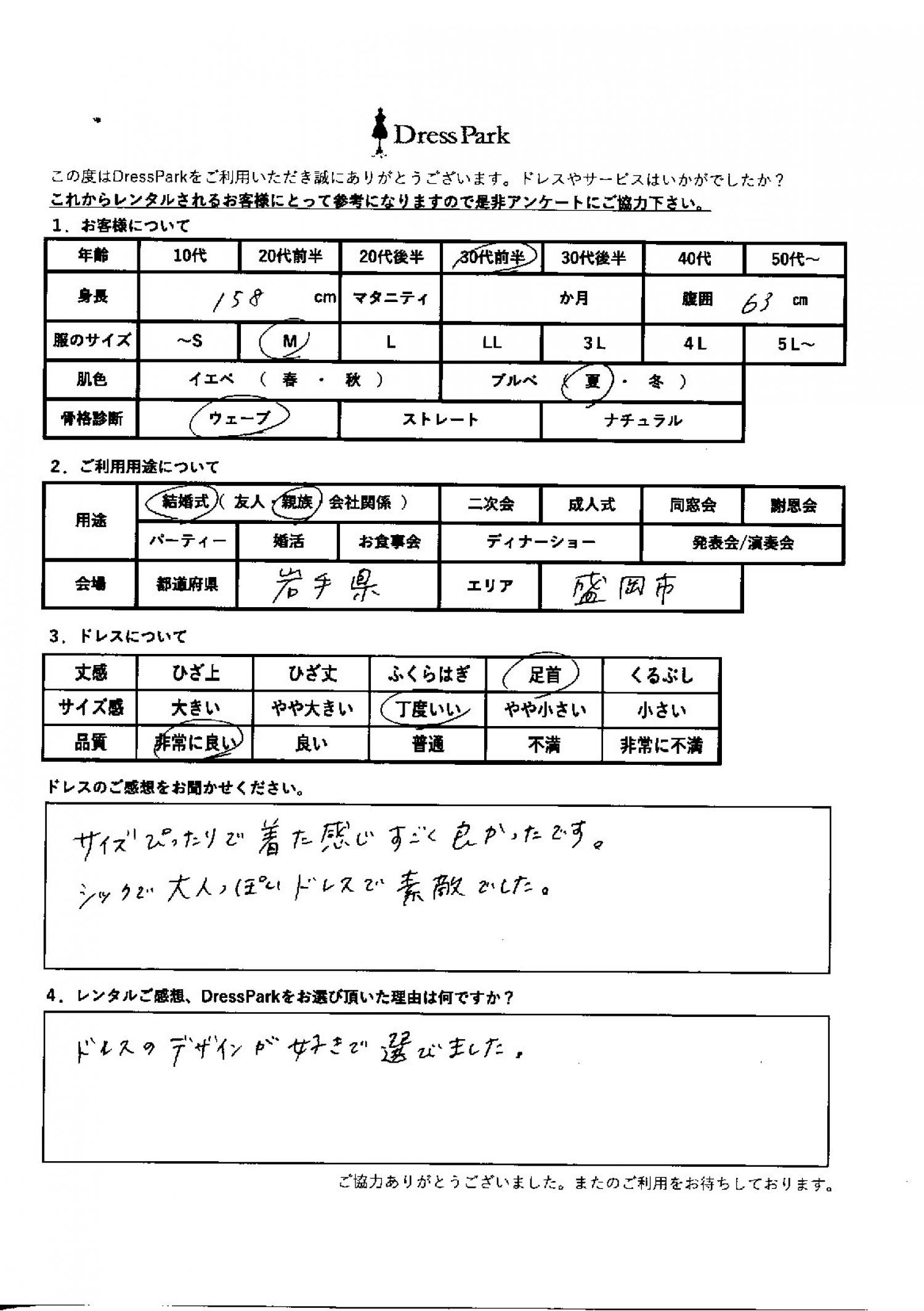 岩手県 A.S様158㎝ Mサイズ #30代#M/L#155~159㎝#結婚式(親族)#岩手県 ◆レンタルしたドレスはこちら ◆レンタルしたサイズは:M ◆レンタルした日付:2026/01/11 ドレスの着用感 ◆点数: (5点) ◆丈感:足首 ◆サイズ感:丁度いい ◆品質:非常に良い ◆肌色:ブルべ ◆骨格診断:ウェーブ ドレスの感想 サイズぴったりできた感じすごく良かったです。シックで大人っぽいドレスで素敵でした。 レンタルのご感想、DressParkをお選び頂いた理由 ドレスのデザインが好きで選びました。 CUSTOMER REVIEWS お客様の声 気になるカテゴリー別にご利用の感想をチェック! ◆AGE 年代で見る 10代 20代 30代 40代 50代~ ◆SIZE サイズで見る SS/S M/L 大きいサイズLL~ ◆HIGHT 身長で見る 140~149㎝ 150~154㎝ 155~159㎝ 160~164㎝ 165~169㎝ 170㎝以上 ◆マタニティ ~3か月 4~6か月 7~8か月 9~10か月 ◆肌色 イエベ ブルべ ◆骨格診断 ウェーブ ストレート ナチュラル ◆利用シーン 結婚式(友人) 結婚式(親族) 結婚式(会社関係) 二次会 成人式/同窓会 謝恩会 パーティー その他 CUSTOMER REVIEWS都道府県別お客様の声 都道府県別にのお客様の声をチェック! 北海道 青森県 岩手県 宮城県 秋田県 山形県 福島県 茨城県 栃木県 群馬県 埼玉県 千葉県 東京都 神奈川県 新潟県 富山県 石川県 福井県 山梨県 長野県 岐阜県 静岡県 愛知県 三重県 滋賀県 京都府 大阪府 兵庫県 奈良県 和歌山県 鳥取県 島根県 岡山県 広島県 山口県 徳島県 香川県 愛媛県 高知県 福岡県 佐賀県 長崎県 熊本県 大分県 宮崎県 鹿児島県 沖縄県 CUSTOMER REVIEWSエリア別お客様の声 都道府県別にのお客様の声をチェック! 札幌 仙台 名古屋 軽井沢 金沢 神戸・芦屋 博多 那覇 梅田・新大阪 難波・心斎橋 鎌倉・湘南 横浜・みなとみらい 舞浜・浦安・幕張 大宮・浦和 青山・表参道 六本木・麻布 渋谷・恵比寿 新宿 池袋 銀座・丸の内 お台場・汐留 鹿児島市 郡山市 福島市 東予 甲府・石和 LINEでお問い合わせ このサイトではJavaScriptを使用しています