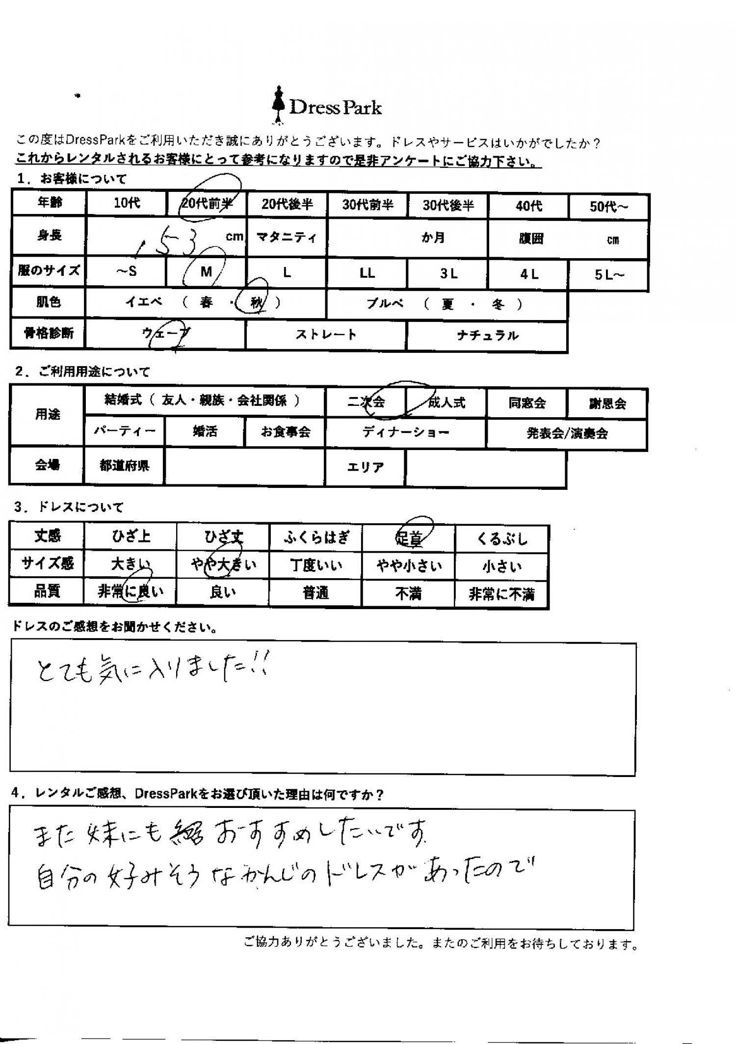 愛知県 M.I様153㎝ Mサイズ #20代#M/L#150~154㎝#成人式/同窓会#愛知県 ◆レンタルしたドレスはこちら ◆レンタルしたサイズは:M ◆レンタルした日付:2026/01/11 ドレスの着用感 ◆点数: (5点) ◆丈感:足首 ◆サイズ感:やや大きい ◆品質:非常に良い ◆肌色:イエベ ◆骨格診断:ウェーブ ドレスの感想 とても気に入りました! レンタルのご感想、DressParkをお選び頂いた理由 また妹にもお勧めしたいです。自分の好みそうな感じのドレスがあったので。 CUSTOMER REVIEWS お客様の声 気になるカテゴリー別にご利用の感想をチェック! ◆AGE 年代で見る 10代 20代 30代 40代 50代~ ◆SIZE サイズで見る SS/S M/L 大きいサイズLL~ ◆HIGHT 身長で見る 140~149㎝ 150~154㎝ 155~159㎝ 160~164㎝ 165~169㎝ 170㎝以上 ◆マタニティ ~3か月 4~6か月 7~8か月 9~10か月 ◆肌色 イエベ ブルべ ◆骨格診断 ウェーブ ストレート ナチュラル ◆利用シーン 結婚式(友人) 結婚式(親族) 結婚式(会社関係) 二次会 成人式/同窓会 謝恩会 パーティー その他 CUSTOMER REVIEWS都道府県別お客様の声 都道府県別にのお客様の声をチェック! 北海道 青森県 岩手県 宮城県 秋田県 山形県 福島県 茨城県 栃木県 群馬県 埼玉県 千葉県 東京都 神奈川県 新潟県 富山県 石川県 福井県 山梨県 長野県 岐阜県 静岡県 愛知県 三重県 滋賀県 京都府 大阪府 兵庫県 奈良県 和歌山県 鳥取県 島根県 岡山県 広島県 山口県 徳島県 香川県 愛媛県 高知県 福岡県 佐賀県 長崎県 熊本県 大分県 宮崎県 鹿児島県 沖縄県 CUSTOMER REVIEWSエリア別お客様の声 都道府県別にのお客様の声をチェック! 札幌 仙台 名古屋 軽井沢 金沢 神戸・芦屋 博多 那覇 梅田・新大阪 難波・心斎橋 鎌倉・湘南 横浜・みなとみらい 舞浜・浦安・幕張 大宮・浦和 青山・表参道 六本木・麻布 渋谷・恵比寿 新宿 池袋 銀座・丸の内 お台場・汐留 鹿児島市 郡山市 福島市 東予 甲府・石和 LINEでお問い合わせ このサイトではJavaScriptを使用しています