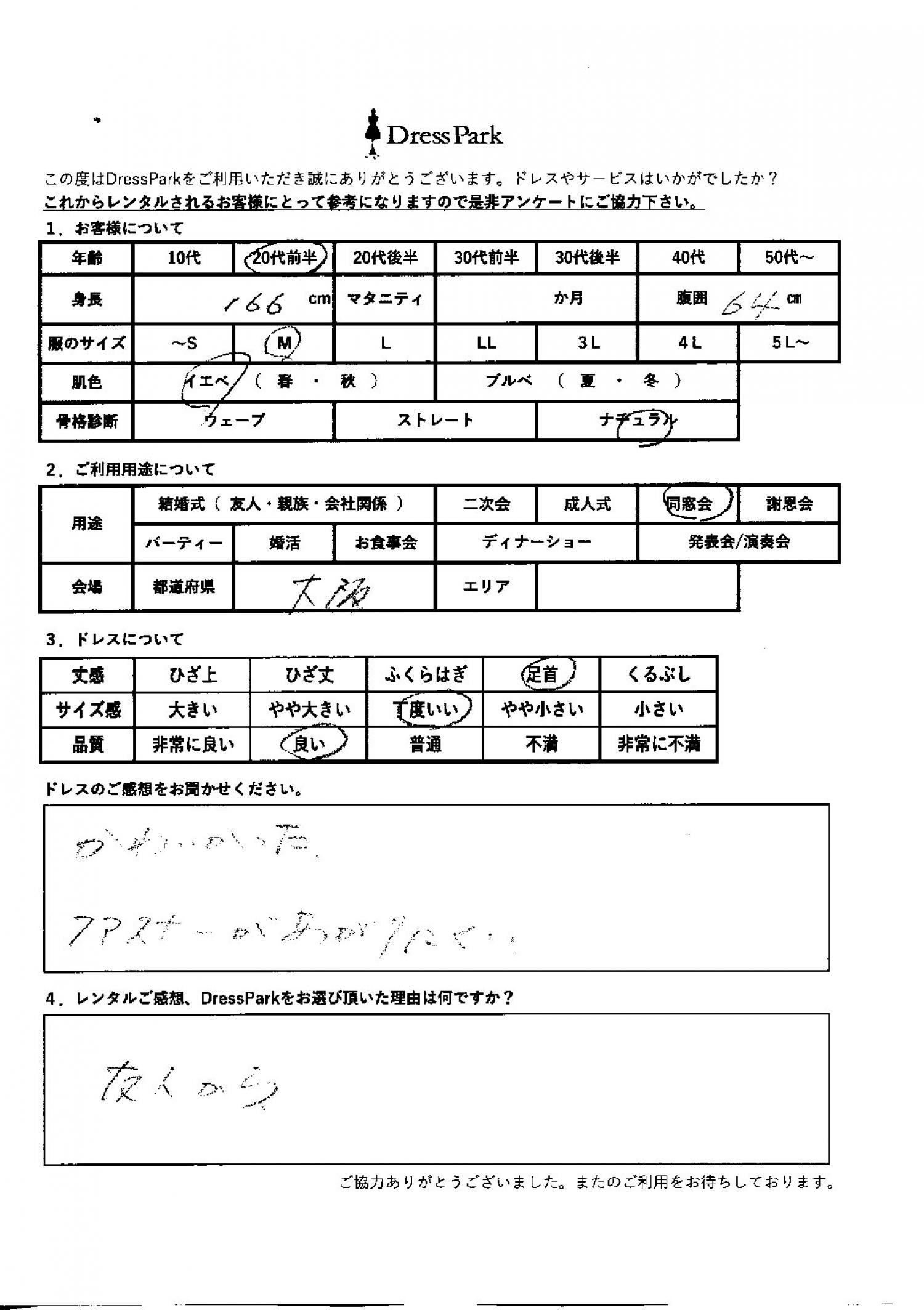 大阪府 S.T様166㎝ Mサイズ #20代#M/L#165~169㎝#成人式/同窓会#大阪府 ◆レンタルしたドレスはこちら ◆レンタルしたサイズは:M ◆レンタルした日付:2026/01/11 ドレスの着用感 ◆点数: (4点) ◆丈感:足首 ◆サイズ感:丁度いい ◆品質:良い ◆肌色:イエベ ◆骨格診断:ナチュラル ドレスの感想 可愛かった。ファスナーが上がりにくい。 レンタルのご感想、DressParkをお選び頂いた理由 友人から CUSTOMER REVIEWS お客様の声 気になるカテゴリー別にご利用の感想をチェック! ◆AGE 年代で見る 10代 20代 30代 40代 50代~ ◆SIZE サイズで見る SS/S M/L 大きいサイズLL~ ◆HIGHT 身長で見る 140~149㎝ 150~154㎝ 155~159㎝ 160~164㎝ 165~169㎝ 170㎝以上 ◆マタニティ ~3か月 4~6か月 7~8か月 9~10か月 ◆肌色 イエベ ブルべ ◆骨格診断 ウェーブ ストレート ナチュラル ◆利用シーン 結婚式(友人) 結婚式(親族) 結婚式(会社関係) 二次会 成人式/同窓会 謝恩会 パーティー その他 CUSTOMER REVIEWS都道府県別お客様の声 都道府県別にのお客様の声をチェック! 北海道 青森県 岩手県 宮城県 秋田県 山形県 福島県 茨城県 栃木県 群馬県 埼玉県 千葉県 東京都 神奈川県 新潟県 富山県 石川県 福井県 山梨県 長野県 岐阜県 静岡県 愛知県 三重県 滋賀県 京都府 大阪府 兵庫県 奈良県 和歌山県 鳥取県 島根県 岡山県 広島県 山口県 徳島県 香川県 愛媛県 高知県 福岡県 佐賀県 長崎県 熊本県 大分県 宮崎県 鹿児島県 沖縄県 CUSTOMER REVIEWSエリア別お客様の声 都道府県別にのお客様の声をチェック! 札幌 仙台 名古屋 軽井沢 金沢 神戸・芦屋 博多 那覇 梅田・新大阪 難波・心斎橋 鎌倉・湘南 横浜・みなとみらい 舞浜・浦安・幕張 大宮・浦和 青山・表参道 六本木・麻布 渋谷・恵比寿 新宿 池袋 銀座・丸の内 お台場・汐留 鹿児島市 郡山市 福島市 東予 甲府・石和 LINEでお問い合わせ このサイトではJavaScriptを使用しています