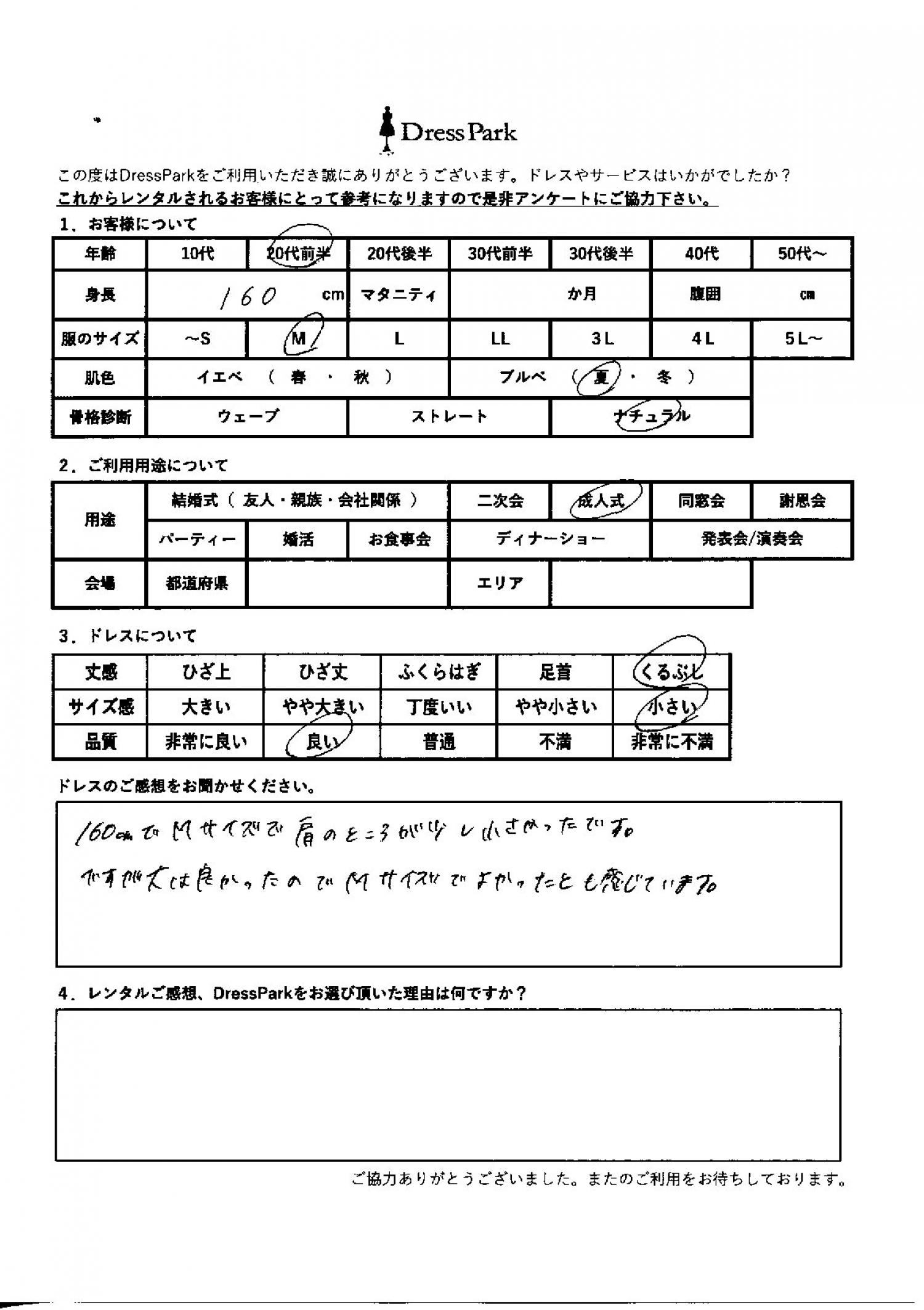 愛知県 R.H様160㎝ Mサイズ #20代#M/L#160~164㎝#成人式/同窓会#愛知県 ◆レンタルしたドレスはこちら ◆レンタルしたサイズは:M ◆レンタルした日付:2026/01/11 ドレスの着用感 ◆点数: (4点) ◆丈感:くるぶし ◆サイズ感:小さい ◆品質:良い ◆肌色:ブルべ ◆骨格診断:ナチュラル ドレスの感想 160cmでMサイズで肩のところが少し小さかったです。ですが、丈は良かったので、Mサイズで良かったとも感じています。 CUSTOMER REVIEWS お客様の声 気になるカテゴリー別にご利用の感想をチェック! ◆AGE 年代で見る 10代 20代 30代 40代 50代~ ◆SIZE サイズで見る SS/S M/L 大きいサイズLL~ ◆HIGHT 身長で見る 140~149㎝ 150~154㎝ 155~159㎝ 160~164㎝ 165~169㎝ 170㎝以上 ◆マタニティ ~3か月 4~6か月 7~8か月 9~10か月 ◆肌色 イエベ ブルべ ◆骨格診断 ウェーブ ストレート ナチュラル ◆利用シーン 結婚式(友人) 結婚式(親族) 結婚式(会社関係) 二次会 成人式/同窓会 謝恩会 パーティー その他 CUSTOMER REVIEWS都道府県別お客様の声 都道府県別にのお客様の声をチェック! 北海道 青森県 岩手県 宮城県 秋田県 山形県 福島県 茨城県 栃木県 群馬県 埼玉県 千葉県 東京都 神奈川県 新潟県 富山県 石川県 福井県 山梨県 長野県 岐阜県 静岡県 愛知県 三重県 滋賀県 京都府 大阪府 兵庫県 奈良県 和歌山県 鳥取県 島根県 岡山県 広島県 山口県 徳島県 香川県 愛媛県 高知県 福岡県 佐賀県 長崎県 熊本県 大分県 宮崎県 鹿児島県 沖縄県 CUSTOMER REVIEWSエリア別お客様の声 都道府県別にのお客様の声をチェック! 札幌 仙台 名古屋 軽井沢 金沢 神戸・芦屋 博多 那覇 梅田・新大阪 難波・心斎橋 鎌倉・湘南 横浜・みなとみらい 舞浜・浦安・幕張 大宮・浦和 青山・表参道 六本木・麻布 渋谷・恵比寿 新宿 池袋 銀座・丸の内 お台場・汐留 鹿児島市 郡山市 福島市 東予 甲府・石和 LINEでお問い合わせ このサイトではJavaScriptを使用しています