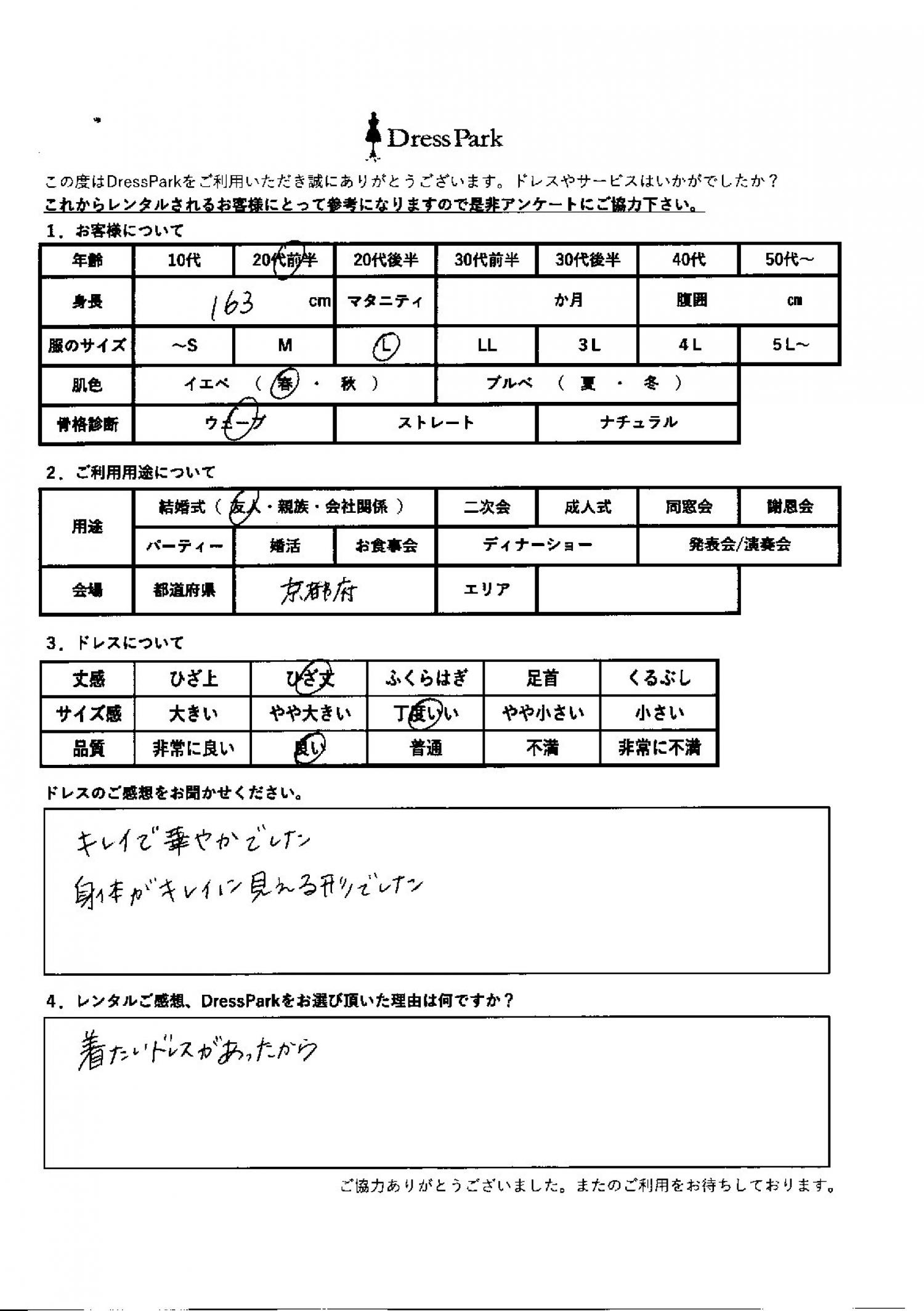 京都府 M.O様163㎝ Lサイズ #20代#M/L#160~164㎝#結婚式(友人)#京都府 ◆レンタルしたドレスはこちら ◆レンタルしたサイズは:L ◆レンタルした日付:2026/01/11 ドレスの着用感 ◆点数: (4点) ◆丈感:ひざ丈 ◆サイズ感:丁度いい ◆品質:良い ◆肌色:イエベ ◆骨格診断:ウェーブ ドレスの感想 綺麗で華やかでした。身体が綺麗に見える形でした。 レンタルのご感想、DressParkをお選び頂いた理由 着たいドレスがあったから。 CUSTOMER REVIEWS お客様の声 気になるカテゴリー別にご利用の感想をチェック! ◆AGE 年代で見る 10代 20代 30代 40代 50代~ ◆SIZE サイズで見る SS/S M/L 大きいサイズLL~ ◆HIGHT 身長で見る 140~149㎝ 150~154㎝ 155~159㎝ 160~164㎝ 165~169㎝ 170㎝以上 ◆マタニティ ~3か月 4~6か月 7~8か月 9~10か月 ◆肌色 イエベ ブルべ ◆骨格診断 ウェーブ ストレート ナチュラル ◆利用シーン 結婚式(友人) 結婚式(親族) 結婚式(会社関係) 二次会 成人式/同窓会 謝恩会 パーティー その他 CUSTOMER REVIEWS都道府県別お客様の声 都道府県別にのお客様の声をチェック! 北海道 青森県 岩手県 宮城県 秋田県 山形県 福島県 茨城県 栃木県 群馬県 埼玉県 千葉県 東京都 神奈川県 新潟県 富山県 石川県 福井県 山梨県 長野県 岐阜県 静岡県 愛知県 三重県 滋賀県 京都府 大阪府 兵庫県 奈良県 和歌山県 鳥取県 島根県 岡山県 広島県 山口県 徳島県 香川県 愛媛県 高知県 福岡県 佐賀県 長崎県 熊本県 大分県 宮崎県 鹿児島県 沖縄県 CUSTOMER REVIEWSエリア別お客様の声 都道府県別にのお客様の声をチェック! 札幌 仙台 名古屋 軽井沢 金沢 神戸・芦屋 博多 那覇 梅田・新大阪 難波・心斎橋 鎌倉・湘南 横浜・みなとみらい 舞浜・浦安・幕張 大宮・浦和 青山・表参道 六本木・麻布 渋谷・恵比寿 新宿 池袋 銀座・丸の内 お台場・汐留 鹿児島市 郡山市 福島市 東予 甲府・石和 LINEでお問い合わせ このサイトではJavaScriptを使用しています