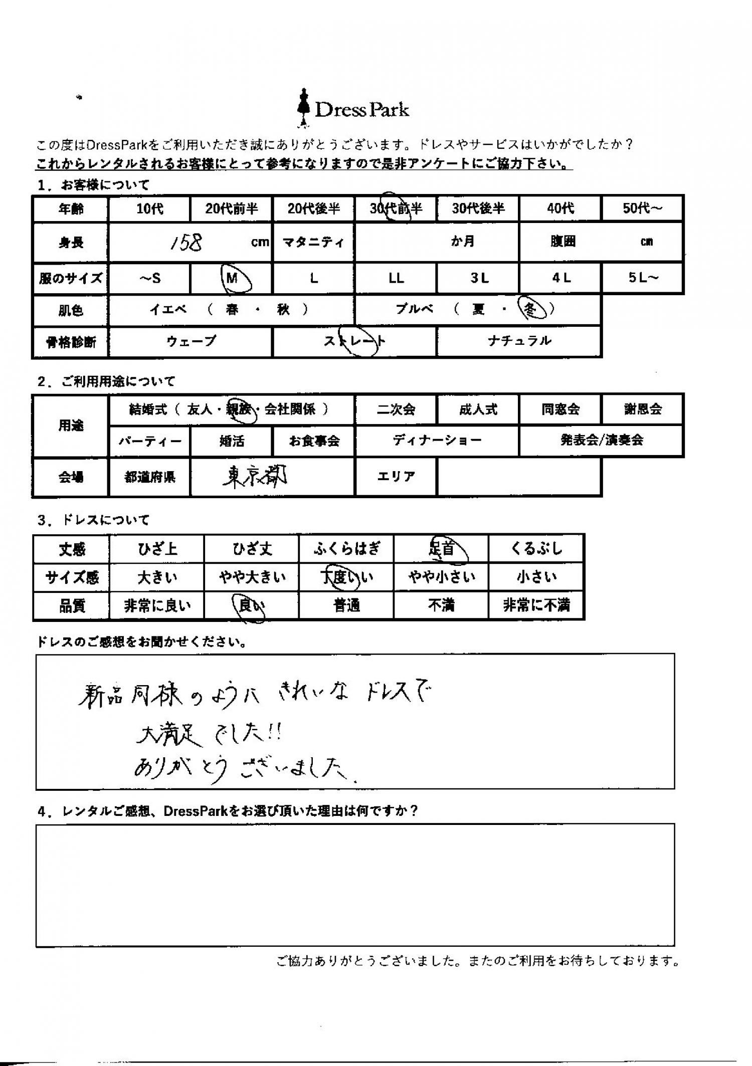 東京都 A.W様158㎝ Mサイズ #30代#M/L#155~159㎝#結婚式(親族)#東京都 ◆レンタルしたドレスはこちら ◆レンタルしたサイズは:M ◆レンタルした日付:2026/01/11 ドレスの着用感 ◆点数: (5点) ◆丈感:足首 ◆サイズ感:丁度いい ◆品質:良い ◆肌色:ブルべ ◆骨格診断:ストレート ドレスの感想 新品同様のように、きれいなドレスで大満足でした!ありがとうございました。 CUSTOMER REVIEWS お客様の声 気になるカテゴリー別にご利用の感想をチェック! ◆AGE 年代で見る 10代 20代 30代 40代 50代~ ◆SIZE サイズで見る SS/S M/L 大きいサイズLL~ ◆HIGHT 身長で見る 140~149㎝ 150~154㎝ 155~159㎝ 160~164㎝ 165~169㎝ 170㎝以上 ◆マタニティ ~3か月 4~6か月 7~8か月 9~10か月 ◆肌色 イエベ ブルべ ◆骨格診断 ウェーブ ストレート ナチュラル ◆利用シーン 結婚式(友人) 結婚式(親族) 結婚式(会社関係) 二次会 成人式/同窓会 謝恩会 パーティー その他 CUSTOMER REVIEWS都道府県別お客様の声 都道府県別にのお客様の声をチェック! 北海道 青森県 岩手県 宮城県 秋田県 山形県 福島県 茨城県 栃木県 群馬県 埼玉県 千葉県 東京都 神奈川県 新潟県 富山県 石川県 福井県 山梨県 長野県 岐阜県 静岡県 愛知県 三重県 滋賀県 京都府 大阪府 兵庫県 奈良県 和歌山県 鳥取県 島根県 岡山県 広島県 山口県 徳島県 香川県 愛媛県 高知県 福岡県 佐賀県 長崎県 熊本県 大分県 宮崎県 鹿児島県 沖縄県 CUSTOMER REVIEWSエリア別お客様の声 都道府県別にのお客様の声をチェック! 札幌 仙台 名古屋 軽井沢 金沢 神戸・芦屋 博多 那覇 梅田・新大阪 難波・心斎橋 鎌倉・湘南 横浜・みなとみらい 舞浜・浦安・幕張 大宮・浦和 青山・表参道 六本木・麻布 渋谷・恵比寿 新宿 池袋 銀座・丸の内 お台場・汐留 鹿児島市 郡山市 福島市 東予 甲府・石和 LINEでお問い合わせ このサイトではJavaScriptを使用しています