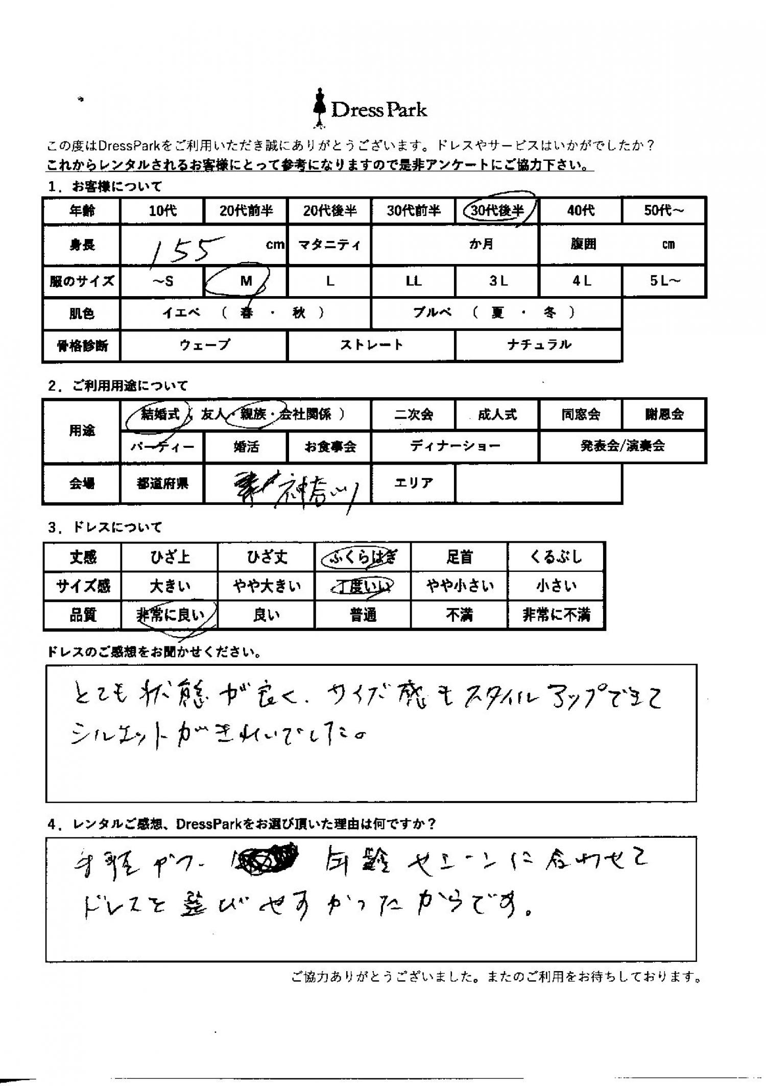 神奈川県 S.I様155㎝ Mサイズ #30代#M/L#155~159㎝#結婚式(親族)#神奈川県 ◆レンタルしたドレスはこちら ◆レンタルしたサイズは:M ◆レンタルした日付:2026/01/10 ドレスの着用感 ◆点数: (5点) ◆丈感:ふくらはぎ ◆サイズ感:丁度いい ◆品質:非常に良い ドレスの感想 とても状態が良く、サイズ感もスタイルアップできてシルエットが綺麗でした。 レンタルのご感想、DressParkをお選び頂いた理由 手軽かつ年齢やシーンに合わせてドレスを選びやすかったからです。 CUSTOMER REVIEWS お客様の声 気になるカテゴリー別にご利用の感想をチェック! ◆AGE 年代で見る 10代 20代 30代 40代 50代~ ◆SIZE サイズで見る SS/S M/L 大きいサイズLL~ ◆HIGHT 身長で見る 140~149㎝ 150~154㎝ 155~159㎝ 160~164㎝ 165~169㎝ 170㎝以上 ◆マタニティ ~3か月 4~6か月 7~8か月 9~10か月 ◆肌色 イエベ ブルべ ◆骨格診断 ウェーブ ストレート ナチュラル ◆利用シーン 結婚式(友人) 結婚式(親族) 結婚式(会社関係) 二次会 成人式/同窓会 謝恩会 パーティー その他 CUSTOMER REVIEWS都道府県別お客様の声 都道府県別にのお客様の声をチェック! 北海道 青森県 岩手県 宮城県 秋田県 山形県 福島県 茨城県 栃木県 群馬県 埼玉県 千葉県 東京都 神奈川県 新潟県 富山県 石川県 福井県 山梨県 長野県 岐阜県 静岡県 愛知県 三重県 滋賀県 京都府 大阪府 兵庫県 奈良県 和歌山県 鳥取県 島根県 岡山県 広島県 山口県 徳島県 香川県 愛媛県 高知県 福岡県 佐賀県 長崎県 熊本県 大分県 宮崎県 鹿児島県 沖縄県 CUSTOMER REVIEWSエリア別お客様の声 都道府県別にのお客様の声をチェック! 札幌 仙台 名古屋 軽井沢 金沢 神戸・芦屋 博多 那覇 梅田・新大阪 難波・心斎橋 鎌倉・湘南 横浜・みなとみらい 舞浜・浦安・幕張 大宮・浦和 青山・表参道 六本木・麻布 渋谷・恵比寿 新宿 池袋 銀座・丸の内 お台場・汐留 鹿児島市 郡山市 福島市 東予 甲府・石和 LINEでお問い合わせ このサイトではJavaScriptを使用しています