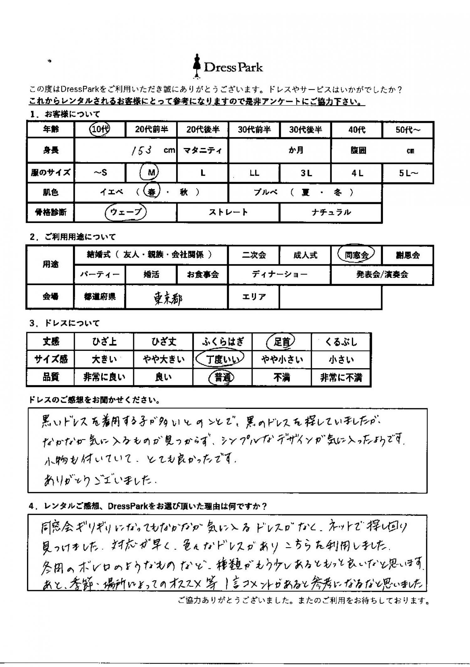 同窓会ギリギリになっても、なかなか気に入るドレスがなく、ネットで探し回り見つけました。対応が早くいろいろなドレスがあり、こちらを利用しました。冬用のボレロのようなものなど、種類がもう少しあるともっと良いなと思います。あと、季節・場所によってのオススメと一言コメントがあると参考になるなと思いました。