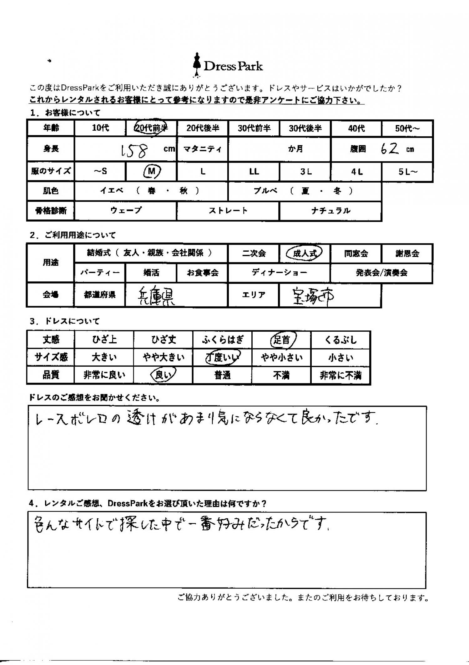 兵庫県 H.M様158㎝ Mサイズ #20代#M/L#155~159㎝#成人式/同窓会#兵庫県 ◆レンタルしたドレスはこちら ◆レンタルしたサイズは:M ◆レンタルした日付:2026/01/12 ドレスの着用感 ◆点数: (4点) ◆丈感:足首 ◆サイズ感:丁度いい ◆品質:良い ドレスの感想 レースボレロの透けがあまり気にならなくてよかったです。 レンタルのご感想、DressParkをお選び頂いた理由 いろんなサイトで探した中で1番好みだったからです。いろんなサイトで探した中で1番好みだったからです。 CUSTOMER REVIEWS お客様の声 気になるカテゴリー別にご利用の感想をチェック! ◆AGE 年代で見る 10代 20代 30代 40代 50代~ ◆SIZE サイズで見る SS/S M/L 大きいサイズLL~ ◆HIGHT 身長で見る 140~149㎝ 150~154㎝ 155~159㎝ 160~164㎝ 165~169㎝ 170㎝以上 ◆マタニティ ~3か月 4~6か月 7~8か月 9~10か月 ◆肌色 イエベ ブルべ ◆骨格診断 ウェーブ ストレート ナチュラル ◆利用シーン 結婚式(友人) 結婚式(親族) 結婚式(会社関係) 二次会 成人式/同窓会 謝恩会 パーティー その他 CUSTOMER REVIEWS都道府県別お客様の声 都道府県別にのお客様の声をチェック! 北海道 青森県 岩手県 宮城県 秋田県 山形県 福島県 茨城県 栃木県 群馬県 埼玉県 千葉県 東京都 神奈川県 新潟県 富山県 石川県 福井県 山梨県 長野県 岐阜県 静岡県 愛知県 三重県 滋賀県 京都府 大阪府 兵庫県 奈良県 和歌山県 鳥取県 島根県 岡山県 広島県 山口県 徳島県 香川県 愛媛県 高知県 福岡県 佐賀県 長崎県 熊本県 大分県 宮崎県 鹿児島県 沖縄県 CUSTOMER REVIEWSエリア別お客様の声 都道府県別にのお客様の声をチェック! 札幌 仙台 名古屋 軽井沢 金沢 神戸・芦屋 博多 那覇 梅田・新大阪 難波・心斎橋 鎌倉・湘南 横浜・みなとみらい 舞浜・浦安・幕張 大宮・浦和 青山・表参道 六本木・麻布 渋谷・恵比寿 新宿 池袋 銀座・丸の内 お台場・汐留 鹿児島市 郡山市 福島市 東予 甲府・石和 LINEでお問い合わせ このサイトではJavaScriptを使用しています