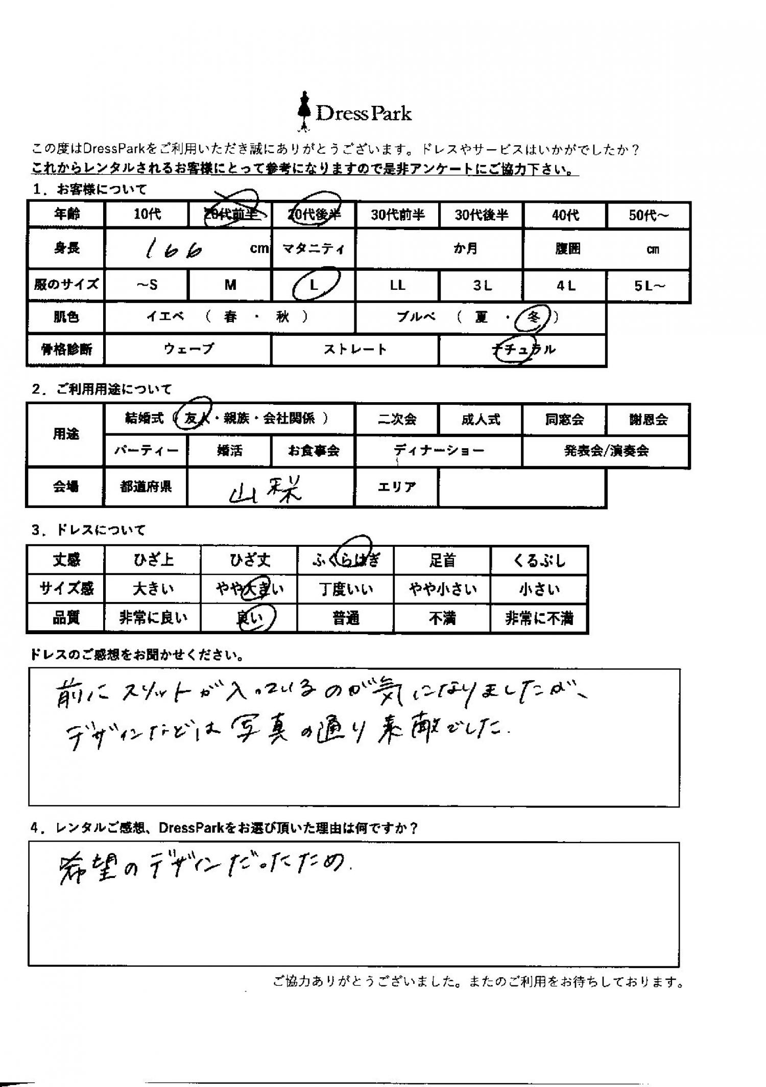 山梨県 M.K様166㎝ Lサイズ #20代#M/L#165~169㎝#結婚式(友人)#山梨県 ◆レンタルしたドレスはこちら ◆レンタルしたサイズは:L ◆レンタルした日付:2026/01/17 ドレスの着用感 ◆点数: (4点) ◆丈感:ふくらはぎ ◆サイズ感:やや大きい ◆品質:良い ◆肌色:ブルべ ◆骨格診断:ナチュラル ドレスの感想 前にスリットが入っているのが気になりましたが、デザインなどは写真の通り素敵でした。 レンタルのご感想、DressParkをお選び頂いた理由 希望のデザインだったため CUSTOMER REVIEWS お客様の声 気になるカテゴリー別にご利用の感想をチェック! ◆AGE 年代で見る 10代 20代 30代 40代 50代~ ◆SIZE サイズで見る SS/S M/L 大きいサイズLL~ ◆HIGHT 身長で見る 140~149㎝ 150~154㎝ 155~159㎝ 160~164㎝ 165~169㎝ 170㎝以上 ◆マタニティ ~3か月 4~6か月 7~8か月 9~10か月 ◆肌色 イエベ ブルべ ◆骨格診断 ウェーブ ストレート ナチュラル ◆利用シーン 結婚式(友人) 結婚式(親族) 結婚式(会社関係) 二次会 成人式/同窓会 謝恩会 パーティー その他 CUSTOMER REVIEWS都道府県別お客様の声 都道府県別にのお客様の声をチェック! 北海道 青森県 岩手県 宮城県 秋田県 山形県 福島県 茨城県 栃木県 群馬県 埼玉県 千葉県 東京都 神奈川県 新潟県 富山県 石川県 福井県 山梨県 長野県 岐阜県 静岡県 愛知県 三重県 滋賀県 京都府 大阪府 兵庫県 奈良県 和歌山県 鳥取県 島根県 岡山県 広島県 山口県 徳島県 香川県 愛媛県 高知県 福岡県 佐賀県 長崎県 熊本県 大分県 宮崎県 鹿児島県 沖縄県 CUSTOMER REVIEWSエリア別お客様の声 都道府県別にのお客様の声をチェック! 札幌 仙台 名古屋 軽井沢 金沢 神戸・芦屋 博多 那覇 梅田・新大阪 難波・心斎橋 鎌倉・湘南 横浜・みなとみらい 舞浜・浦安・幕張 大宮・浦和 青山・表参道 六本木・麻布 渋谷・恵比寿 新宿 池袋 銀座・丸の内 お台場・汐留 鹿児島市 郡山市 福島市 東予 甲府・石和 LINEでお問い合わせ このサイトではJavaScriptを使用しています
