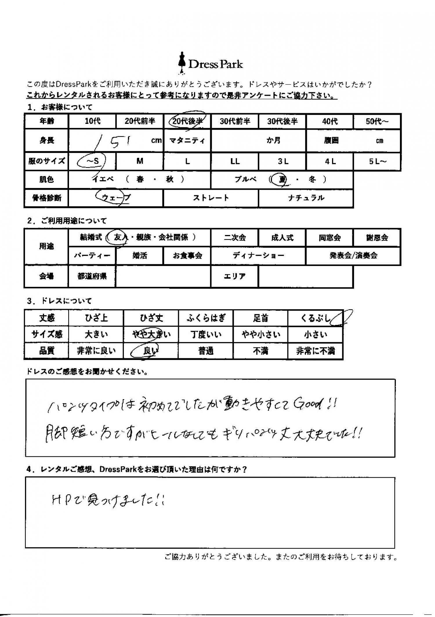 埼玉県 A.T様151㎝ ~Sサイズ #20代#SS/S#150~154㎝#結婚式(友人)#埼玉県 ◆レンタルしたドレスはこちら ◆レンタルしたサイズは:S ◆レンタルした日付:2026/01/17 ドレスの着用感 ◆点数: (4点) ◆丈感:くるぶし ◆サイズ感:やや大きい ◆品質:良い ◆肌色:ブルべ ◆骨格診断:ウェーブ ドレスの感想 パンツタイプは初めてでしたが、動きやすくてGOOD!足短い方ですが、ヒールなしでもギリパンツ大丈夫でした! レンタルのご感想、DressParkをお選び頂いた理由 ホームページで見つけました! CUSTOMER REVIEWS お客様の声 気になるカテゴリー別にご利用の感想をチェック! ◆AGE 年代で見る 10代 20代 30代 40代 50代~ ◆SIZE サイズで見る SS/S M/L 大きいサイズLL~ ◆HIGHT 身長で見る 140~149㎝ 150~154㎝ 155~159㎝ 160~164㎝ 165~169㎝ 170㎝以上 ◆マタニティ ~3か月 4~6か月 7~8か月 9~10か月 ◆肌色 イエベ ブルべ ◆骨格診断 ウェーブ ストレート ナチュラル ◆利用シーン 結婚式(友人) 結婚式(親族) 結婚式(会社関係) 二次会 成人式/同窓会 謝恩会 パーティー その他 CUSTOMER REVIEWS都道府県別お客様の声 都道府県別にのお客様の声をチェック! 北海道 青森県 岩手県 宮城県 秋田県 山形県 福島県 茨城県 栃木県 群馬県 埼玉県 千葉県 東京都 神奈川県 新潟県 富山県 石川県 福井県 山梨県 長野県 岐阜県 静岡県 愛知県 三重県 滋賀県 京都府 大阪府 兵庫県 奈良県 和歌山県 鳥取県 島根県 岡山県 広島県 山口県 徳島県 香川県 愛媛県 高知県 福岡県 佐賀県 長崎県 熊本県 大分県 宮崎県 鹿児島県 沖縄県 CUSTOMER REVIEWSエリア別お客様の声 都道府県別にのお客様の声をチェック! 札幌 仙台 名古屋 軽井沢 金沢 神戸・芦屋 博多 那覇 梅田・新大阪 難波・心斎橋 鎌倉・湘南 横浜・みなとみらい 舞浜・浦安・幕張 大宮・浦和 青山・表参道 六本木・麻布 渋谷・恵比寿 新宿 池袋 銀座・丸の内 お台場・汐留 鹿児島市 郡山市 福島市 東予 甲府・石和 LINEでお問い合わせ このサイトではJavaScriptを使用しています