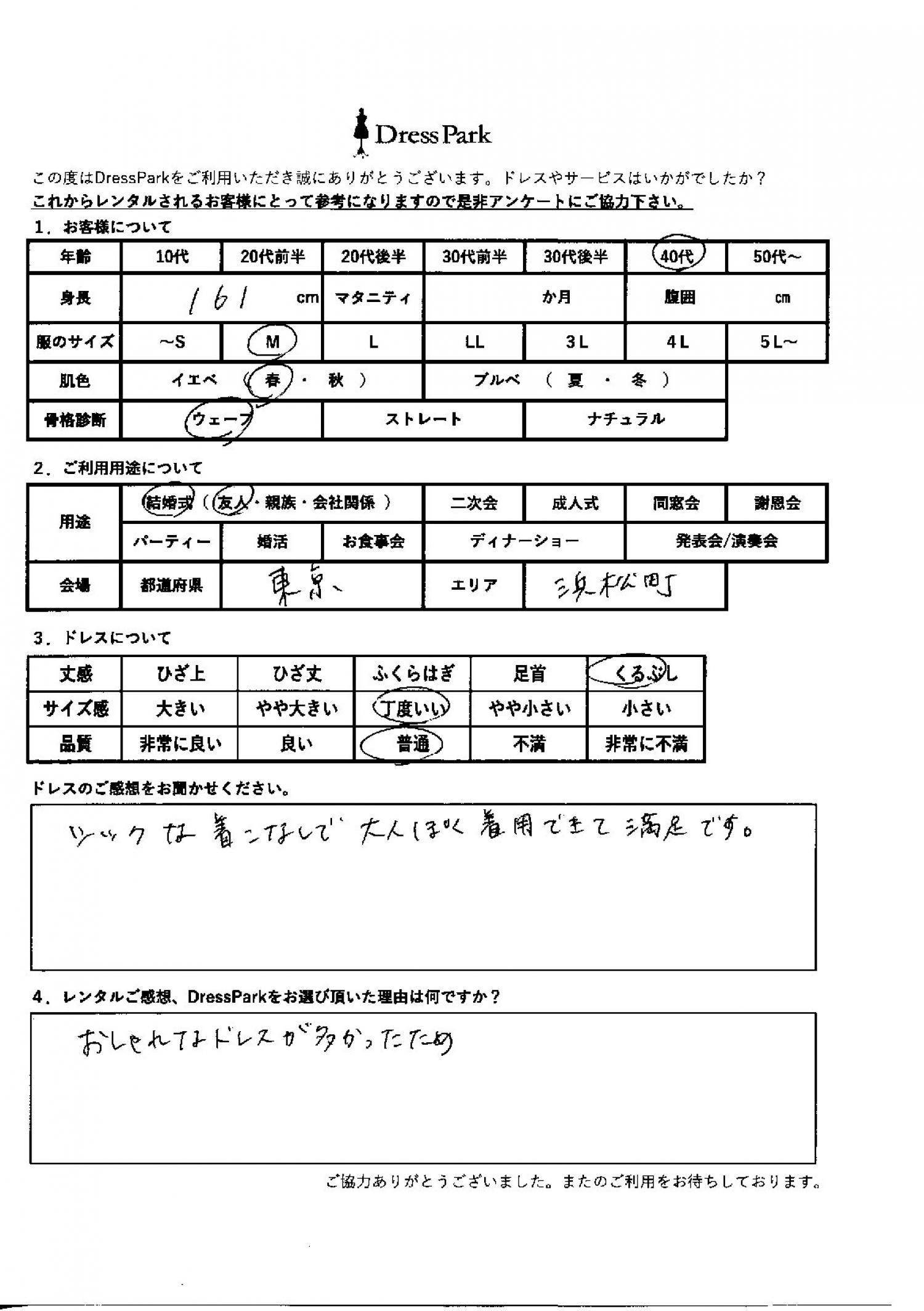 東京都 Y.O様161㎝ Mサイズ #40代#M/L#160~164㎝#結婚式(友人)#東京都 ◆レンタルしたドレスはこちら ◆レンタルしたサイズは:L ◆レンタルした日付:2026/01/17 ドレスの着用感 ◆点数: (4点) ◆丈感:くるぶし ◆サイズ感:丁度いい ◆品質:普通 ◆肌色:イエベ ◆骨格診断:ウェーブ ドレスの感想 シックな着こなしで大人っぽく着用できて満足です。 レンタルのご感想、DressParkをお選び頂いた理由 おしゃれなドレスが多かったため。 CUSTOMER REVIEWS お客様の声 気になるカテゴリー別にご利用の感想をチェック! ◆AGE 年代で見る 10代 20代 30代 40代 50代~ ◆SIZE サイズで見る SS/S M/L 大きいサイズLL~ ◆HIGHT 身長で見る 140~149㎝ 150~154㎝ 155~159㎝ 160~164㎝ 165~169㎝ 170㎝以上 ◆マタニティ ~3か月 4~6か月 7~8か月 9~10か月 ◆肌色 イエベ ブルべ ◆骨格診断 ウェーブ ストレート ナチュラル ◆利用シーン 結婚式(友人) 結婚式(親族) 結婚式(会社関係) 二次会 成人式/同窓会 謝恩会 パーティー その他 CUSTOMER REVIEWS都道府県別お客様の声 都道府県別にのお客様の声をチェック! 北海道 青森県 岩手県 宮城県 秋田県 山形県 福島県 茨城県 栃木県 群馬県 埼玉県 千葉県 東京都 神奈川県 新潟県 富山県 石川県 福井県 山梨県 長野県 岐阜県 静岡県 愛知県 三重県 滋賀県 京都府 大阪府 兵庫県 奈良県 和歌山県 鳥取県 島根県 岡山県 広島県 山口県 徳島県 香川県 愛媛県 高知県 福岡県 佐賀県 長崎県 熊本県 大分県 宮崎県 鹿児島県 沖縄県 CUSTOMER REVIEWSエリア別お客様の声 都道府県別にのお客様の声をチェック! 札幌 仙台 名古屋 軽井沢 金沢 神戸・芦屋 博多 那覇 梅田・新大阪 難波・心斎橋 鎌倉・湘南 横浜・みなとみらい 舞浜・浦安・幕張 大宮・浦和 青山・表参道 六本木・麻布 渋谷・恵比寿 新宿 池袋 銀座・丸の内 お台場・汐留 鹿児島市 郡山市 福島市 東予 甲府・石和 LINEでお問い合わせ このサイトではJavaScriptを使用しています