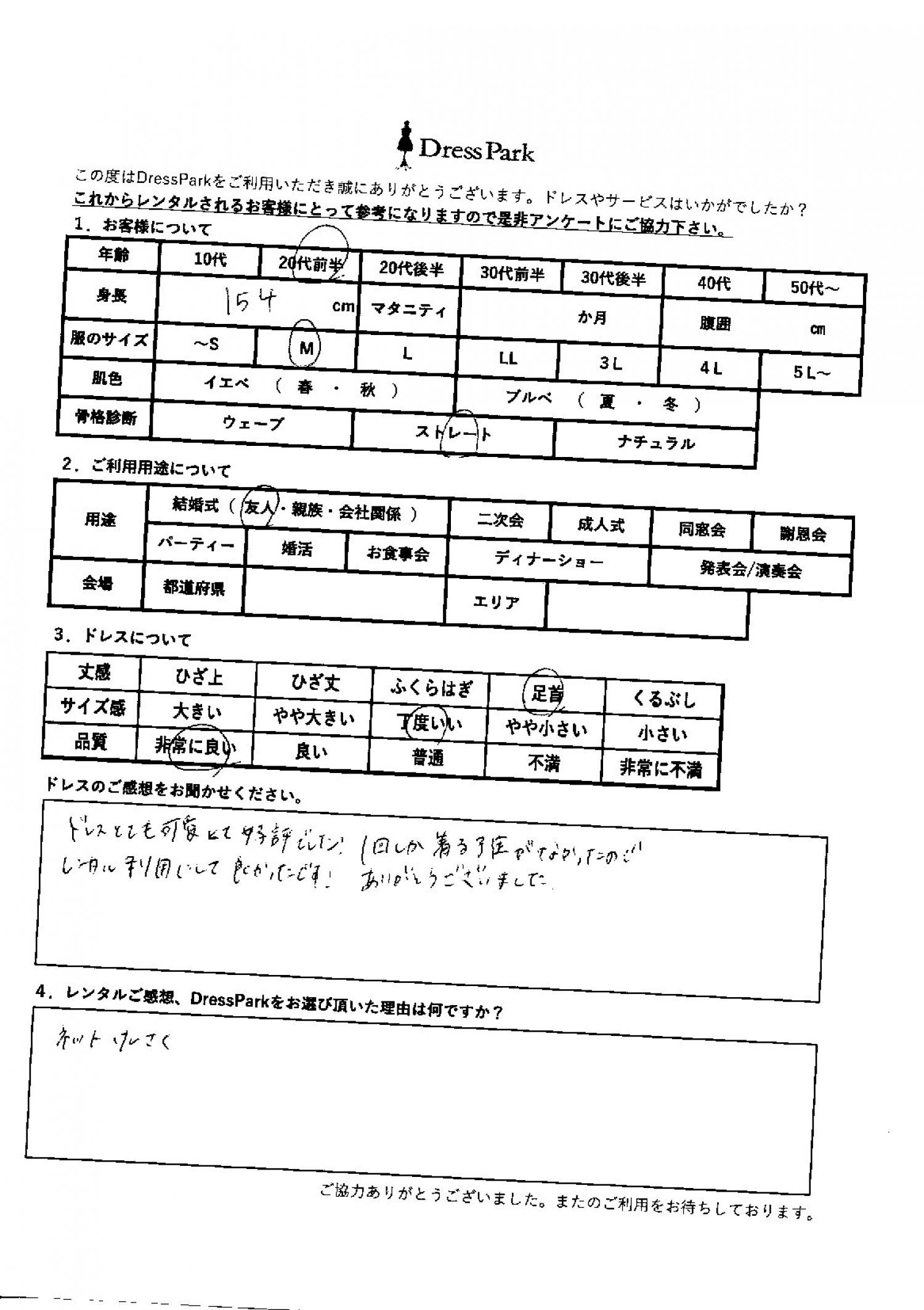 東京都 N.N様154㎝ Mサイズ #20代#M/L#150~154㎝#結婚式(友人)#東京都 ◆レンタルしたドレスはこちら ◆レンタルしたサイズは:M ◆レンタルした日付:2026/01/18 ドレスの着用感 ◆点数: (5点) ◆丈感:足首 ◆サイズ感:丁度いい ◆品質:非常に良い ◆骨格診断:ストレート ドレスの感想 ドレスとても可愛くて好評でした! 1回しか着る予定がなかったので、レンタル利用してよかったです!ありがとうございました。 レンタルのご感想、DressParkをお選び頂いた理由 ネット検索 CUSTOMER REVIEWS お客様の声 気になるカテゴリー別にご利用の感想をチェック! ◆AGE 年代で見る 10代 20代 30代 40代 50代~ ◆SIZE サイズで見る SS/S M/L 大きいサイズLL~ ◆HIGHT 身長で見る 140~149㎝ 150~154㎝ 155~159㎝ 160~164㎝ 165~169㎝ 170㎝以上 ◆マタニティ ~3か月 4~6か月 7~8か月 9~10か月 ◆肌色 イエベ ブルべ ◆骨格診断 ウェーブ ストレート ナチュラル ◆利用シーン 結婚式(友人) 結婚式(親族) 結婚式(会社関係) 二次会 成人式/同窓会 謝恩会 パーティー その他 CUSTOMER REVIEWS都道府県別お客様の声 都道府県別にのお客様の声をチェック! 北海道 青森県 岩手県 宮城県 秋田県 山形県 福島県 茨城県 栃木県 群馬県 埼玉県 千葉県 東京都 神奈川県 新潟県 富山県 石川県 福井県 山梨県 長野県 岐阜県 静岡県 愛知県 三重県 滋賀県 京都府 大阪府 兵庫県 奈良県 和歌山県 鳥取県 島根県 岡山県 広島県 山口県 徳島県 香川県 愛媛県 高知県 福岡県 佐賀県 長崎県 熊本県 大分県 宮崎県 鹿児島県 沖縄県 CUSTOMER REVIEWSエリア別お客様の声 都道府県別にのお客様の声をチェック! 札幌 仙台 名古屋 軽井沢 金沢 神戸・芦屋 博多 那覇 梅田・新大阪 難波・心斎橋 鎌倉・湘南 横浜・みなとみらい 舞浜・浦安・幕張 大宮・浦和 青山・表参道 六本木・麻布 渋谷・恵比寿 新宿 池袋 銀座・丸の内 お台場・汐留 鹿児島市 郡山市 福島市 東予 甲府・石和 LINEでお問い合わせ このサイトではJavaScriptを使用しています