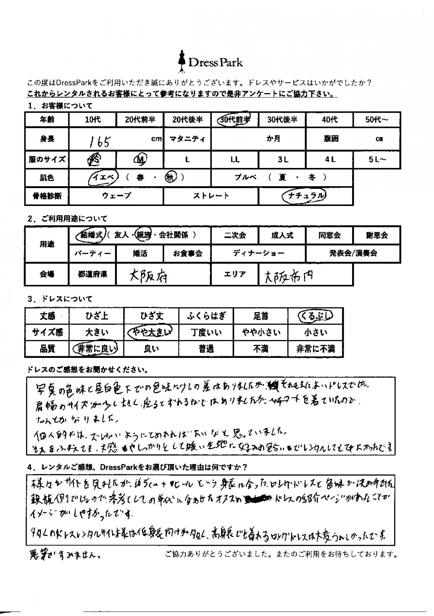 様々なサイトを見ましたが、165cm+ヒールと言う身長に合ったロングドレスと、色味が決め手でした。親族側でしたので、参考としての年代に合わせたお勧めドレスの紹介ページがあったことがイメージしやすかったです。多くのドレスレンタルサイト様は低身長向けが多く、高身長でも切れるロングドレスは大変うれしかったです。