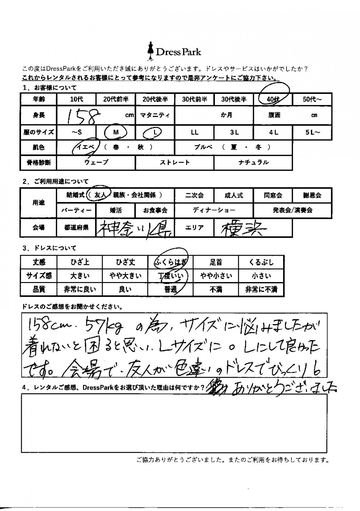 神奈川県 M.M様158㎝ Lサイズ横浜・みなとみらい #40代#M/L#155~159㎝#結婚式(友人)#神奈川県#横浜・みなとみらい ◆レンタルしたドレスはこちら ◆レンタルしたサイズは:L ◆レンタルした日付:2026/01/18 ドレスの着用感 ◆点数: (4点) ◆丈感:ふくらはぎ ◆サイズ感:丁度いい ◆品質:普通 ◆肌色:イエベ ドレスの感想 158cm 57kgのためサイズに悩みましたが、着れないと困ると思いLサイズに。Lにしてよかったです。会場で友人が色違いのドレスでびっくり!ありがとうございました。 CUSTOMER REVIEWS お客様の声 気になるカテゴリー別にご利用の感想をチェック! ◆AGE 年代で見る 10代 20代 30代 40代 50代~ ◆SIZE サイズで見る SS/S M/L 大きいサイズLL~ ◆HIGHT 身長で見る 140~149㎝ 150~154㎝ 155~159㎝ 160~164㎝ 165~169㎝ 170㎝以上 ◆マタニティ ~3か月 4~6か月 7~8か月 9~10か月 ◆肌色 イエベ ブルべ ◆骨格診断 ウェーブ ストレート ナチュラル ◆利用シーン 結婚式(友人) 結婚式(親族) 結婚式(会社関係) 二次会 成人式/同窓会 謝恩会 パーティー その他 CUSTOMER REVIEWS都道府県別お客様の声 都道府県別にのお客様の声をチェック! 北海道 青森県 岩手県 宮城県 秋田県 山形県 福島県 茨城県 栃木県 群馬県 埼玉県 千葉県 東京都 神奈川県 新潟県 富山県 石川県 福井県 山梨県 長野県 岐阜県 静岡県 愛知県 三重県 滋賀県 京都府 大阪府 兵庫県 奈良県 和歌山県 鳥取県 島根県 岡山県 広島県 山口県 徳島県 香川県 愛媛県 高知県 福岡県 佐賀県 長崎県 熊本県 大分県 宮崎県 鹿児島県 沖縄県 CUSTOMER REVIEWSエリア別お客様の声 都道府県別にのお客様の声をチェック! 札幌 仙台 名古屋 軽井沢 金沢 神戸・芦屋 博多 那覇 梅田・新大阪 難波・心斎橋 鎌倉・湘南 横浜・みなとみらい 舞浜・浦安・幕張 大宮・浦和 青山・表参道 六本木・麻布 渋谷・恵比寿 新宿 池袋 銀座・丸の内 お台場・汐留 鹿児島市 郡山市 福島市 東予 甲府・石和 LINEでお問い合わせ このサイトではJavaScriptを使用しています