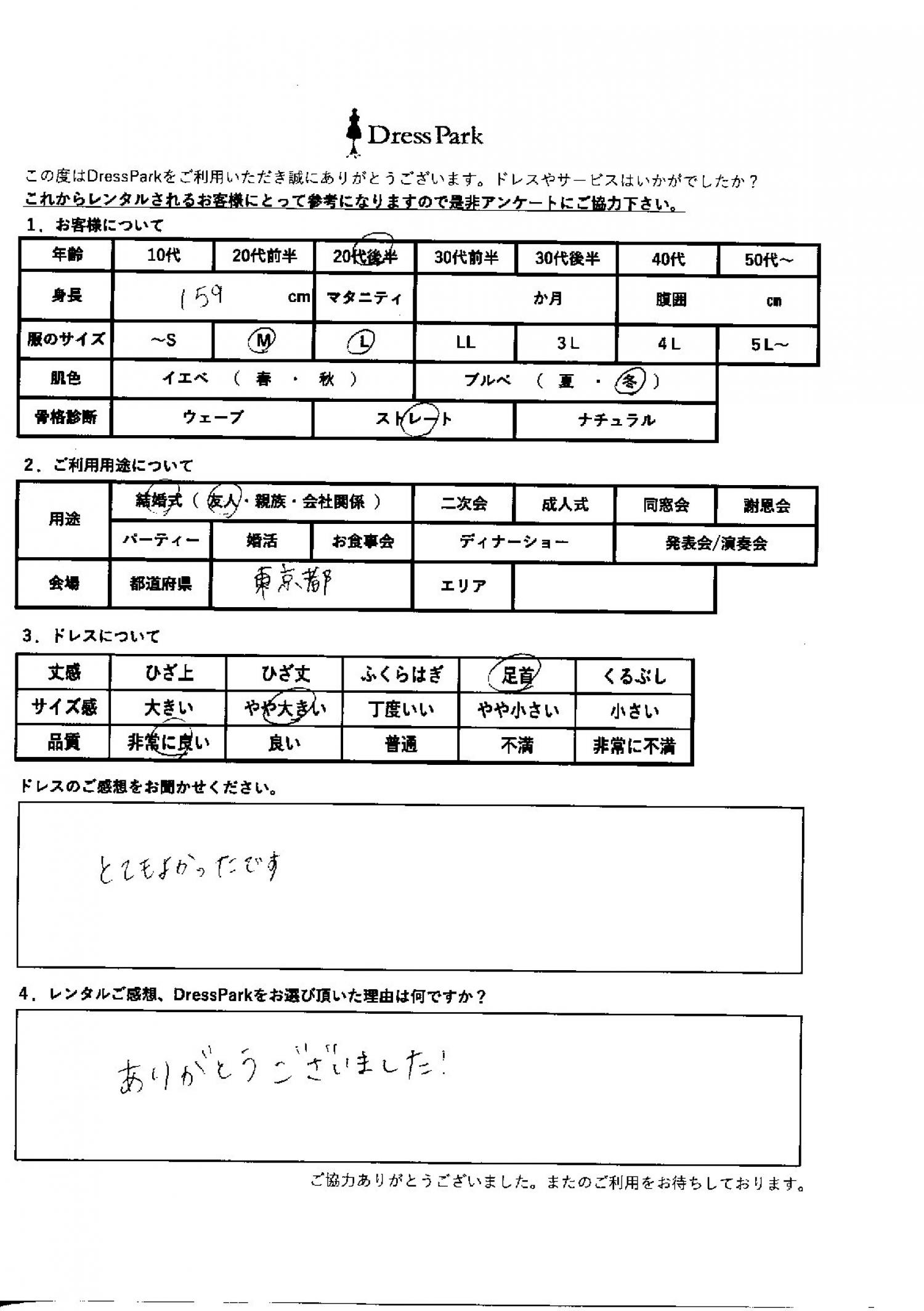 東京都 A.K様159㎝ Mサイズ #20代#M/L#155~159㎝#結婚式(友人)#東京都 ◆レンタルしたドレスはこちら ◆レンタルしたサイズは:L ◆レンタルした日付:2026/01/18 ドレスの着用感 ◆点数: (5点) ◆丈感:足首 ◆サイズ感:やや大きい ◆品質:非常に良い ◆肌色:ブルべ ◆骨格診断:ストレート ドレスの感想 とても良かったです。 レンタルのご感想、DressParkをお選び頂いた理由 ありがとうございました! CUSTOMER REVIEWS お客様の声 気になるカテゴリー別にご利用の感想をチェック! ◆AGE 年代で見る 10代 20代 30代 40代 50代~ ◆SIZE サイズで見る SS/S M/L 大きいサイズLL~ ◆HIGHT 身長で見る 140~149㎝ 150~154㎝ 155~159㎝ 160~164㎝ 165~169㎝ 170㎝以上 ◆マタニティ ~3か月 4~6か月 7~8か月 9~10か月 ◆肌色 イエベ ブルべ ◆骨格診断 ウェーブ ストレート ナチュラル ◆利用シーン 結婚式(友人) 結婚式(親族) 結婚式(会社関係) 二次会 成人式/同窓会 謝恩会 パーティー その他 CUSTOMER REVIEWS都道府県別お客様の声 都道府県別にのお客様の声をチェック! 北海道 青森県 岩手県 宮城県 秋田県 山形県 福島県 茨城県 栃木県 群馬県 埼玉県 千葉県 東京都 神奈川県 新潟県 富山県 石川県 福井県 山梨県 長野県 岐阜県 静岡県 愛知県 三重県 滋賀県 京都府 大阪府 兵庫県 奈良県 和歌山県 鳥取県 島根県 岡山県 広島県 山口県 徳島県 香川県 愛媛県 高知県 福岡県 佐賀県 長崎県 熊本県 大分県 宮崎県 鹿児島県 沖縄県 CUSTOMER REVIEWSエリア別お客様の声 都道府県別にのお客様の声をチェック! 札幌 仙台 名古屋 軽井沢 金沢 神戸・芦屋 博多 那覇 梅田・新大阪 難波・心斎橋 鎌倉・湘南 横浜・みなとみらい 舞浜・浦安・幕張 大宮・浦和 青山・表参道 六本木・麻布 渋谷・恵比寿 新宿 池袋 銀座・丸の内 お台場・汐留 鹿児島市 郡山市 福島市 東予 甲府・石和 LINEでお問い合わせ このサイトではJavaScriptを使用しています