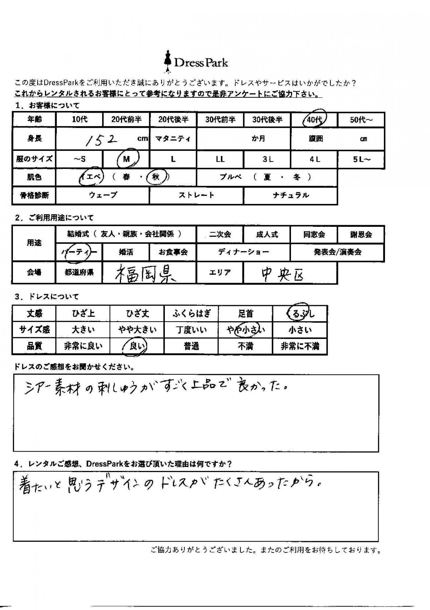 福岡県 K.T様152㎝ Mサイズ #40代#M/L#150~154㎝#パーティー#福岡県 ◆レンタルしたドレスはこちら ◆レンタルしたサイズは:M ◆レンタルした日付:2026/01/18 ドレスの着用感 ◆点数: (4点) ◆丈感:くるぶし ◆サイズ感:やや小さい ◆品質:良い ◆肌色:イエベ ドレスの感想 シアー素材の刺繍がすごく上品で良かった。 レンタルのご感想、DressParkをお選び頂いた理由 着たいと思うデザインのドレスがたくさんあったから。 CUSTOMER REVIEWS お客様の声 気になるカテゴリー別にご利用の感想をチェック! ◆AGE 年代で見る 10代 20代 30代 40代 50代~ ◆SIZE サイズで見る SS/S M/L 大きいサイズLL~ ◆HIGHT 身長で見る 140~149㎝ 150~154㎝ 155~159㎝ 160~164㎝ 165~169㎝ 170㎝以上 ◆マタニティ ~3か月 4~6か月 7~8か月 9~10か月 ◆肌色 イエベ ブルべ ◆骨格診断 ウェーブ ストレート ナチュラル ◆利用シーン 結婚式(友人) 結婚式(親族) 結婚式(会社関係) 二次会 成人式/同窓会 謝恩会 パーティー その他 CUSTOMER REVIEWS都道府県別お客様の声 都道府県別にのお客様の声をチェック! 北海道 青森県 岩手県 宮城県 秋田県 山形県 福島県 茨城県 栃木県 群馬県 埼玉県 千葉県 東京都 神奈川県 新潟県 富山県 石川県 福井県 山梨県 長野県 岐阜県 静岡県 愛知県 三重県 滋賀県 京都府 大阪府 兵庫県 奈良県 和歌山県 鳥取県 島根県 岡山県 広島県 山口県 徳島県 香川県 愛媛県 高知県 福岡県 佐賀県 長崎県 熊本県 大分県 宮崎県 鹿児島県 沖縄県 CUSTOMER REVIEWSエリア別お客様の声 都道府県別にのお客様の声をチェック! 札幌 仙台 名古屋 軽井沢 金沢 神戸・芦屋 博多 那覇 梅田・新大阪 難波・心斎橋 鎌倉・湘南 横浜・みなとみらい 舞浜・浦安・幕張 大宮・浦和 青山・表参道 六本木・麻布 渋谷・恵比寿 新宿 池袋 銀座・丸の内 お台場・汐留 鹿児島市 郡山市 福島市 東予 甲府・石和 LINEでお問い合わせ このサイトではJavaScriptを使用しています