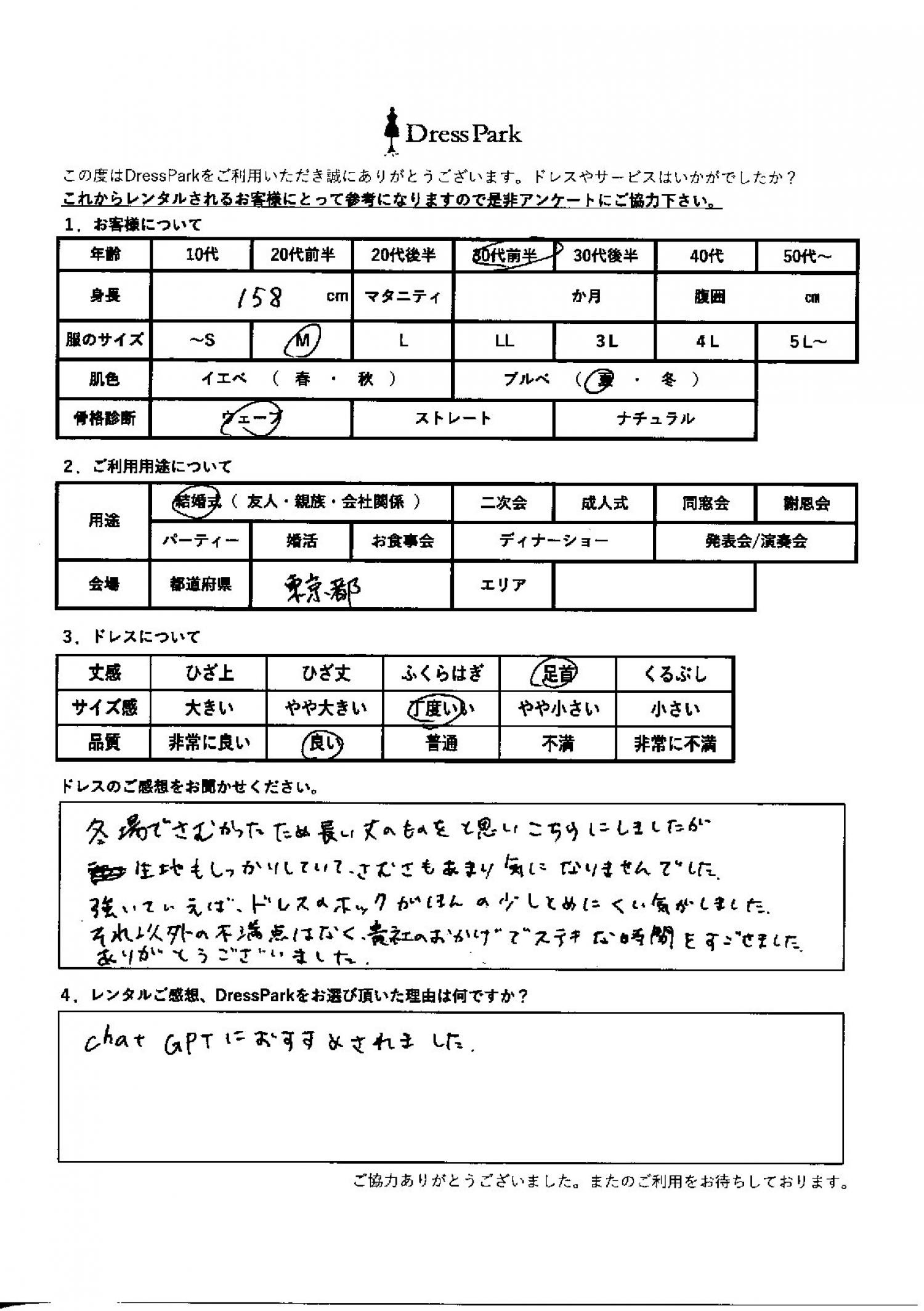 冬場で寒かったため、長い丈のものをと思いこちらにしましたが、生地もしっかりしていて、寒さもあまり気になりませんでした。強いて言えばドレスのホックがほんの少し止めにくい気がしました。それ以外の不満点はなく、貴社のおかげで素敵な時間を過ごせました。ありがとうございました。レンタルのご感想、