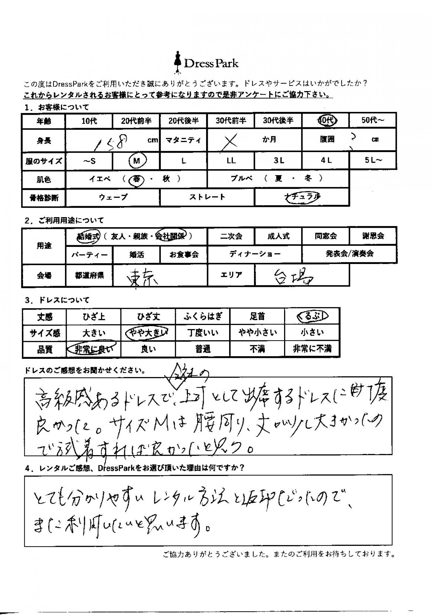高級感のあるドレスで会社の上司として出席するドレスにちょうどよかった。サイズMは腰回り丈が少し大きかったので、試着すれば良かったと思う。レンタルのご感想、