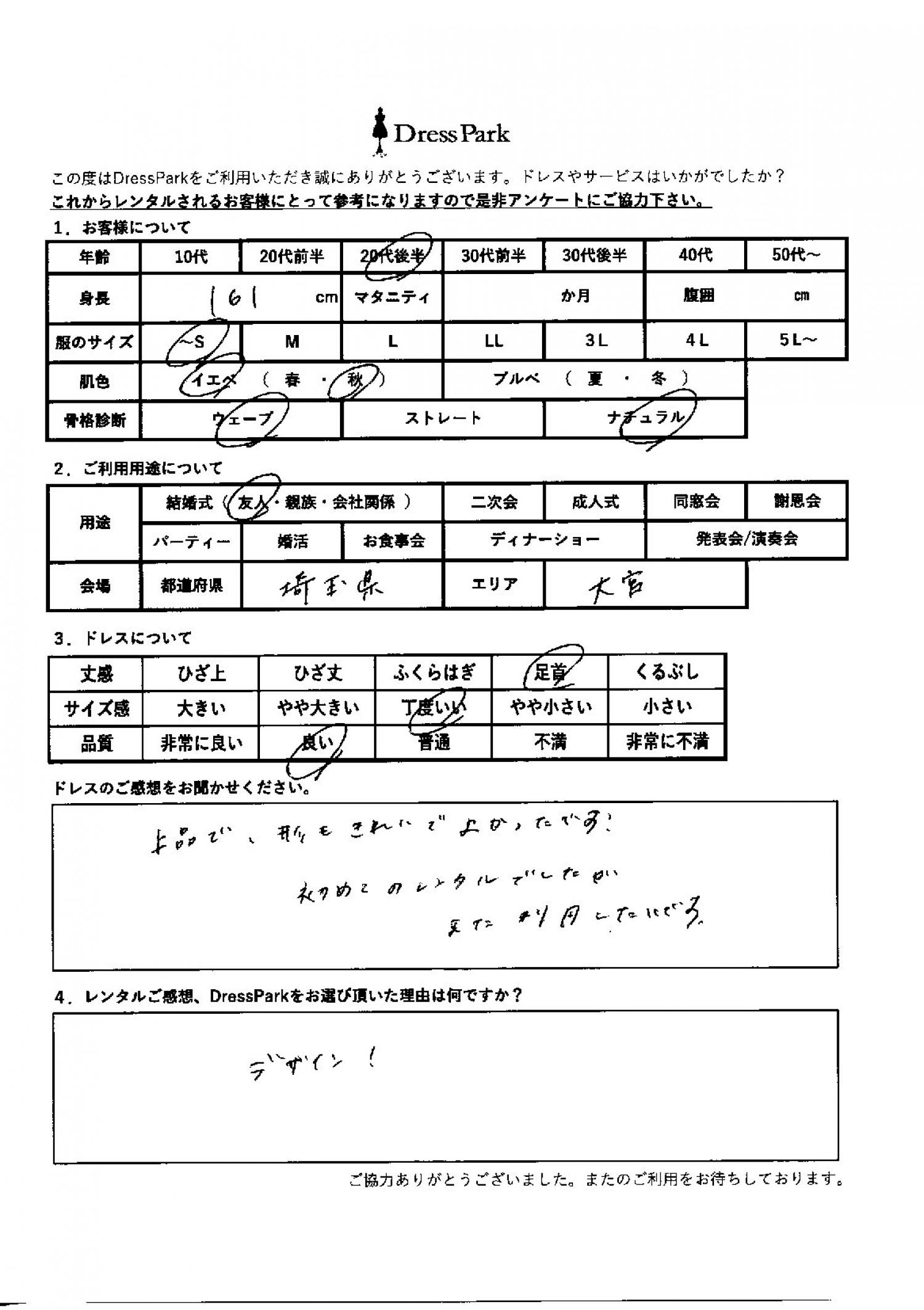 埼玉県 A.S様161㎝ ~Sサイズ大宮・浦和 #20代#SS/S#160~164㎝#結婚式(友人)#埼玉県#大宮・浦和 ◆レンタルしたドレスはこちら ◆レンタルしたサイズは:M ◆レンタルした日付:2026/01/24 ドレスの着用感 ◆点数: (4点) ◆丈感:足首 ◆サイズ感:丁度いい ◆品質:良い ◆肌色:イエベ ◆骨格診断:ウェーブ ドレスの感想 上品で形も綺麗でよかったです!はじめてのレンタルでしたが、また利用したいです。 レンタルのご感想、DressParkをお選び頂いた理由 デザイン! CUSTOMER REVIEWS お客様の声 気になるカテゴリー別にご利用の感想をチェック! ◆AGE 年代で見る 10代 20代 30代 40代 50代~ ◆SIZE サイズで見る SS/S M/L 大きいサイズLL~ ◆HIGHT 身長で見る 140~149㎝ 150~154㎝ 155~159㎝ 160~164㎝ 165~169㎝ 170㎝以上 ◆マタニティ ~3か月 4~6か月 7~8か月 9~10か月 ◆肌色 イエベ ブルべ ◆骨格診断 ウェーブ ストレート ナチュラル ◆利用シーン 結婚式(友人) 結婚式(親族) 結婚式(会社関係) 二次会 成人式/同窓会 謝恩会 パーティー その他 CUSTOMER REVIEWS都道府県別お客様の声 都道府県別にのお客様の声をチェック! 北海道 青森県 岩手県 宮城県 秋田県 山形県 福島県 茨城県 栃木県 群馬県 埼玉県 千葉県 東京都 神奈川県 新潟県 富山県 石川県 福井県 山梨県 長野県 岐阜県 静岡県 愛知県 三重県 滋賀県 京都府 大阪府 兵庫県 奈良県 和歌山県 鳥取県 島根県 岡山県 広島県 山口県 徳島県 香川県 愛媛県 高知県 福岡県 佐賀県 長崎県 熊本県 大分県 宮崎県 鹿児島県 沖縄県 CUSTOMER REVIEWSエリア別お客様の声 都道府県別にのお客様の声をチェック! 札幌 仙台 名古屋 軽井沢 金沢 神戸・芦屋 博多 那覇 梅田・新大阪 難波・心斎橋 鎌倉・湘南 横浜・みなとみらい 舞浜・浦安・幕張 大宮・浦和 青山・表参道 六本木・麻布 渋谷・恵比寿 新宿 池袋 銀座・丸の内 お台場・汐留 鹿児島市 郡山市 福島市 東予 甲府・石和 LINEでお問い合わせ このサイトではJavaScriptを使用しています