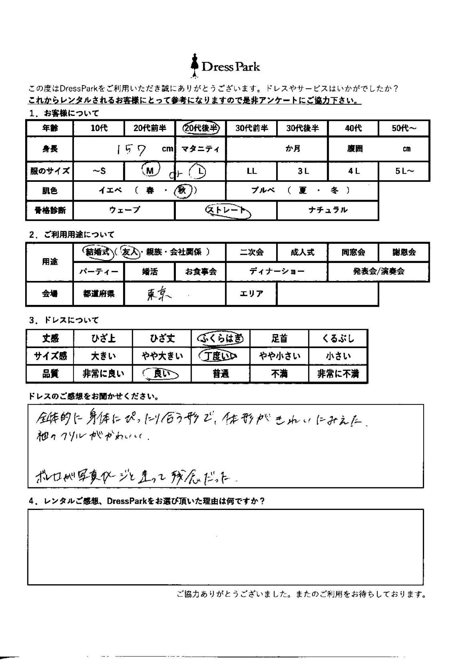 東京都 M.Y様157㎝ Mサイズ #20代#M/L#155~159㎝#結婚式(友人)#東京都 ◆レンタルしたドレスはこちら ◆レンタルしたサイズは:M ◆レンタルした日付:2026/01/24 ドレスの着用感 ◆点数: (4点) ◆丈感:ふくらはぎ ◆サイズ感:丁度いい ◆品質:良い ◆肌色:イエベ ◆骨格診断:ストレート ドレスの感想 全体的に体にぴったり合う形で体型がきれいに見えた。袖のフリルがかわいい。ボレロが写真イメージと違って残念だった。 CUSTOMER REVIEWS お客様の声 気になるカテゴリー別にご利用の感想をチェック! ◆AGE 年代で見る 10代 20代 30代 40代 50代~ ◆SIZE サイズで見る SS/S M/L 大きいサイズLL~ ◆HIGHT 身長で見る 140~149㎝ 150~154㎝ 155~159㎝ 160~164㎝ 165~169㎝ 170㎝以上 ◆マタニティ ~3か月 4~6か月 7~8か月 9~10か月 ◆肌色 イエベ ブルべ ◆骨格診断 ウェーブ ストレート ナチュラル ◆利用シーン 結婚式(友人) 結婚式(親族) 結婚式(会社関係) 二次会 成人式/同窓会 謝恩会 パーティー その他 CUSTOMER REVIEWS都道府県別お客様の声 都道府県別にのお客様の声をチェック! 北海道 青森県 岩手県 宮城県 秋田県 山形県 福島県 茨城県 栃木県 群馬県 埼玉県 千葉県 東京都 神奈川県 新潟県 富山県 石川県 福井県 山梨県 長野県 岐阜県 静岡県 愛知県 三重県 滋賀県 京都府 大阪府 兵庫県 奈良県 和歌山県 鳥取県 島根県 岡山県 広島県 山口県 徳島県 香川県 愛媛県 高知県 福岡県 佐賀県 長崎県 熊本県 大分県 宮崎県 鹿児島県 沖縄県 CUSTOMER REVIEWSエリア別お客様の声 都道府県別にのお客様の声をチェック! 札幌 仙台 名古屋 軽井沢 金沢 神戸・芦屋 博多 那覇 梅田・新大阪 難波・心斎橋 鎌倉・湘南 横浜・みなとみらい 舞浜・浦安・幕張 大宮・浦和 青山・表参道 六本木・麻布 渋谷・恵比寿 新宿 池袋 銀座・丸の内 お台場・汐留 鹿児島市 郡山市 福島市 東予 甲府・石和 LINEでお問い合わせ このサイトではJavaScriptを使用しています
