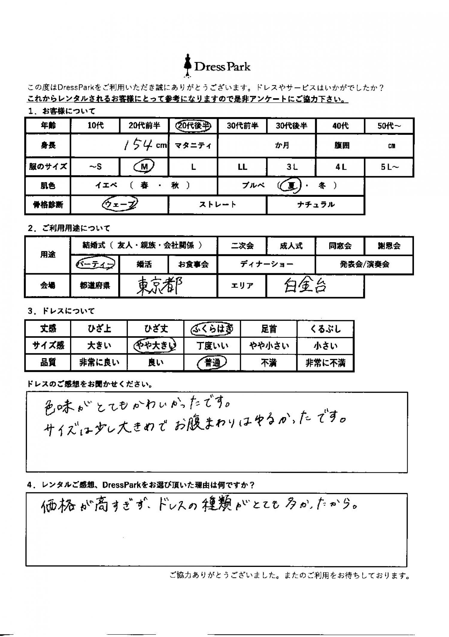東京都 M.K様154㎝ Mサイズ六本木・麻布 #20代#M/L#150~154㎝#パーティー#東京都#六本木・麻布 ◆レンタルしたドレスはこちら ◆レンタルしたサイズは:M ◆レンタルした日付:2026/01/24 ドレスの着用感 ◆点数: (4点) ◆丈感:ふくらはぎ ◆サイズ感:やや大きい ◆品質:普通 ◆肌色:ブルべ ◆骨格診断:ウェーブ ドレスの感想 色味がとても可愛かったです。サイズは少し大きめでお腹周りは緩かったです。 レンタルのご感想、DressParkをお選び頂いた理由 価格が高すぎず、ドレスの種類がとても多かったから。 CUSTOMER REVIEWS お客様の声 気になるカテゴリー別にご利用の感想をチェック! ◆AGE 年代で見る 10代 20代 30代 40代 50代~ ◆SIZE サイズで見る SS/S M/L 大きいサイズLL~ ◆HIGHT 身長で見る 140~149㎝ 150~154㎝ 155~159㎝ 160~164㎝ 165~169㎝ 170㎝以上 ◆マタニティ ~3か月 4~6か月 7~8か月 9~10か月 ◆肌色 イエベ ブルべ ◆骨格診断 ウェーブ ストレート ナチュラル ◆利用シーン 結婚式(友人) 結婚式(親族) 結婚式(会社関係) 二次会 成人式/同窓会 謝恩会 パーティー その他 CUSTOMER REVIEWS都道府県別お客様の声 都道府県別にのお客様の声をチェック! 北海道 青森県 岩手県 宮城県 秋田県 山形県 福島県 茨城県 栃木県 群馬県 埼玉県 千葉県 東京都 神奈川県 新潟県 富山県 石川県 福井県 山梨県 長野県 岐阜県 静岡県 愛知県 三重県 滋賀県 京都府 大阪府 兵庫県 奈良県 和歌山県 鳥取県 島根県 岡山県 広島県 山口県 徳島県 香川県 愛媛県 高知県 福岡県 佐賀県 長崎県 熊本県 大分県 宮崎県 鹿児島県 沖縄県 CUSTOMER REVIEWSエリア別お客様の声 都道府県別にのお客様の声をチェック! 札幌 仙台 名古屋 軽井沢 金沢 神戸・芦屋 博多 那覇 梅田・新大阪 難波・心斎橋 鎌倉・湘南 横浜・みなとみらい 舞浜・浦安・幕張 大宮・浦和 青山・表参道 六本木・麻布 渋谷・恵比寿 新宿 池袋 銀座・丸の内 お台場・汐留 鹿児島市 郡山市 福島市 東予 甲府・石和 LINEでお問い合わせ このサイトではJavaScriptを使用しています