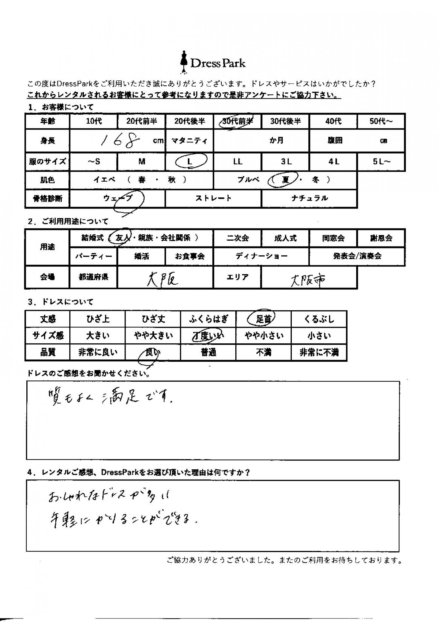大阪府 A.E様168㎝ Lサイズ #30代#M/L#165~169㎝#結婚式(友人)#大阪府 ◆レンタルしたドレスはこちら ◆レンタルしたサイズは:L ◆レンタルした日付:2026/1/25 ドレスの着用感 ◆点数: (4点) ◆丈感:足首 ◆サイズ感:丁度いい ◆品質:良い ◆肌色:ブルべ ◆骨格診断:ウェーブ ドレスの感想 質も良く満足です レンタルのご感想、DressParkをお選び頂いた理由 おしゃれなドレスが多い 手軽にかりることができる CUSTOMER REVIEWS お客様の声 気になるカテゴリー別にご利用の感想をチェック! ◆AGE 年代で見る 10代 20代 30代 40代 50代~ ◆SIZE サイズで見る SS/S M/L 大きいサイズLL~ ◆HIGHT 身長で見る 140~149㎝ 150~154㎝ 155~159㎝ 160~164㎝ 165~169㎝ 170㎝以上 ◆マタニティ ~3か月 4~6か月 7~8か月 9~10か月 ◆肌色 イエベ ブルべ ◆骨格診断 ウェーブ ストレート ナチュラル ◆利用シーン 結婚式(友人) 結婚式(親族) 結婚式(会社関係) 二次会 成人式/同窓会 謝恩会 パーティー その他 CUSTOMER REVIEWS都道府県別お客様の声 都道府県別にのお客様の声をチェック! 北海道 青森県 岩手県 宮城県 秋田県 山形県 福島県 茨城県 栃木県 群馬県 埼玉県 千葉県 東京都 神奈川県 新潟県 富山県 石川県 福井県 山梨県 長野県 岐阜県 静岡県 愛知県 三重県 滋賀県 京都府 大阪府 兵庫県 奈良県 和歌山県 鳥取県 島根県 岡山県 広島県 山口県 徳島県 香川県 愛媛県 高知県 福岡県 佐賀県 長崎県 熊本県 大分県 宮崎県 鹿児島県 沖縄県 CUSTOMER REVIEWSエリア別お客様の声 都道府県別にのお客様の声をチェック! 札幌 仙台 名古屋 軽井沢 金沢 神戸・芦屋 博多 那覇 梅田・新大阪 難波・心斎橋 鎌倉・湘南 横浜・みなとみらい 舞浜・浦安・幕張 大宮・浦和 青山・表参道 六本木・麻布 渋谷・恵比寿 新宿 池袋 銀座・丸の内 お台場・汐留 鹿児島市 郡山市 福島市 東予 甲府・石和 LINEでお問い合わせ このサイトではJavaScriptを使用しています