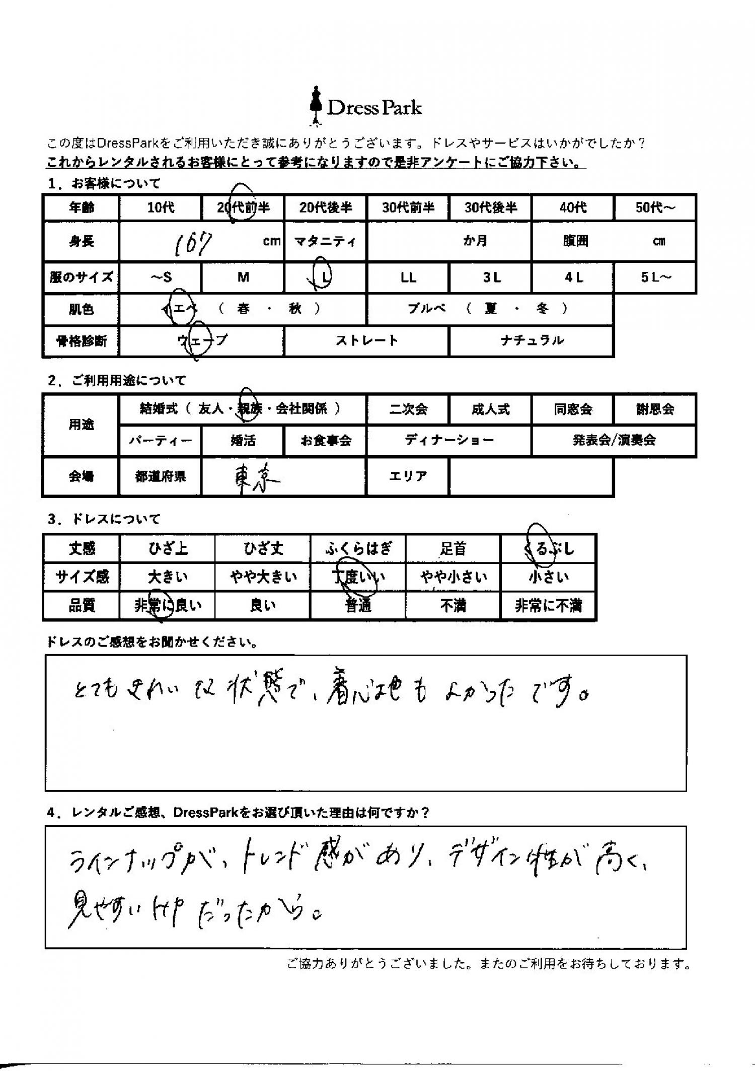 東京都 W.T様167㎝ Lサイズ #20代#M/L#165~169㎝#結婚式(親族)#東京都 ◆レンタルしたドレスはこちら ◆レンタルしたサイズは:L ◆レンタルした日付:2026/1/25 ドレスの着用感 ◆点数: (5点) ◆丈感:くるぶし ◆サイズ感:丁度いい ◆品質:非常に良い ◆肌色:イエベ ◆骨格診断:ウェーブ ドレスの感想 とてもきれいな状態で、居心地もよかったです。 レンタルのご感想、DressParkをお選び頂いた理由 ラインナップが、トレンド感があり、デザイン性が高く、見やすいHPだったから。 CUSTOMER REVIEWS お客様の声 気になるカテゴリー別にご利用の感想をチェック! ◆AGE 年代で見る 10代 20代 30代 40代 50代~ ◆SIZE サイズで見る SS/S M/L 大きいサイズLL~ ◆HIGHT 身長で見る 140~149㎝ 150~154㎝ 155~159㎝ 160~164㎝ 165~169㎝ 170㎝以上 ◆マタニティ ~3か月 4~6か月 7~8か月 9~10か月 ◆肌色 イエベ ブルべ ◆骨格診断 ウェーブ ストレート ナチュラル ◆利用シーン 結婚式(友人) 結婚式(親族) 結婚式(会社関係) 二次会 成人式/同窓会 謝恩会 パーティー その他 CUSTOMER REVIEWS都道府県別お客様の声 都道府県別にのお客様の声をチェック! 北海道 青森県 岩手県 宮城県 秋田県 山形県 福島県 茨城県 栃木県 群馬県 埼玉県 千葉県 東京都 神奈川県 新潟県 富山県 石川県 福井県 山梨県 長野県 岐阜県 静岡県 愛知県 三重県 滋賀県 京都府 大阪府 兵庫県 奈良県 和歌山県 鳥取県 島根県 岡山県 広島県 山口県 徳島県 香川県 愛媛県 高知県 福岡県 佐賀県 長崎県 熊本県 大分県 宮崎県 鹿児島県 沖縄県 CUSTOMER REVIEWSエリア別お客様の声 都道府県別にのお客様の声をチェック! 札幌 仙台 名古屋 軽井沢 金沢 神戸・芦屋 博多 那覇 梅田・新大阪 難波・心斎橋 鎌倉・湘南 横浜・みなとみらい 舞浜・浦安・幕張 大宮・浦和 青山・表参道 六本木・麻布 渋谷・恵比寿 新宿 池袋 銀座・丸の内 お台場・汐留 鹿児島市 郡山市 福島市 東予 甲府・石和 LINEでお問い合わせ このサイトではJavaScriptを使用しています