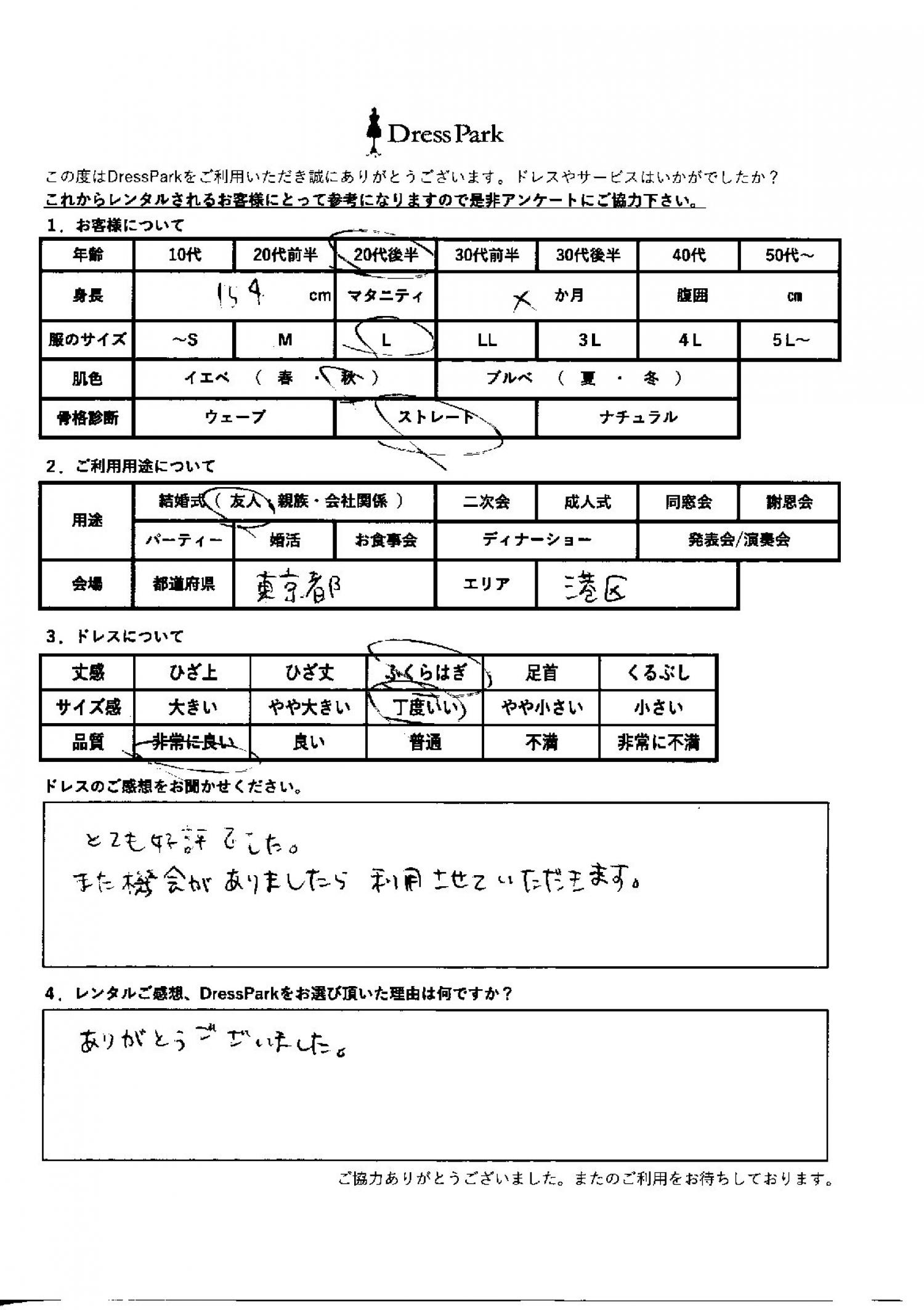 東京都 M.K様154㎝ Lサイズ六本木・麻布 #20代#M/L#150~154㎝#結婚式(友人)#東京都#六本木・麻布 ◆レンタルしたドレスはこちら ◆レンタルしたサイズは:M ◆レンタルした日付:2026/01/25 ドレスの着用感 ◆点数: (5点) ◆丈感:ふくらはぎ ◆サイズ感:丁度いい ◆品質:非常に良い ◆肌色:イエベ ◆骨格診断:ストレート ドレスの感想 とても好評でした。また機会がありましたら利用させていただきます。 レンタルのご感想、DressParkをお選び頂いた理由 ありがとうございました。 CUSTOMER REVIEWS お客様の声 気になるカテゴリー別にご利用の感想をチェック! ◆AGE 年代で見る 10代 20代 30代 40代 50代~ ◆SIZE サイズで見る SS/S M/L 大きいサイズLL~ ◆HIGHT 身長で見る 140~149㎝ 150~154㎝ 155~159㎝ 160~164㎝ 165~169㎝ 170㎝以上 ◆マタニティ ~3か月 4~6か月 7~8か月 9~10か月 ◆肌色 イエベ ブルべ ◆骨格診断 ウェーブ ストレート ナチュラル ◆利用シーン 結婚式(友人) 結婚式(親族) 結婚式(会社関係) 二次会 成人式/同窓会 謝恩会 パーティー その他 CUSTOMER REVIEWS都道府県別お客様の声 都道府県別にのお客様の声をチェック! 北海道 青森県 岩手県 宮城県 秋田県 山形県 福島県 茨城県 栃木県 群馬県 埼玉県 千葉県 東京都 神奈川県 新潟県 富山県 石川県 福井県 山梨県 長野県 岐阜県 静岡県 愛知県 三重県 滋賀県 京都府 大阪府 兵庫県 奈良県 和歌山県 鳥取県 島根県 岡山県 広島県 山口県 徳島県 香川県 愛媛県 高知県 福岡県 佐賀県 長崎県 熊本県 大分県 宮崎県 鹿児島県 沖縄県 CUSTOMER REVIEWSエリア別お客様の声 都道府県別にのお客様の声をチェック! 札幌 仙台 名古屋 軽井沢 金沢 神戸・芦屋 博多 那覇 梅田・新大阪 難波・心斎橋 鎌倉・湘南 横浜・みなとみらい 舞浜・浦安・幕張 大宮・浦和 青山・表参道 六本木・麻布 渋谷・恵比寿 新宿 池袋 銀座・丸の内 お台場・汐留 鹿児島市 郡山市 福島市 東予 甲府・石和 LINEでお問い合わせ このサイトではJavaScriptを使用しています