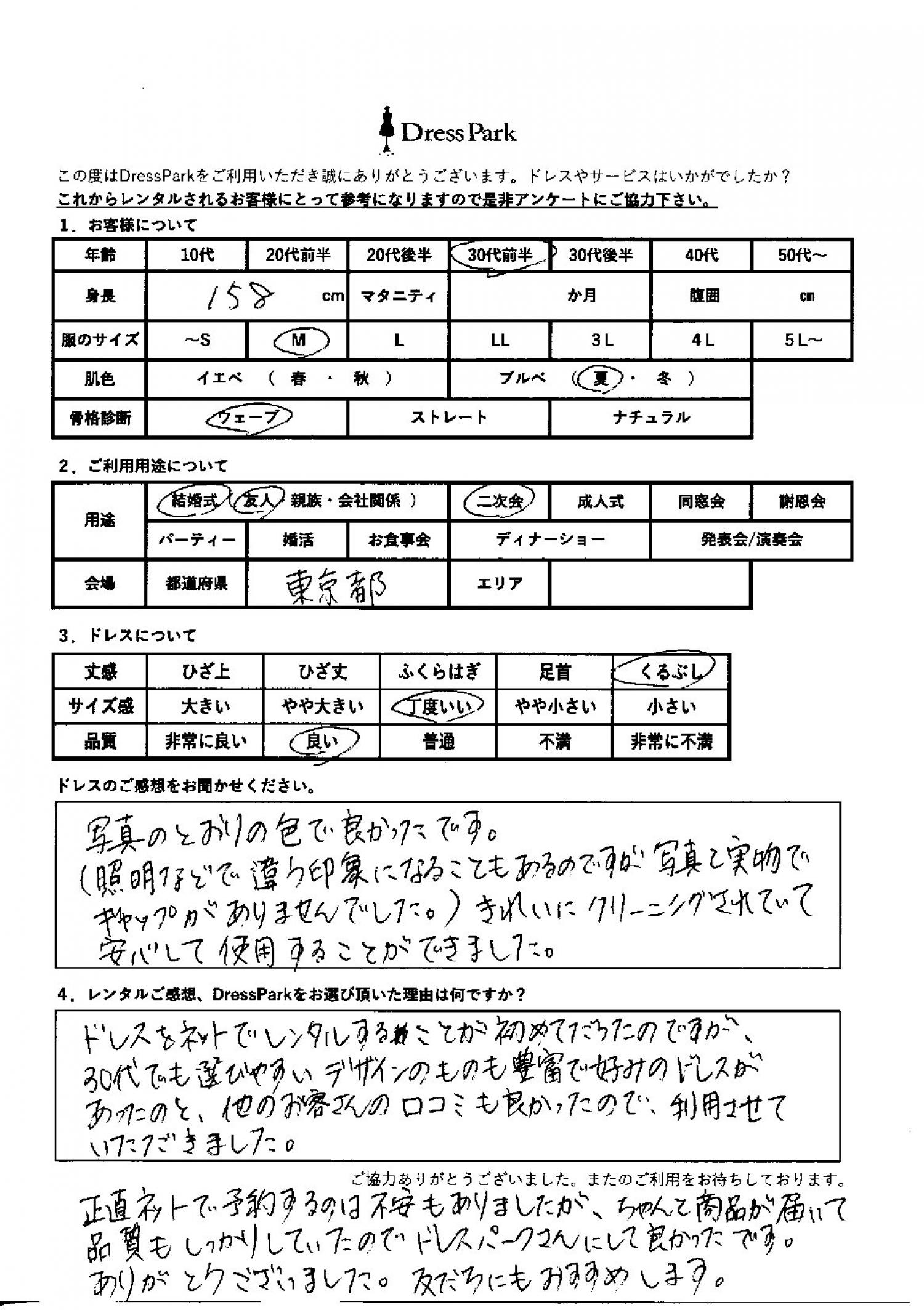 ドレスをネットでレンタルすることが初めてだったのですが、30代でも選びやすいデザインのものも豊富で好みのドレスがあったのと、他のお客さんの口コミも良かったので、利用させていただきました。正直、ネットで予約するのは不安もありましたが、ちゃんと商品が届いて、品質もしっかりしていたので、ドレスパークさんにしてよかったです。ありがとうございました。友達にもお勧めします。