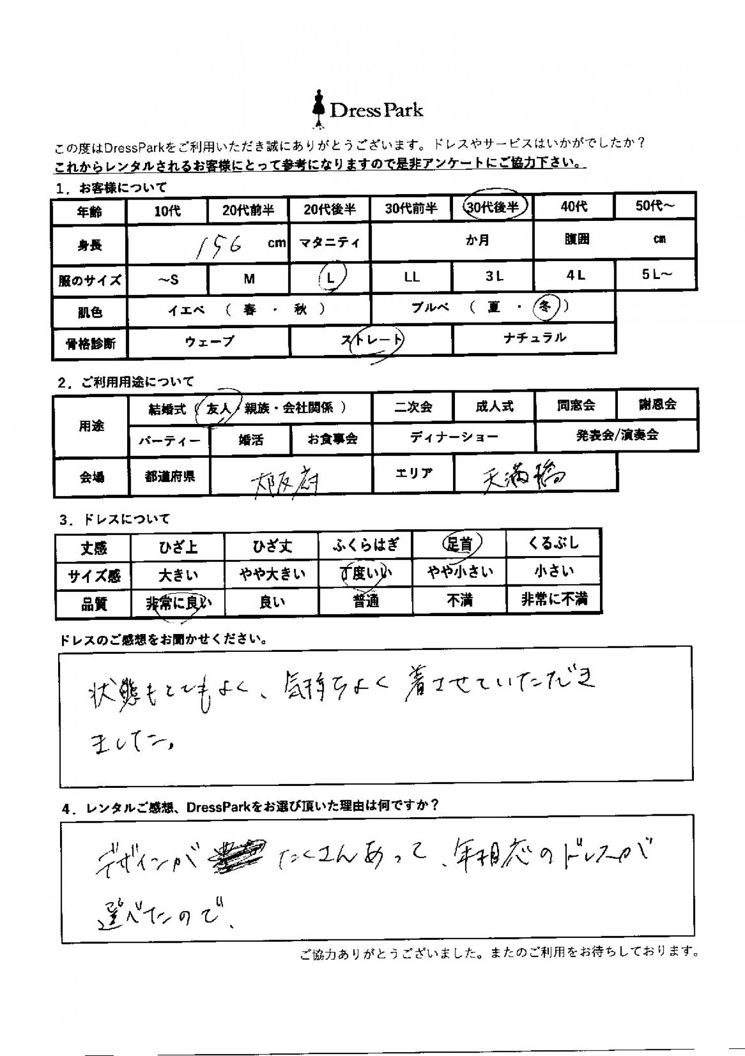 大阪府 S.T様156㎝ Lサイズ #30代#M/L#155~159㎝#結婚式(友人)#大阪府 ◆レンタルしたドレスはこちら ◆レンタルしたサイズは:M ◆レンタルした日付:2026/01/25 ドレスの着用感 ◆点数: (5点) ◆丈感:足首 ◆サイズ感:丁度いい ◆品質:非常に良い ◆肌色:ブルべ ◆骨格診断:ストレート ドレスの感想 状態もとても良く、気持ちよく着させていただきました。 レンタルのご感想、DressParkをお選び頂いた理由 デザインがたくさんあって、年相応なドレスが選べたので。 CUSTOMER REVIEWS お客様の声 気になるカテゴリー別にご利用の感想をチェック! ◆AGE 年代で見る 10代 20代 30代 40代 50代~ ◆SIZE サイズで見る SS/S M/L 大きいサイズLL~ ◆HIGHT 身長で見る 140~149㎝ 150~154㎝ 155~159㎝ 160~164㎝ 165~169㎝ 170㎝以上 ◆マタニティ ~3か月 4~6か月 7~8か月 9~10か月 ◆肌色 イエベ ブルべ ◆骨格診断 ウェーブ ストレート ナチュラル ◆利用シーン 結婚式(友人) 結婚式(親族) 結婚式(会社関係) 二次会 成人式/同窓会 謝恩会 パーティー その他 CUSTOMER REVIEWS都道府県別お客様の声 都道府県別にのお客様の声をチェック! 北海道 青森県 岩手県 宮城県 秋田県 山形県 福島県 茨城県 栃木県 群馬県 埼玉県 千葉県 東京都 神奈川県 新潟県 富山県 石川県 福井県 山梨県 長野県 岐阜県 静岡県 愛知県 三重県 滋賀県 京都府 大阪府 兵庫県 奈良県 和歌山県 鳥取県 島根県 岡山県 広島県 山口県 徳島県 香川県 愛媛県 高知県 福岡県 佐賀県 長崎県 熊本県 大分県 宮崎県 鹿児島県 沖縄県 CUSTOMER REVIEWSエリア別お客様の声 都道府県別にのお客様の声をチェック! 札幌 仙台 名古屋 軽井沢 金沢 神戸・芦屋 博多 那覇 梅田・新大阪 難波・心斎橋 鎌倉・湘南 横浜・みなとみらい 舞浜・浦安・幕張 大宮・浦和 青山・表参道 六本木・麻布 渋谷・恵比寿 新宿 池袋 銀座・丸の内 お台場・汐留 鹿児島市 郡山市 福島市 東予 甲府・石和 LINEでお問い合わせ このサイトではJavaScriptを使用しています