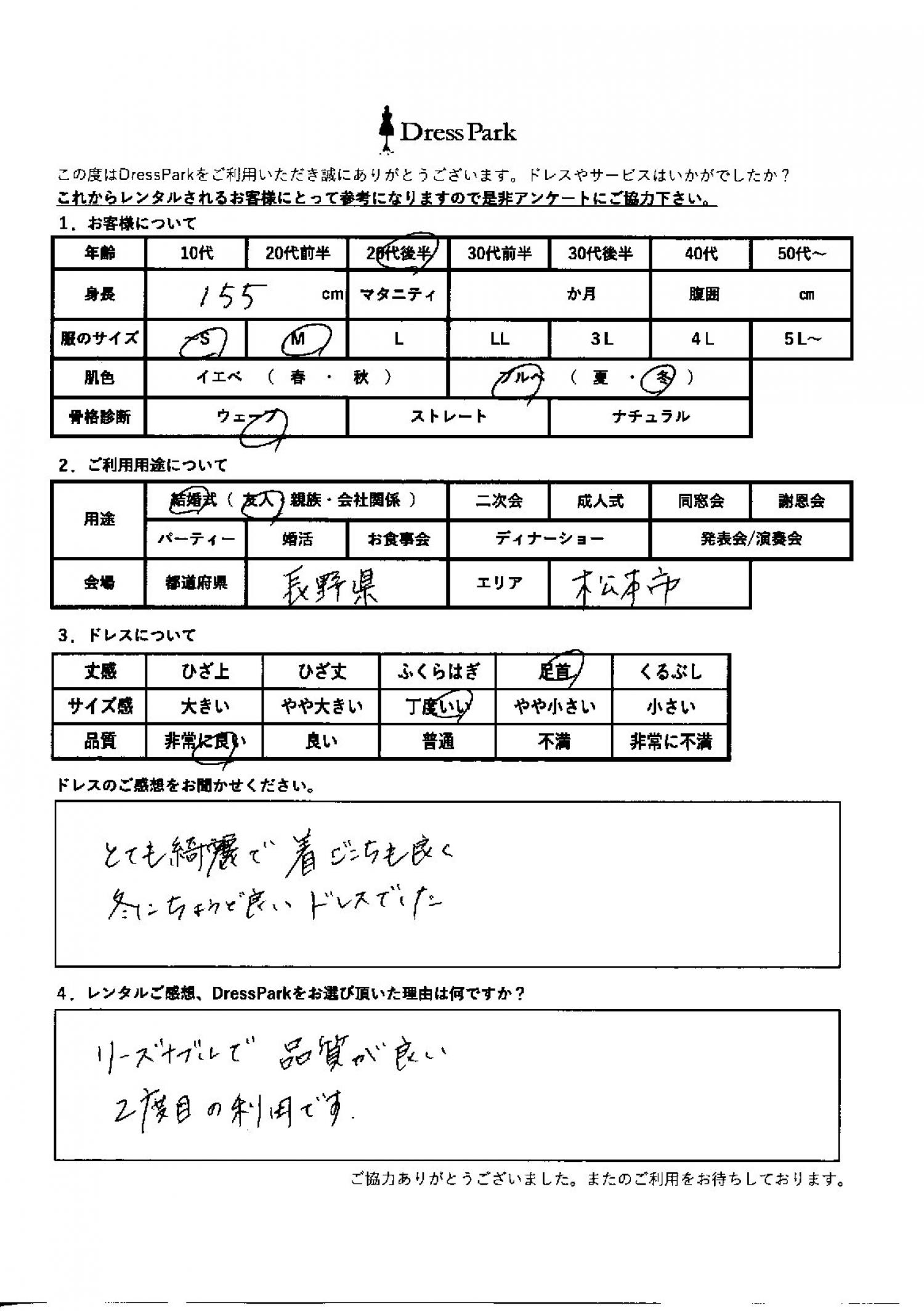 長野県 S.N様155㎝ ~Sサイズ #20代#SS/S#155~159㎝#結婚式(友人)#長野県 ◆レンタルしたドレスはこちら ◆レンタルしたサイズは:S ◆レンタルした日付:2026/01/27 ドレスの着用感 ◆点数: (5点) ◆丈感:足首 ◆サイズ感:丁度いい ◆品質:非常に良い ◆肌色:ブルべ ◆骨格診断:ウェーブ ドレスの感想 とても綺麗で、着心地も良く、冬にちょうど良いドレスでした。 レンタルのご感想、DressParkをお選び頂いた理由 リーズナブルで品質が良い。2度目の利用です。 CUSTOMER REVIEWS お客様の声 気になるカテゴリー別にご利用の感想をチェック! ◆AGE 年代で見る 10代 20代 30代 40代 50代~ ◆SIZE サイズで見る SS/S M/L 大きいサイズLL~ ◆HIGHT 身長で見る 140~149㎝ 150~154㎝ 155~159㎝ 160~164㎝ 165~169㎝ 170㎝以上 ◆マタニティ ~3か月 4~6か月 7~8か月 9~10か月 ◆肌色 イエベ ブルべ ◆骨格診断 ウェーブ ストレート ナチュラル ◆利用シーン 結婚式(友人) 結婚式(親族) 結婚式(会社関係) 二次会 成人式/同窓会 謝恩会 パーティー その他 CUSTOMER REVIEWS都道府県別お客様の声 都道府県別にのお客様の声をチェック! 北海道 青森県 岩手県 宮城県 秋田県 山形県 福島県 茨城県 栃木県 群馬県 埼玉県 千葉県 東京都 神奈川県 新潟県 富山県 石川県 福井県 山梨県 長野県 岐阜県 静岡県 愛知県 三重県 滋賀県 京都府 大阪府 兵庫県 奈良県 和歌山県 鳥取県 島根県 岡山県 広島県 山口県 徳島県 香川県 愛媛県 高知県 福岡県 佐賀県 長崎県 熊本県 大分県 宮崎県 鹿児島県 沖縄県 CUSTOMER REVIEWSエリア別お客様の声 都道府県別にのお客様の声をチェック! 札幌 仙台 名古屋 軽井沢 金沢 神戸・芦屋 博多 那覇 梅田・新大阪 難波・心斎橋 鎌倉・湘南 横浜・みなとみらい 舞浜・浦安・幕張 大宮・浦和 青山・表参道 六本木・麻布 渋谷・恵比寿 新宿 池袋 銀座・丸の内 お台場・汐留 鹿児島市 郡山市 福島市 東予 甲府・石和 LINEでお問い合わせ このサイトではJavaScriptを使用しています