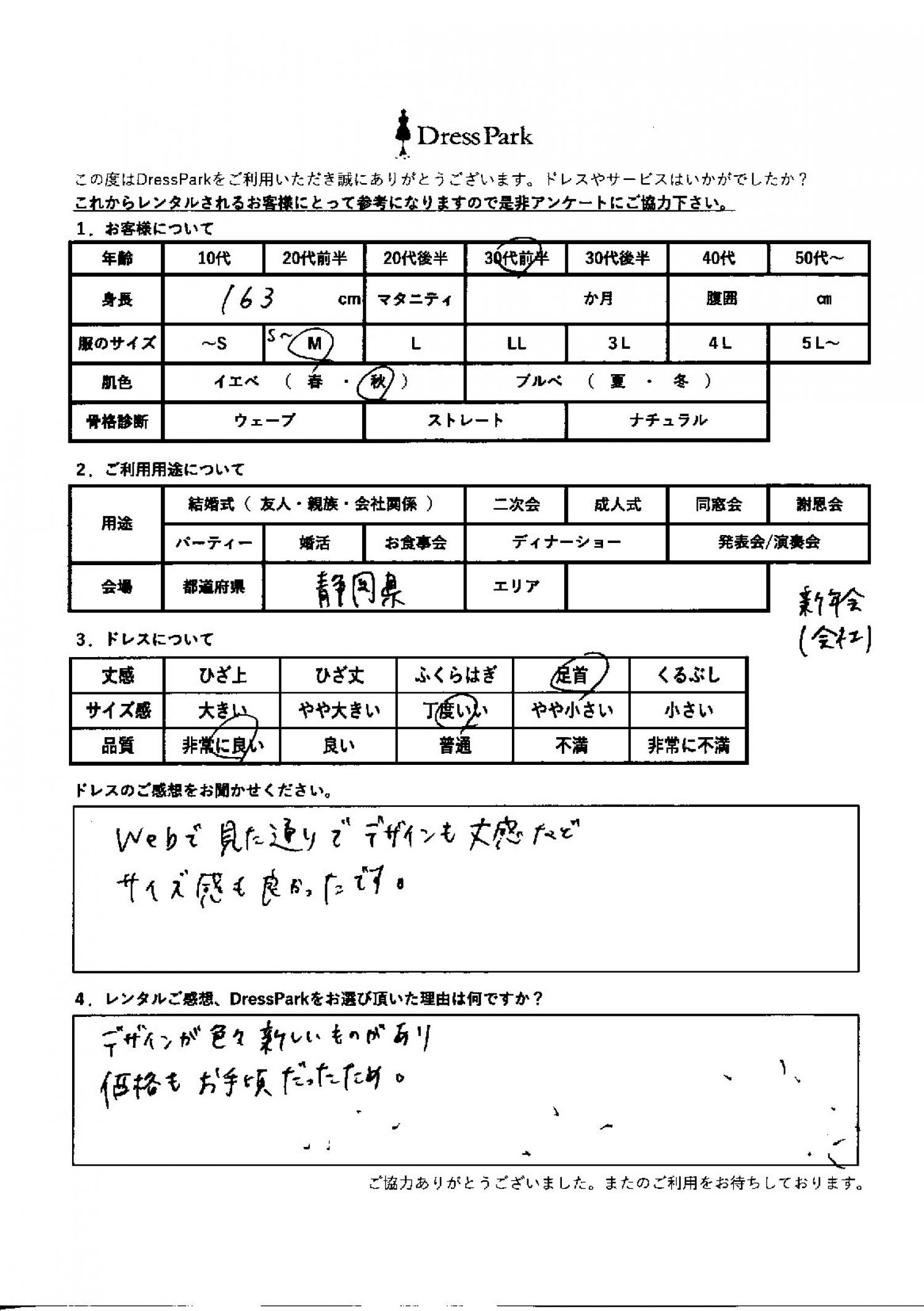 静岡県 Y.T様163㎝ Mサイズ #30代#M/L#160~164㎝#パーティー#静岡県 ◆レンタルしたドレスはこちら ◆レンタルしたサイズは:M ◆レンタルした日付:2026/01/28 ドレスの着用感 ◆点数: (5点) ◆丈感:足首 ◆サイズ感:丁度いい ◆品質:非常に良い ◆肌色:イエベ ドレスの感想 ウェブで見た通りで、デザインも丈感などサイズ感も良かったです。 レンタルのご感想、DressParkをお選び頂いた理由 デザインがいろいろ新しいものがあり、価格も手頃だったため。 CUSTOMER REVIEWS お客様の声 気になるカテゴリー別にご利用の感想をチェック! ◆AGE 年代で見る 10代 20代 30代 40代 50代~ ◆SIZE サイズで見る SS/S M/L 大きいサイズLL~ ◆HIGHT 身長で見る 140~149㎝ 150~154㎝ 155~159㎝ 160~164㎝ 165~169㎝ 170㎝以上 ◆マタニティ ~3か月 4~6か月 7~8か月 9~10か月 ◆肌色 イエベ ブルべ ◆骨格診断 ウェーブ ストレート ナチュラル ◆利用シーン 結婚式(友人) 結婚式(親族) 結婚式(会社関係) 二次会 成人式/同窓会 謝恩会 パーティー その他 CUSTOMER REVIEWS都道府県別お客様の声 都道府県別にのお客様の声をチェック! 北海道 青森県 岩手県 宮城県 秋田県 山形県 福島県 茨城県 栃木県 群馬県 埼玉県 千葉県 東京都 神奈川県 新潟県 富山県 石川県 福井県 山梨県 長野県 岐阜県 静岡県 愛知県 三重県 滋賀県 京都府 大阪府 兵庫県 奈良県 和歌山県 鳥取県 島根県 岡山県 広島県 山口県 徳島県 香川県 愛媛県 高知県 福岡県 佐賀県 長崎県 熊本県 大分県 宮崎県 鹿児島県 沖縄県 CUSTOMER REVIEWSエリア別お客様の声 都道府県別にのお客様の声をチェック! 札幌 仙台 名古屋 軽井沢 金沢 神戸・芦屋 博多 那覇 梅田・新大阪 難波・心斎橋 鎌倉・湘南 横浜・みなとみらい 舞浜・浦安・幕張 大宮・浦和 青山・表参道 六本木・麻布 渋谷・恵比寿 新宿 池袋 銀座・丸の内 お台場・汐留 鹿児島市 郡山市 福島市 東予 甲府・石和 LINEでお問い合わせ このサイトではJavaScriptを使用しています