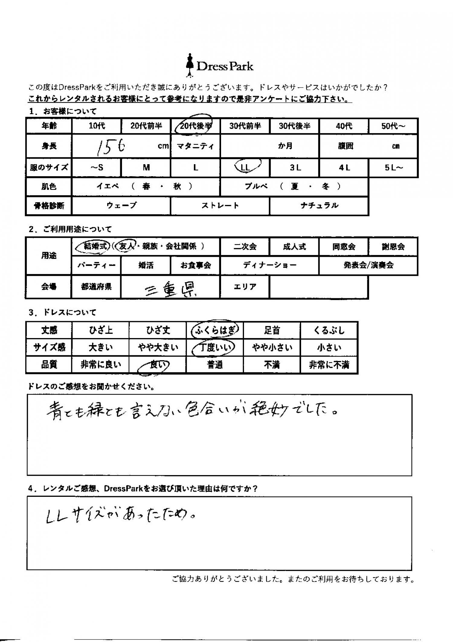 三重県 S.H様156㎝ LLサイズ #20代#大きいサイズLL~#155~159㎝#結婚式(友人)#三重県 ◆レンタルしたドレスはこちら ◆レンタルしたサイズは:LL ◆レンタルした日付:2026/01/30 ドレスの着用感 ◆点数: (4点) ◆丈感:ふくらはぎ ◆サイズ感:丁度いい ◆品質:良い ドレスの感想 青と緑とも言えない色合いが絶妙でした。 レンタルのご感想、DressParkをお選び頂いた理由 LLサイズがあったため。 CUSTOMER REVIEWS お客様の声 気になるカテゴリー別にご利用の感想をチェック! ◆AGE 年代で見る 10代 20代 30代 40代 50代~ ◆SIZE サイズで見る SS/S M/L 大きいサイズLL~ ◆HIGHT 身長で見る 140~149㎝ 150~154㎝ 155~159㎝ 160~164㎝ 165~169㎝ 170㎝以上 ◆マタニティ ~3か月 4~6か月 7~8か月 9~10か月 ◆肌色 イエベ ブルべ ◆骨格診断 ウェーブ ストレート ナチュラル ◆利用シーン 結婚式(友人) 結婚式(親族) 結婚式(会社関係) 二次会 成人式/同窓会 謝恩会 パーティー その他 CUSTOMER REVIEWS都道府県別お客様の声 都道府県別にのお客様の声をチェック! 北海道 青森県 岩手県 宮城県 秋田県 山形県 福島県 茨城県 栃木県 群馬県 埼玉県 千葉県 東京都 神奈川県 新潟県 富山県 石川県 福井県 山梨県 長野県 岐阜県 静岡県 愛知県 三重県 滋賀県 京都府 大阪府 兵庫県 奈良県 和歌山県 鳥取県 島根県 岡山県 広島県 山口県 徳島県 香川県 愛媛県 高知県 福岡県 佐賀県 長崎県 熊本県 大分県 宮崎県 鹿児島県 沖縄県 CUSTOMER REVIEWSエリア別お客様の声 都道府県別にのお客様の声をチェック! 札幌 仙台 名古屋 軽井沢 金沢 神戸・芦屋 博多 那覇 梅田・新大阪 難波・心斎橋 鎌倉・湘南 横浜・みなとみらい 舞浜・浦安・幕張 大宮・浦和 青山・表参道 六本木・麻布 渋谷・恵比寿 新宿 池袋 銀座・丸の内 お台場・汐留 鹿児島市 郡山市 福島市 東予 甲府・石和 LINEでお問い合わせ このサイトではJavaScriptを使用しています