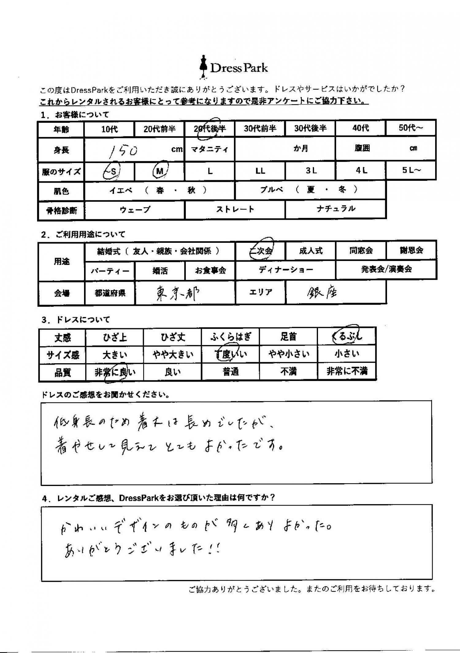 東京都 I.K様150㎝ Mサイズ銀座・丸の内 #20代#SS/S#150~154㎝#二次会#東京都#銀座・丸の内 ◆レンタルしたドレスはこちら ◆レンタルしたサイズは:M ◆レンタルした日付:2026/01/31 ドレスの着用感 ◆点数: (5点) ◆丈感:くるぶし ◆サイズ感:丁度いい ◆品質:非常に良い ドレスの感想 低身長のため着丈は長めでしたが、着痩せして見えてとても良かったです。 レンタルのご感想、DressParkをお選び頂いた理由 かわいいデザインのものが多くあり、よかった。ありがとうございました! CUSTOMER REVIEWS お客様の声 気になるカテゴリー別にご利用の感想をチェック! ◆AGE 年代で見る 10代 20代 30代 40代 50代~ ◆SIZE サイズで見る SS/S M/L 大きいサイズLL~ ◆HIGHT 身長で見る 140~149㎝ 150~154㎝ 155~159㎝ 160~164㎝ 165~169㎝ 170㎝以上 ◆マタニティ ~3か月 4~6か月 7~8か月 9~10か月 ◆肌色 イエベ ブルべ ◆骨格診断 ウェーブ ストレート ナチュラル ◆利用シーン 結婚式(友人) 結婚式(親族) 結婚式(会社関係) 二次会 成人式/同窓会 謝恩会 パーティー その他 CUSTOMER REVIEWS都道府県別お客様の声 都道府県別にのお客様の声をチェック! 北海道 青森県 岩手県 宮城県 秋田県 山形県 福島県 茨城県 栃木県 群馬県 埼玉県 千葉県 東京都 神奈川県 新潟県 富山県 石川県 福井県 山梨県 長野県 岐阜県 静岡県 愛知県 三重県 滋賀県 京都府 大阪府 兵庫県 奈良県 和歌山県 鳥取県 島根県 岡山県 広島県 山口県 徳島県 香川県 愛媛県 高知県 福岡県 佐賀県 長崎県 熊本県 大分県 宮崎県 鹿児島県 沖縄県 CUSTOMER REVIEWSエリア別お客様の声 都道府県別にのお客様の声をチェック! 札幌 仙台 名古屋 軽井沢 金沢 神戸・芦屋 博多 那覇 梅田・新大阪 難波・心斎橋 鎌倉・湘南 横浜・みなとみらい 舞浜・浦安・幕張 大宮・浦和 青山・表参道 六本木・麻布 渋谷・恵比寿 新宿 池袋 銀座・丸の内 お台場・汐留 鹿児島市 郡山市 福島市 東予 甲府・石和 LINEでお問い合わせ このサイトではJavaScriptを使用しています