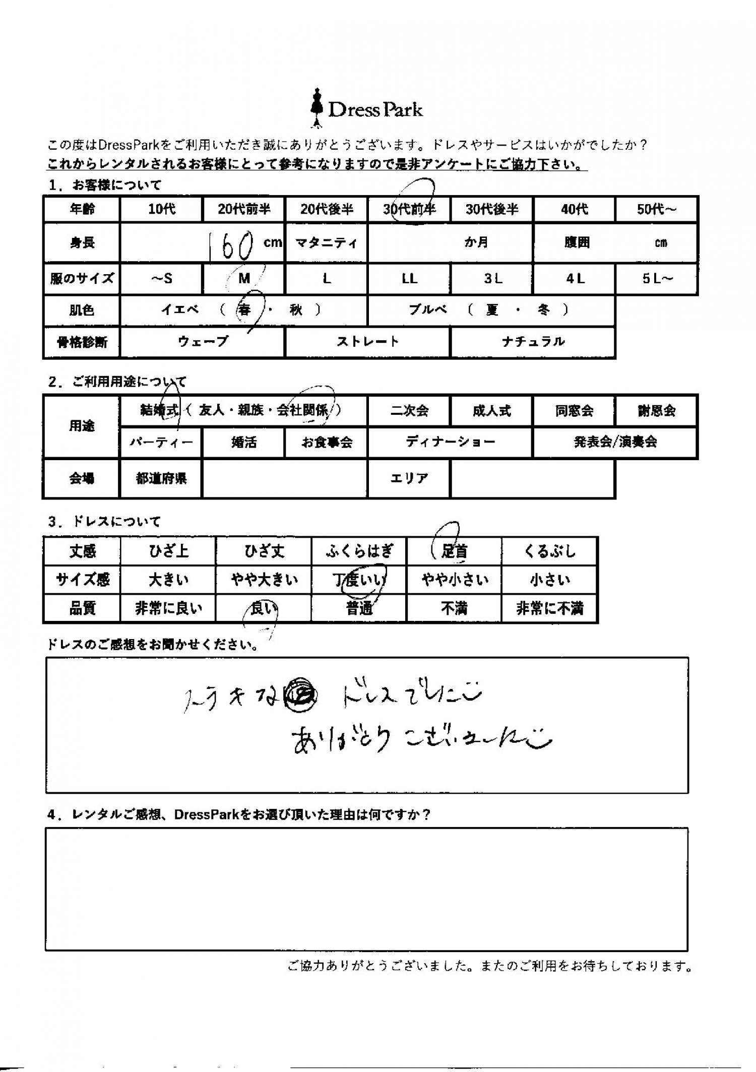 京都府 M.T様160㎝ Mサイズ #30代#M/L#160~164㎝#結婚式(会社関係)#京都府 ◆レンタルしたドレスはこちら ◆レンタルしたサイズは:M ◆レンタルした日付:2026/02/01 ドレスの着用感 ◆点数: (4点) ◆丈感:足首 ◆サイズ感:丁度いい ◆品質:良い ◆肌色:イエベ ドレスの感想 素敵なドレスでした。ありがとうございました。 CUSTOMER REVIEWS お客様の声 気になるカテゴリー別にご利用の感想をチェック! ◆AGE 年代で見る 10代 20代 30代 40代 50代~ ◆SIZE サイズで見る SS/S M/L 大きいサイズLL~ ◆HIGHT 身長で見る 140~149㎝ 150~154㎝ 155~159㎝ 160~164㎝ 165~169㎝ 170㎝以上 ◆マタニティ ~3か月 4~6か月 7~8か月 9~10か月 ◆肌色 イエベ ブルべ ◆骨格診断 ウェーブ ストレート ナチュラル ◆利用シーン 結婚式(友人) 結婚式(親族) 結婚式(会社関係) 二次会 成人式/同窓会 謝恩会 パーティー その他 CUSTOMER REVIEWS都道府県別お客様の声 都道府県別にのお客様の声をチェック! 北海道 青森県 岩手県 宮城県 秋田県 山形県 福島県 茨城県 栃木県 群馬県 埼玉県 千葉県 東京都 神奈川県 新潟県 富山県 石川県 福井県 山梨県 長野県 岐阜県 静岡県 愛知県 三重県 滋賀県 京都府 大阪府 兵庫県 奈良県 和歌山県 鳥取県 島根県 岡山県 広島県 山口県 徳島県 香川県 愛媛県 高知県 福岡県 佐賀県 長崎県 熊本県 大分県 宮崎県 鹿児島県 沖縄県 CUSTOMER REVIEWSエリア別お客様の声 都道府県別にのお客様の声をチェック! 札幌 仙台 名古屋 軽井沢 金沢 神戸・芦屋 博多 那覇 梅田・新大阪 難波・心斎橋 鎌倉・湘南 横浜・みなとみらい 舞浜・浦安・幕張 大宮・浦和 青山・表参道 六本木・麻布 渋谷・恵比寿 新宿 池袋 銀座・丸の内 お台場・汐留 鹿児島市 郡山市 福島市 東予 甲府・石和 LINEでお問い合わせ このサイトではJavaScriptを使用しています