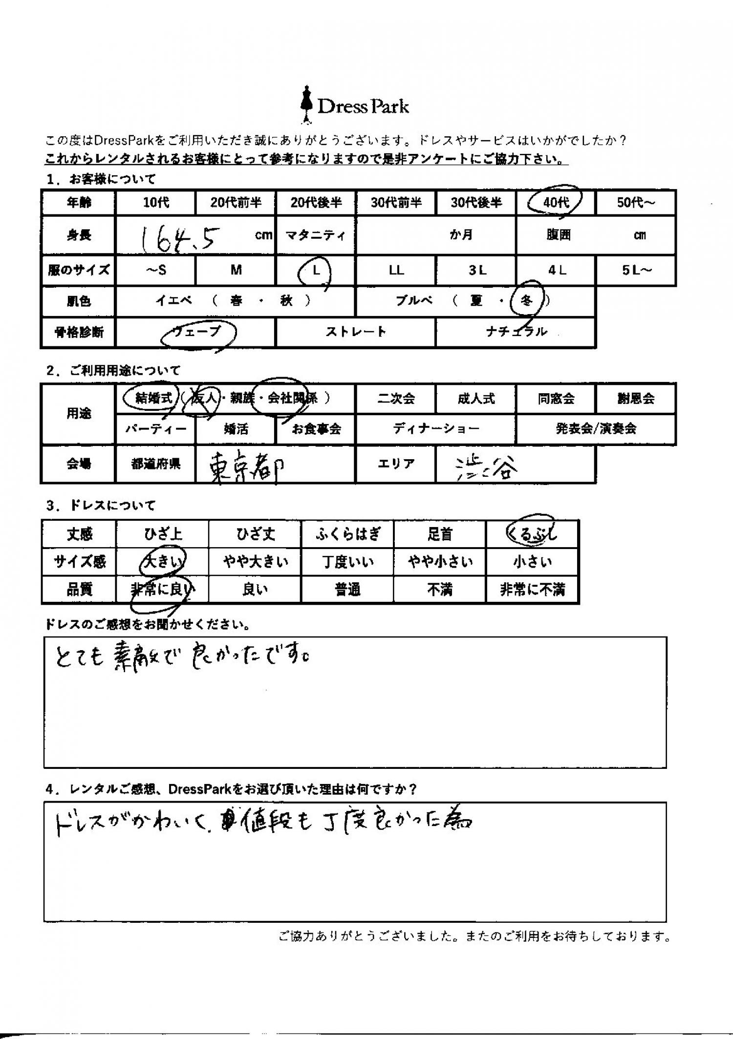 東京都 M.W様164㎝ Lサイズ渋谷・恵比寿 #40代#M/L#160~164㎝#結婚式(会社関係)#東京都#渋谷・恵比寿 ◆レンタルしたドレスはこちら ◆レンタルしたサイズは:L ◆レンタルした日付:2026/02/07 ドレスの着用感 ◆点数: (5点) ◆丈感:くるぶし ◆サイズ感:大きい ◆品質:非常に良い ◆肌色:ブルべ ◆骨格診断:ウェーブ ドレスの感想 とても素敵でよかったです。 レンタルのご感想、DressParkをお選び頂いた理由 ドレスが可愛く値段もちょうど良かったため。 CUSTOMER REVIEWS お客様の声 気になるカテゴリー別にご利用の感想をチェック! ◆AGE 年代で見る 10代 20代 30代 40代 50代~ ◆SIZE サイズで見る SS/S M/L 大きいサイズLL~ ◆HIGHT 身長で見る 140~149㎝ 150~154㎝ 155~159㎝ 160~164㎝ 165~169㎝ 170㎝以上 ◆マタニティ ~3か月 4~6か月 7~8か月 9~10か月 ◆肌色 イエベ ブルべ ◆骨格診断 ウェーブ ストレート ナチュラル ◆利用シーン 結婚式(友人) 結婚式(親族) 結婚式(会社関係) 二次会 成人式/同窓会 謝恩会 パーティー その他 CUSTOMER REVIEWS都道府県別お客様の声 都道府県別にのお客様の声をチェック! 北海道 青森県 岩手県 宮城県 秋田県 山形県 福島県 茨城県 栃木県 群馬県 埼玉県 千葉県 東京都 神奈川県 新潟県 富山県 石川県 福井県 山梨県 長野県 岐阜県 静岡県 愛知県 三重県 滋賀県 京都府 大阪府 兵庫県 奈良県 和歌山県 鳥取県 島根県 岡山県 広島県 山口県 徳島県 香川県 愛媛県 高知県 福岡県 佐賀県 長崎県 熊本県 大分県 宮崎県 鹿児島県 沖縄県 CUSTOMER REVIEWSエリア別お客様の声 都道府県別にのお客様の声をチェック! 札幌 仙台 名古屋 軽井沢 金沢 神戸・芦屋 博多 那覇 梅田・新大阪 難波・心斎橋 鎌倉・湘南 横浜・みなとみらい 舞浜・浦安・幕張 大宮・浦和 青山・表参道 六本木・麻布 渋谷・恵比寿 新宿 池袋 銀座・丸の内 お台場・汐留 鹿児島市 郡山市 福島市 東予 甲府・石和 LINEでお問い合わせ このサイトではJavaScriptを使用しています