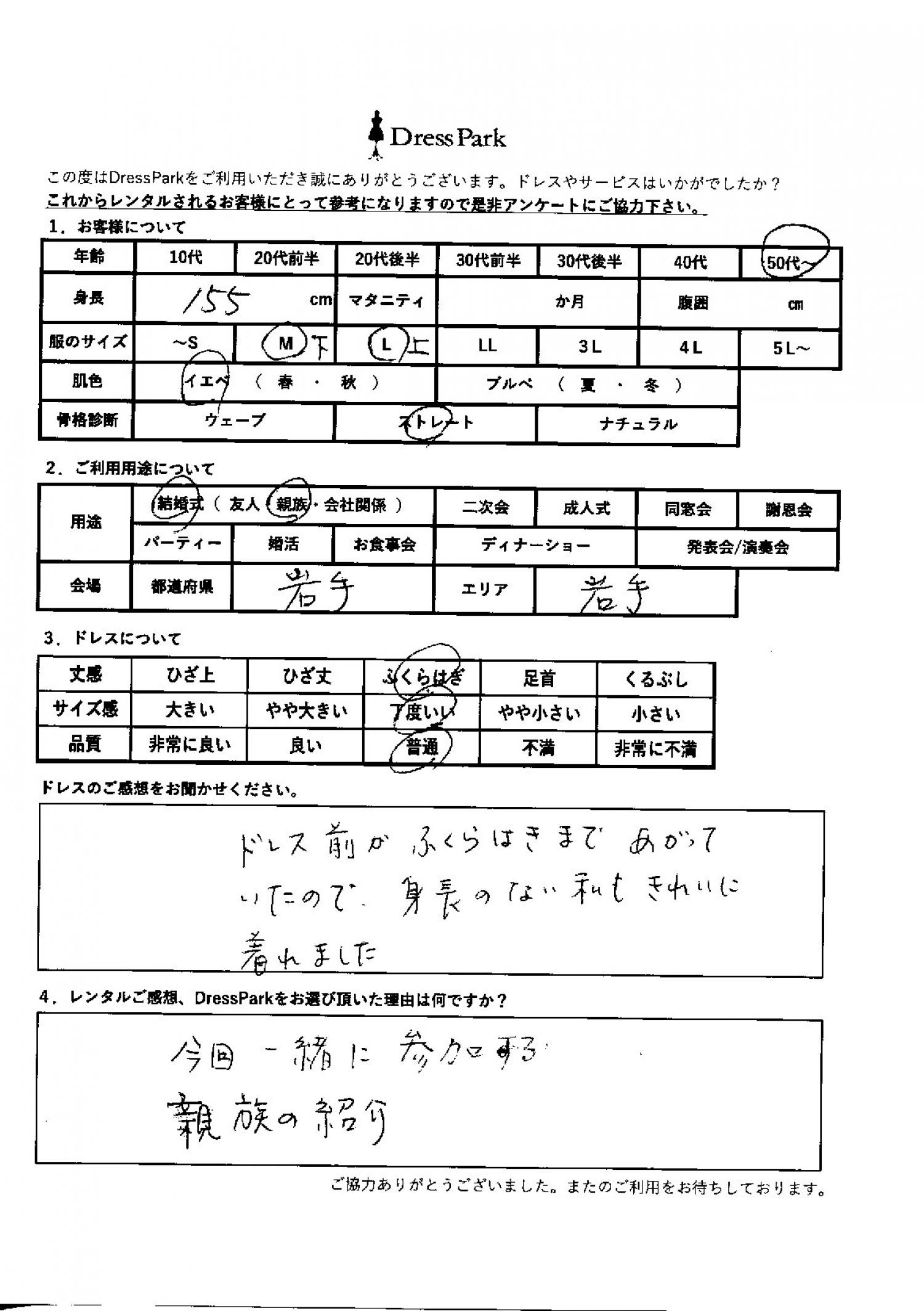 岩手県 K.I様155㎝ Mサイズ #50代~#M/L#155~159㎝#結婚式(親族)#岩手県 ◆レンタルしたドレスはこちら ◆レンタルしたサイズは:M ◆レンタルした日付:2026/02/07 ドレスの着用感 ◆点数: (4点) ◆丈感:ふくらはぎ ◆サイズ感:丁度いい ◆品質:普通 ◆肌色:イエベ ◆骨格診断:ストレート ドレスの感想 ドレス前がふくらはぎまで上がっていたので、身長のない私もきれいに着られました。 レンタルのご感想、DressParkをお選び頂いた理由 今回一緒に参加する親族の紹介。 CUSTOMER REVIEWS お客様の声 気になるカテゴリー別にご利用の感想をチェック! ◆AGE 年代で見る 10代 20代 30代 40代 50代~ ◆SIZE サイズで見る SS/S M/L 大きいサイズLL~ ◆HIGHT 身長で見る 140~149㎝ 150~154㎝ 155~159㎝ 160~164㎝ 165~169㎝ 170㎝以上 ◆マタニティ ~3か月 4~6か月 7~8か月 9~10か月 ◆肌色 イエベ ブルべ ◆骨格診断 ウェーブ ストレート ナチュラル ◆利用シーン 結婚式(友人) 結婚式(親族) 結婚式(会社関係) 二次会 成人式/同窓会 謝恩会 パーティー その他 CUSTOMER REVIEWS都道府県別お客様の声 都道府県別にのお客様の声をチェック! 北海道 青森県 岩手県 宮城県 秋田県 山形県 福島県 茨城県 栃木県 群馬県 埼玉県 千葉県 東京都 神奈川県 新潟県 富山県 石川県 福井県 山梨県 長野県 岐阜県 静岡県 愛知県 三重県 滋賀県 京都府 大阪府 兵庫県 奈良県 和歌山県 鳥取県 島根県 岡山県 広島県 山口県 徳島県 香川県 愛媛県 高知県 福岡県 佐賀県 長崎県 熊本県 大分県 宮崎県 鹿児島県 沖縄県 CUSTOMER REVIEWSエリア別お客様の声 都道府県別にのお客様の声をチェック! 札幌 仙台 名古屋 軽井沢 金沢 神戸・芦屋 博多 那覇 梅田・新大阪 難波・心斎橋 鎌倉・湘南 横浜・みなとみらい 舞浜・浦安・幕張 大宮・浦和 青山・表参道 六本木・麻布 渋谷・恵比寿 新宿 池袋 銀座・丸の内 お台場・汐留 鹿児島市 郡山市 福島市 東予 甲府・石和 LINEでお問い合わせ このサイトではJavaScriptを使用しています