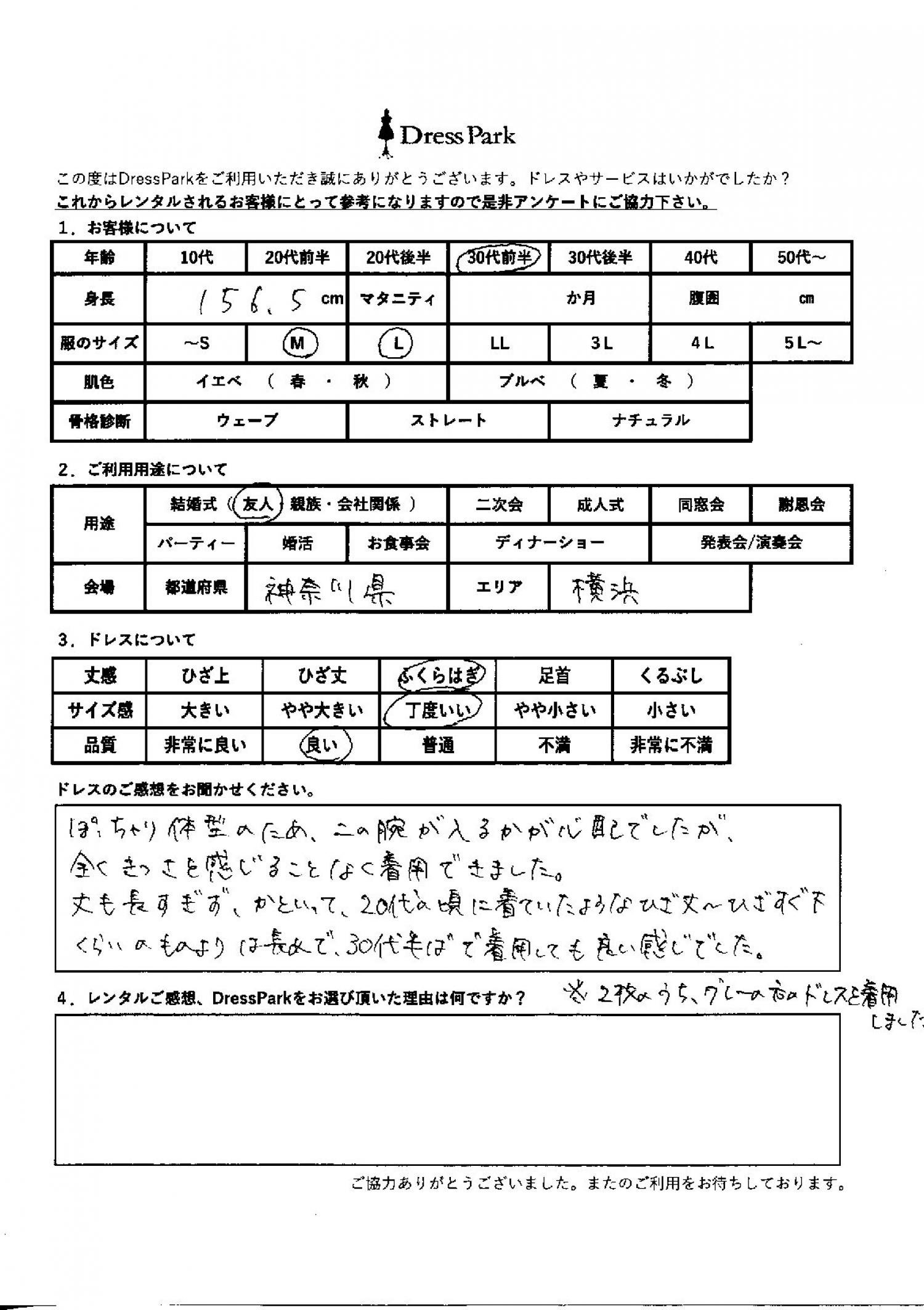 神奈川県 K.T様156㎝ Mサイズ横浜・みなとみらい #30代#M/L#155~159㎝#結婚式(友人)#神奈川県#横浜・みなとみらい ◆レンタルしたドレスはこちら ◆レンタルしたサイズは:M ◆レンタルした日付:2026/02/07 ドレスの着用感 ◆点数: (4点) ◆丈感:ふくらはぎ ◆サイズ感:丁度いい ◆品質:良い ドレスの感想 ぽっちゃり体型のため、二の腕が入るかが心配でしたが、全くきつさを感じることなく着用できました。丈も長すぎず、かといって20代の頃に着ていたような膝丈から膝すぐ下位のものよりは長めで、30代半ばで着用しても良い感じでした。 CUSTOMER REVIEWS お客様の声 気になるカテゴリー別にご利用の感想をチェック! ◆AGE 年代で見る 10代 20代 30代 40代 50代~ ◆SIZE サイズで見る SS/S M/L 大きいサイズLL~ ◆HIGHT 身長で見る 140~149㎝ 150~154㎝ 155~159㎝ 160~164㎝ 165~169㎝ 170㎝以上 ◆マタニティ ~3か月 4~6か月 7~8か月 9~10か月 ◆肌色 イエベ ブルべ ◆骨格診断 ウェーブ ストレート ナチュラル ◆利用シーン 結婚式(友人) 結婚式(親族) 結婚式(会社関係) 二次会 成人式/同窓会 謝恩会 パーティー その他 CUSTOMER REVIEWS都道府県別お客様の声 都道府県別にのお客様の声をチェック! 北海道 青森県 岩手県 宮城県 秋田県 山形県 福島県 茨城県 栃木県 群馬県 埼玉県 千葉県 東京都 神奈川県 新潟県 富山県 石川県 福井県 山梨県 長野県 岐阜県 静岡県 愛知県 三重県 滋賀県 京都府 大阪府 兵庫県 奈良県 和歌山県 鳥取県 島根県 岡山県 広島県 山口県 徳島県 香川県 愛媛県 高知県 福岡県 佐賀県 長崎県 熊本県 大分県 宮崎県 鹿児島県 沖縄県 CUSTOMER REVIEWSエリア別お客様の声 都道府県別にのお客様の声をチェック! 札幌 仙台 名古屋 軽井沢 金沢 神戸・芦屋 博多 那覇 梅田・新大阪 難波・心斎橋 鎌倉・湘南 横浜・みなとみらい 舞浜・浦安・幕張 大宮・浦和 青山・表参道 六本木・麻布 渋谷・恵比寿 新宿 池袋 銀座・丸の内 お台場・汐留 鹿児島市 郡山市 福島市 東予 甲府・石和 LINEでお問い合わせ このサイトではJavaScriptを使用しています