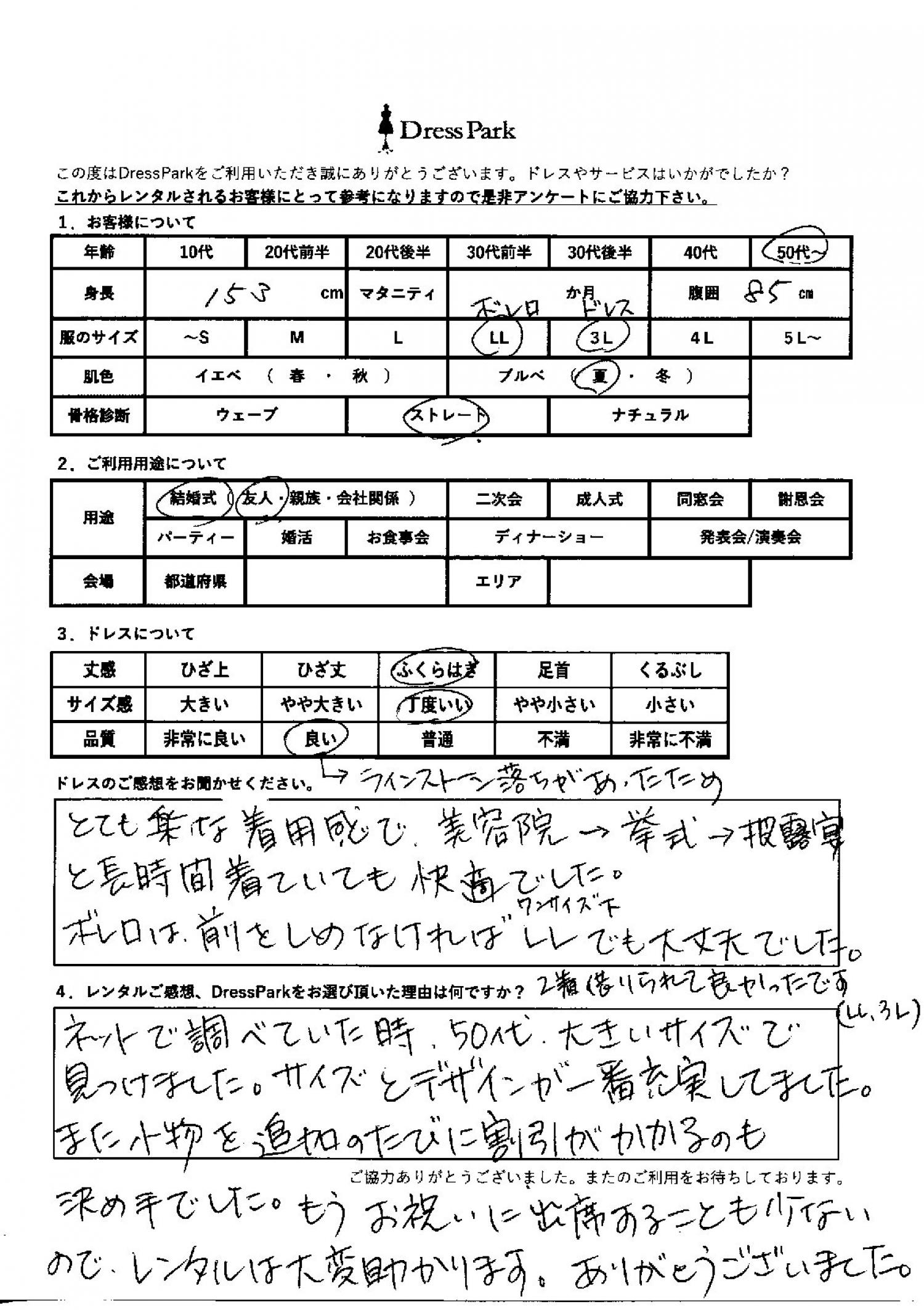 とても楽な着用感で美容院→挙式→披露宴と長時間着ていても快適でした。ボレロは前を締めなければLLでも大丈夫でした。2着借りられてよかったです。(LL、3L)レンタルのご感想、