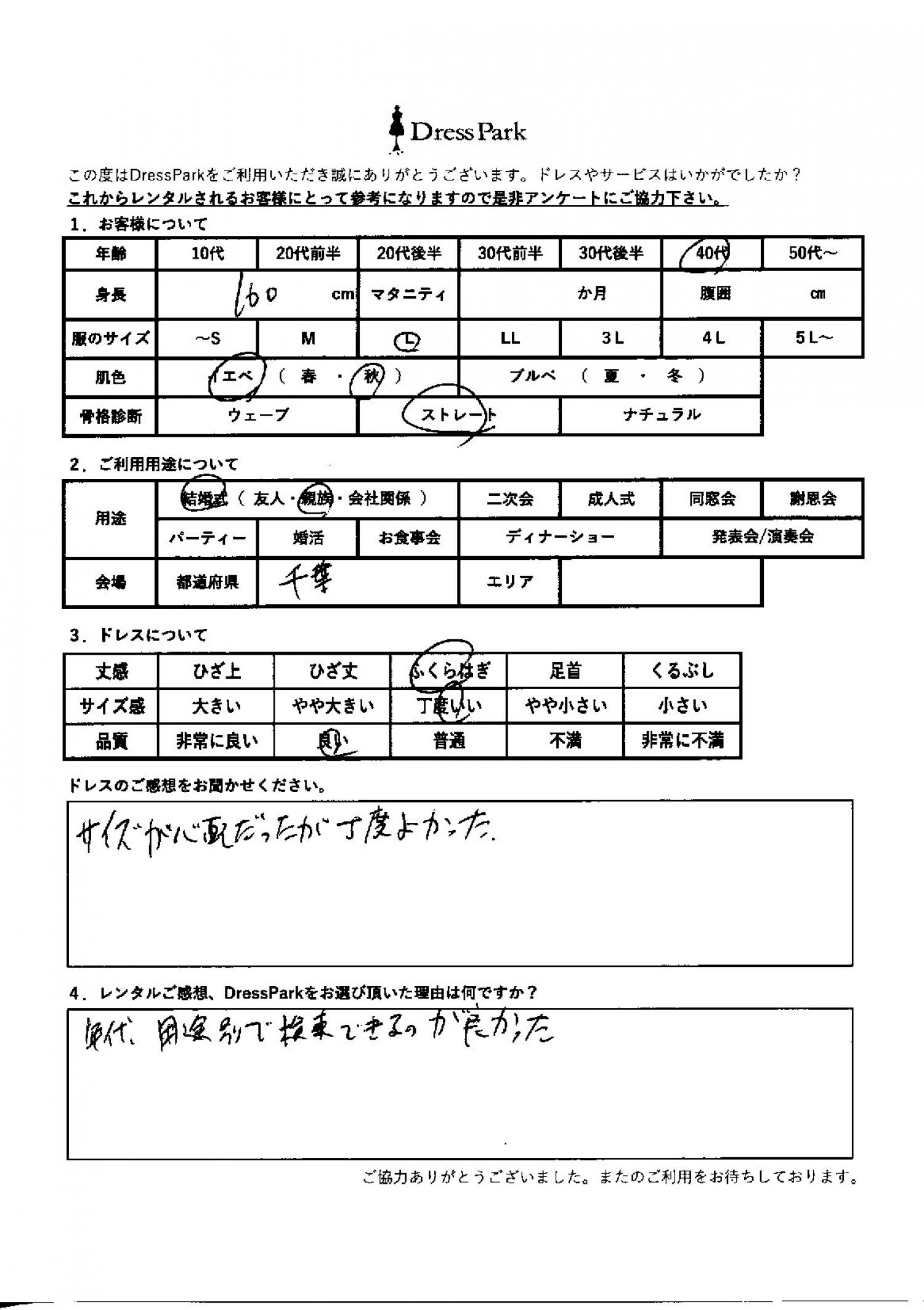 千葉県 C.T様160㎝ Lサイズ #40代#M/L#160~164㎝#結婚式(親族)#千葉県 ◆レンタルしたドレスはこちら ◆レンタルしたサイズは:L ◆レンタルした日付:2026/02/07 ドレスの着用感 ◆点数: (4点) ◆丈感:ふくらはぎ ◆サイズ感:丁度いい ◆品質:良い ◆肌色:イエベ ◆骨格診断:ストレート ドレスの感想 サイズが心配だったが、ちょうど良かった。 レンタルのご感想、DressParkをお選び頂いた理由 年代、用途別で検索できるのが良かった。 CUSTOMER REVIEWS お客様の声 気になるカテゴリー別にご利用の感想をチェック! ◆AGE 年代で見る 10代 20代 30代 40代 50代~ ◆SIZE サイズで見る SS/S M/L 大きいサイズLL~ ◆HIGHT 身長で見る 140~149㎝ 150~154㎝ 155~159㎝ 160~164㎝ 165~169㎝ 170㎝以上 ◆マタニティ ~3か月 4~6か月 7~8か月 9~10か月 ◆肌色 イエベ ブルべ ◆骨格診断 ウェーブ ストレート ナチュラル ◆利用シーン 結婚式(友人) 結婚式(親族) 結婚式(会社関係) 二次会 成人式/同窓会 謝恩会 パーティー その他 CUSTOMER REVIEWS都道府県別お客様の声 都道府県別にのお客様の声をチェック! 北海道 青森県 岩手県 宮城県 秋田県 山形県 福島県 茨城県 栃木県 群馬県 埼玉県 千葉県 東京都 神奈川県 新潟県 富山県 石川県 福井県 山梨県 長野県 岐阜県 静岡県 愛知県 三重県 滋賀県 京都府 大阪府 兵庫県 奈良県 和歌山県 鳥取県 島根県 岡山県 広島県 山口県 徳島県 香川県 愛媛県 高知県 福岡県 佐賀県 長崎県 熊本県 大分県 宮崎県 鹿児島県 沖縄県 CUSTOMER REVIEWSエリア別お客様の声 都道府県別にのお客様の声をチェック! 札幌 仙台 名古屋 軽井沢 金沢 神戸・芦屋 博多 那覇 梅田・新大阪 難波・心斎橋 鎌倉・湘南 横浜・みなとみらい 舞浜・浦安・幕張 大宮・浦和 青山・表参道 六本木・麻布 渋谷・恵比寿 新宿 池袋 銀座・丸の内 お台場・汐留 鹿児島市 郡山市 福島市 東予 甲府・石和 LINEでお問い合わせ このサイトではJavaScriptを使用しています